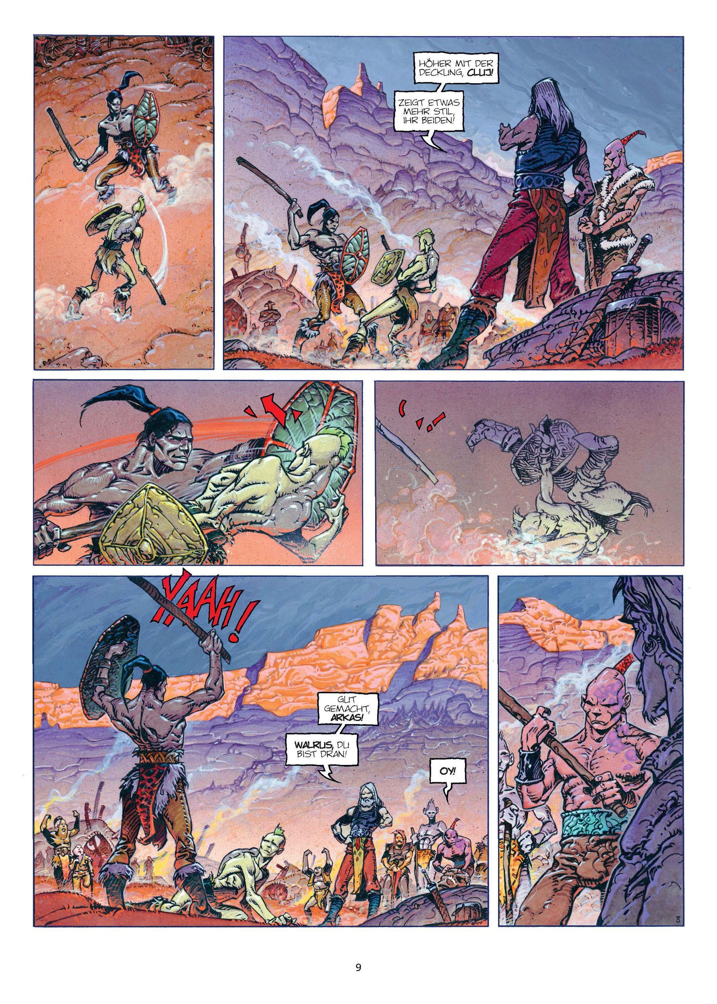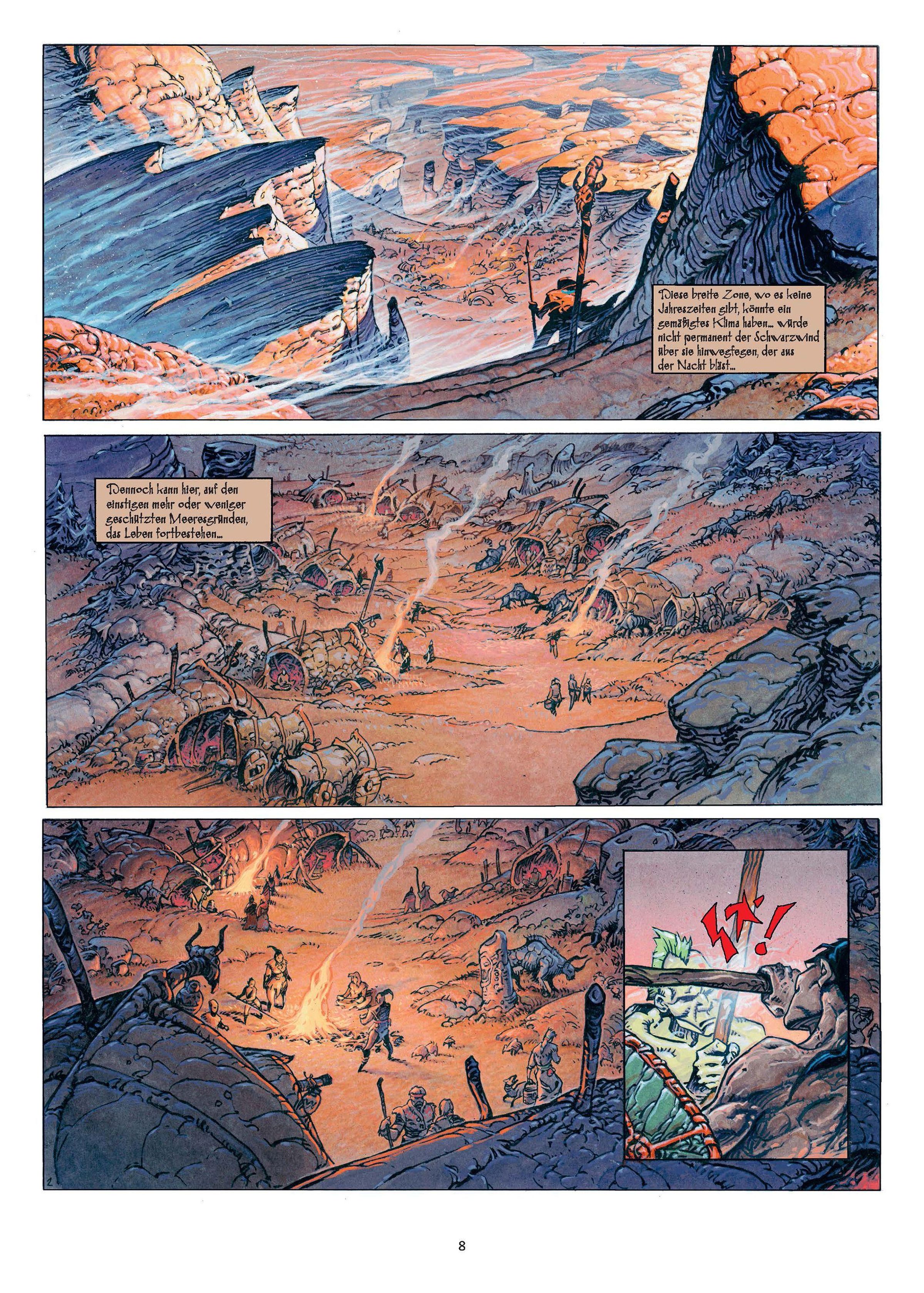 Vor 10.000 Jahren stoppte die Rotation der Erde um ihre Achse. Seither ist die verbliebene Menschheit dazu verdammt, vorwiegend in einem schmalen Randstreifen andauernder Dämmerung zu hausen, zwischen der eisigen Dunkelheit der Nacht- und der gnadenlosen Hitze der Tagseite. Manche jedoch, 'die Erwählten', leben in ewigem Müßiggang in der Kuppelstadt im Zentrum der Nacht, abgeschottet von den Gefahren der 'Großen Außenwelt' und behütet von Cyborgs, die als Götter verehrt werden: die Titanen. Einem von ihnen, Or-Fe, obliegt die Aufgabe, die Einwohner der Stadt mit seinen Visionen aus dem All zu versorgen. Bis er sich seiner Aufgabe verweigert und einfach verschwindet. Ohne seine Traumbilder verkümmern die Erwählten jedoch, und eine hektische Suche nach Or-Fe beginnt, in die auch Arkadi, der Bastard aus der Außenwelt, hineingezogen wird. Es folgt eine Jagd durch Feuer und Eis, in höchste Höhen und hinab in die tiefsten Abgründe der Erde. Denn dort lauert das Übel, das den Stillstand verursacht hat. Und wartet auf Erlösung. 'Die Welt von Arkadi' ist das Hauptwerk von Caza, einem der zentralen Künstler des legendären 'Métal Hurlant' und Meister visionärer Science-Fiction. Dieser Band umfasst alle zehn Alben der Serie. 20 Jahre Splitter Verlag - 20 Jahre Comics der Extraklasse: auf 1.000 Exemplare limitierte Sonderausgabe.