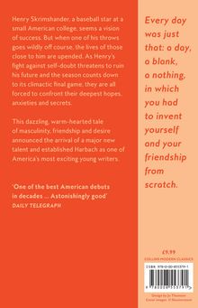 Henry Skrimshander, newly arrived at college, shy and out of his depth, has a talent for baseball that borders on genius. But sometimes it seems that his only friend is big Mike Schwartz - who champions the talents of others, at the expense of his own. And Owen, Henry's clever, charismatic, gay roommate, who has a secret that could put his brilliant college career in jeopardy.