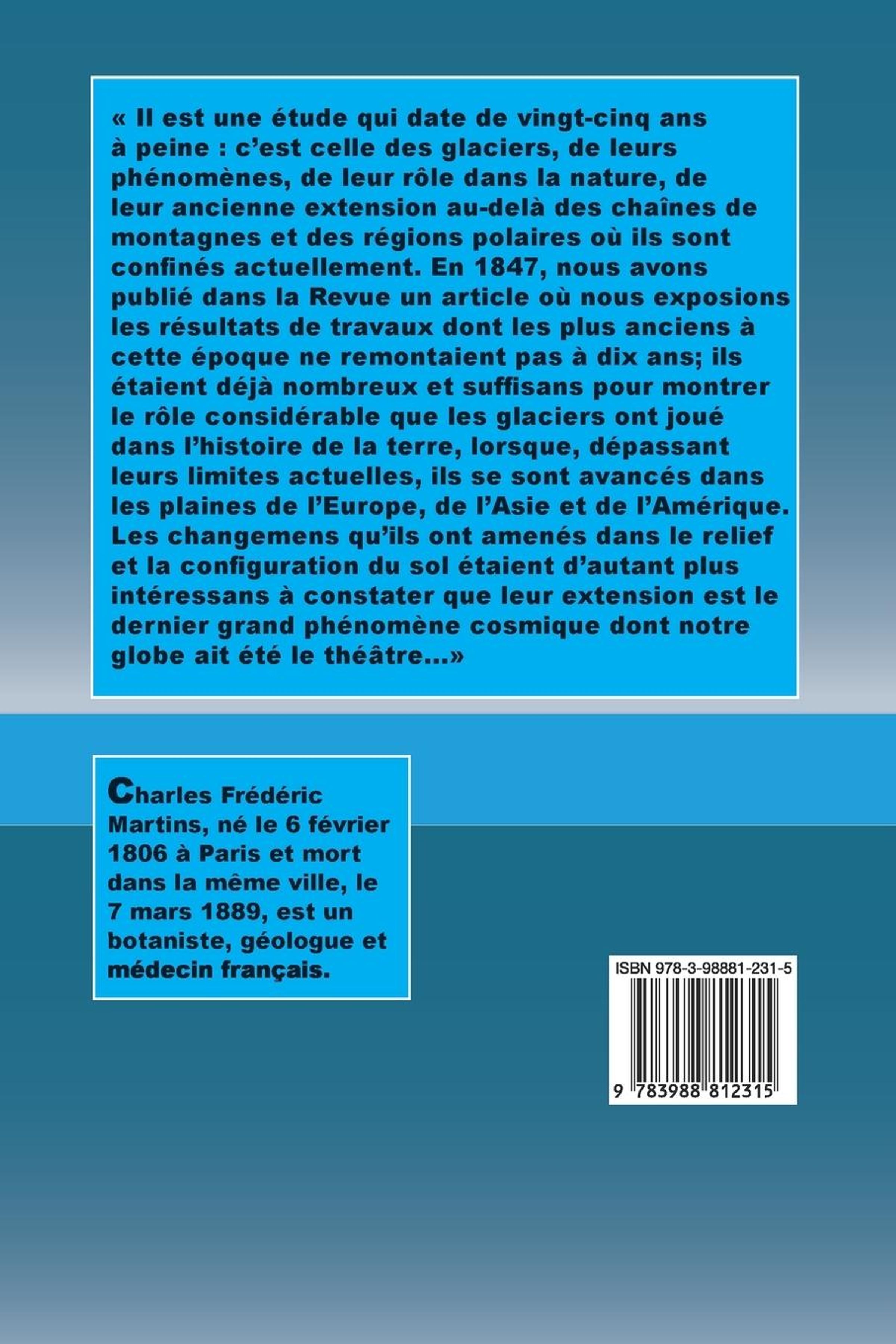 Il est une étude qui date de vingt-cinq ans à peine : c'est celle des glaciers, de leurs phénomènes, de leur rôle dans la nature, de leur ancienne extension au-delà des chaînes de montagnes et des régions polaires où ils sont confinés actuellement. En 1847, nous avons publié dans la Revue un article où nous exposions les résultats de travaux dont les plus anciens à cette époque ne remontaient pas à dix ans; ils étaient déjà nombreux et suffisans pour montrer le rôle considérable que les glaciers ont joué dans l'histoire de la terre, lorsque, dépassant leurs limites actuelles, ils se sont avancés dans les plaines de l'Europe, de l'Asie et de l'Amérique. Les changemens qu'ils ont amenés dans le relief et la configuration du sol étaient d'autant plus intéressans à constater que leur extension est le dernier grand phénomène cosmique dont notre globe ait été le théâtre...