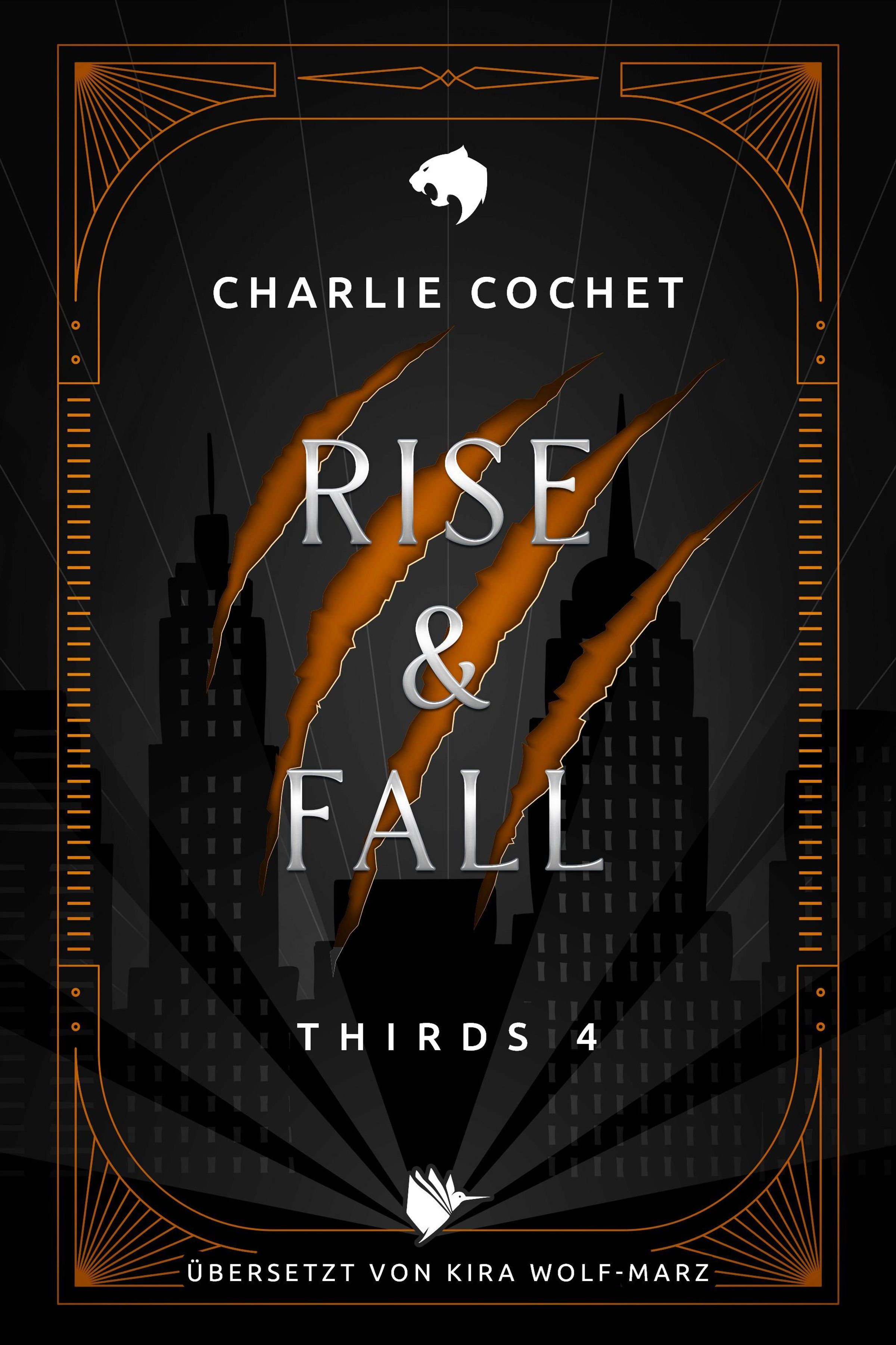 „Charlie Cochet: RISE & FALL, THIRDS 4, Übersetzt von Kira Wolf-Marz“. Silhouette von Gebäuden und Kratzspuren., Buch