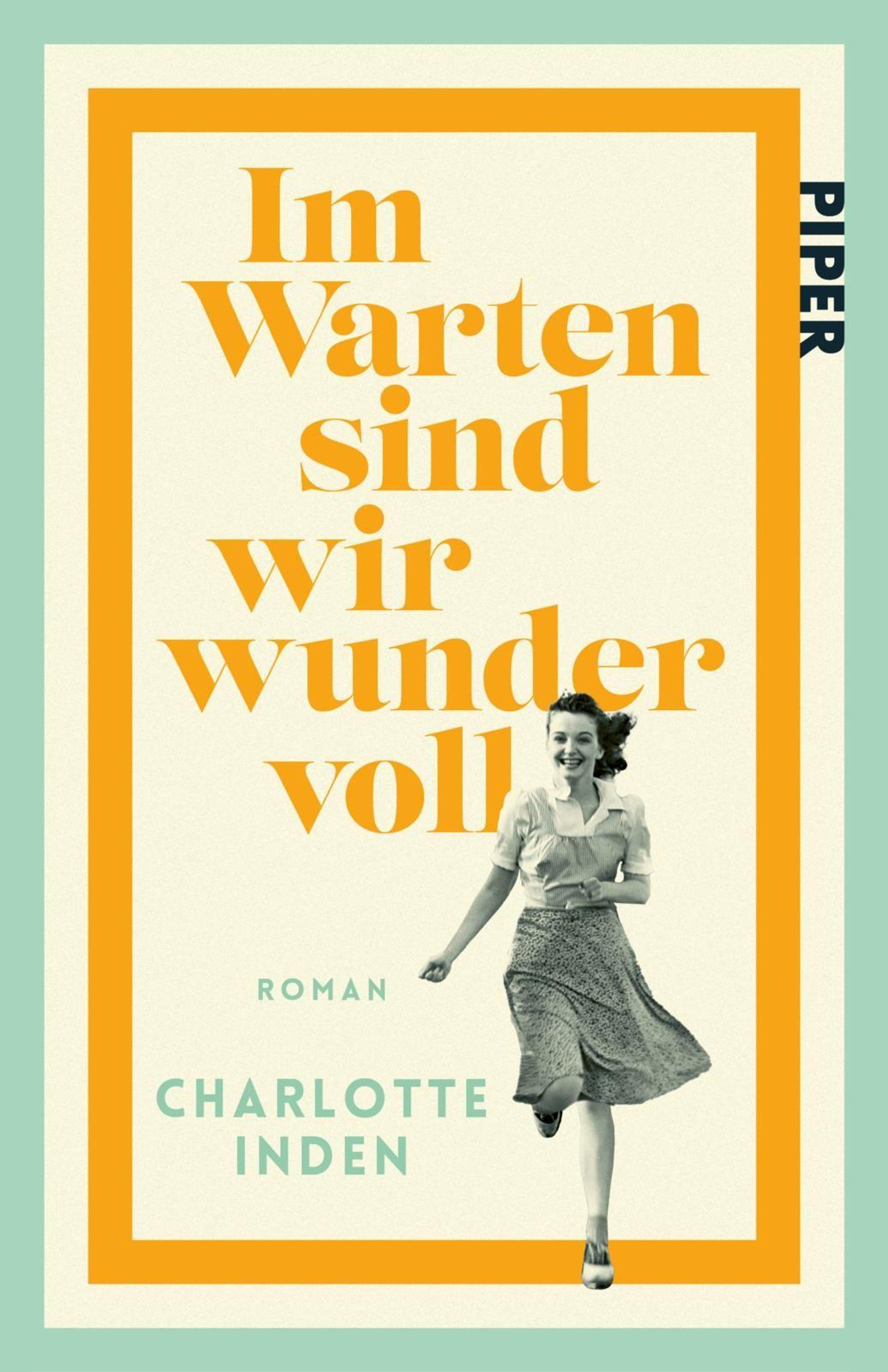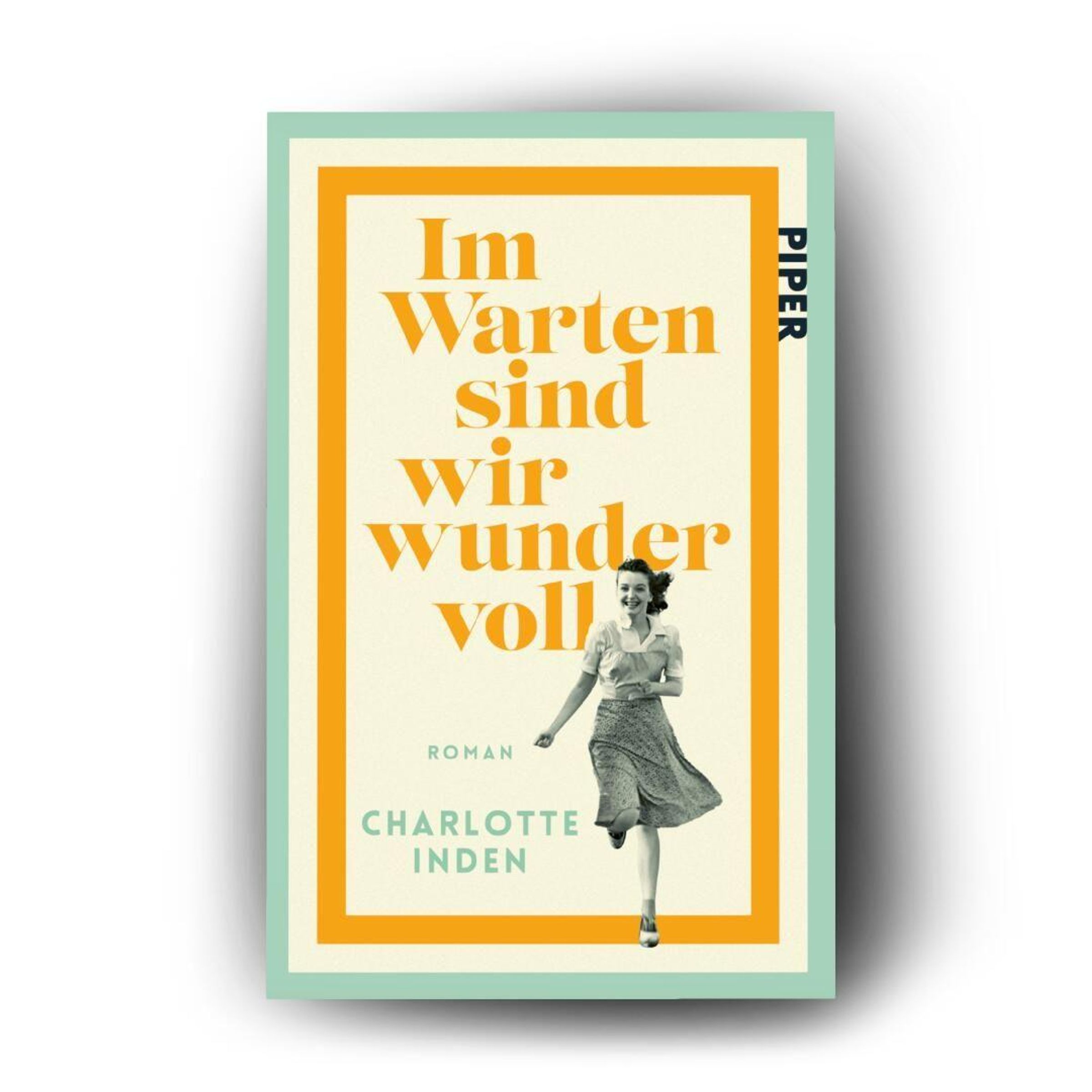 "Im Warten sind wir wundervoll", Roman von Charlotte Inden, darunter lächelt eine Frau im Rock., Buch