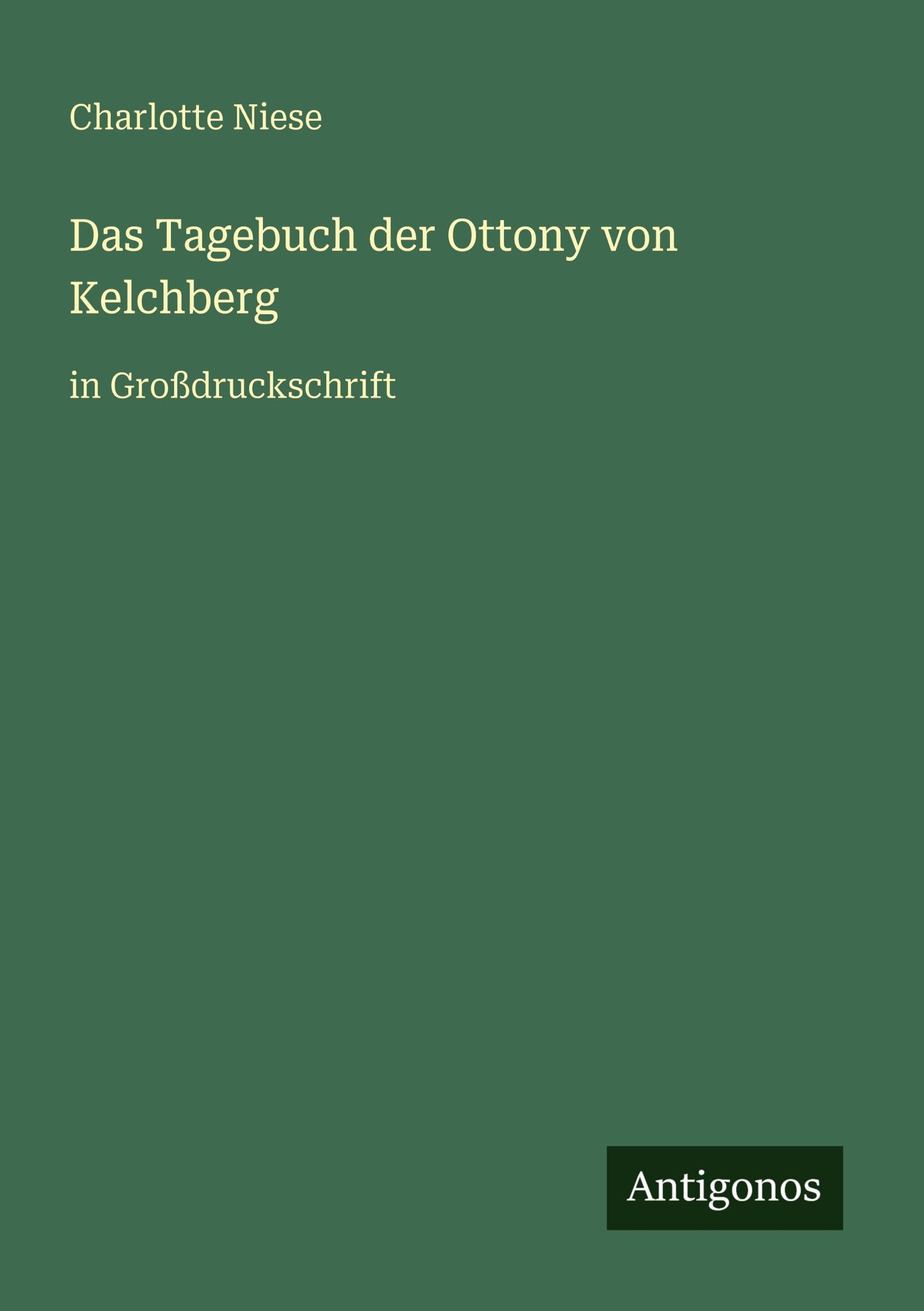 Text: "Charlotte Niese. Das Tagebuch der Ottony von Kelchberg in Großdruckschrift. Antigonos."