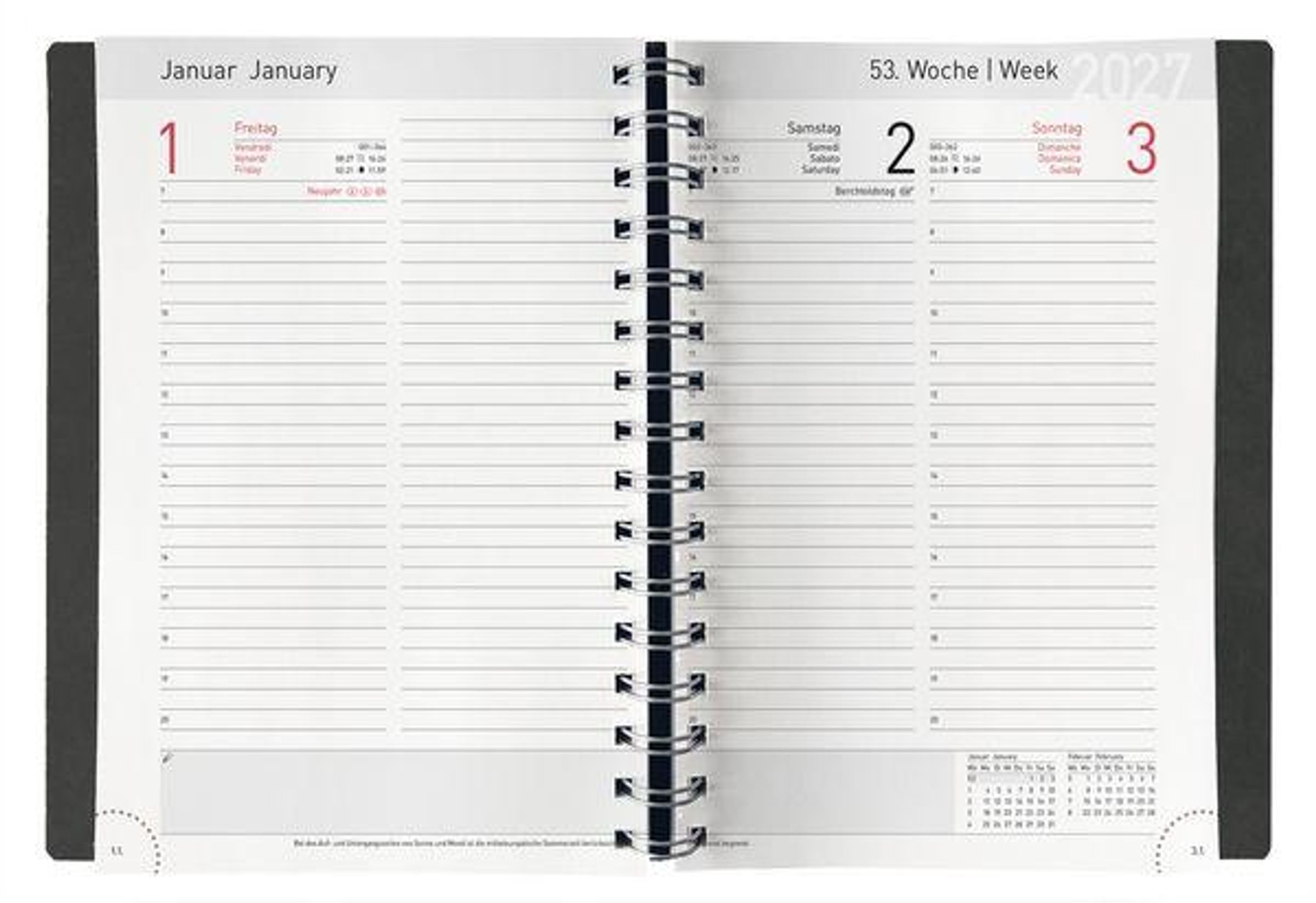 Moderner Buchkalender mit praktischer Spiralbindung und hochwertigem Einband aus schwarzem Leder. Pro Wochentag eine Seite, Sa / So eine Seite. Kalendarium: D/E/F/I.