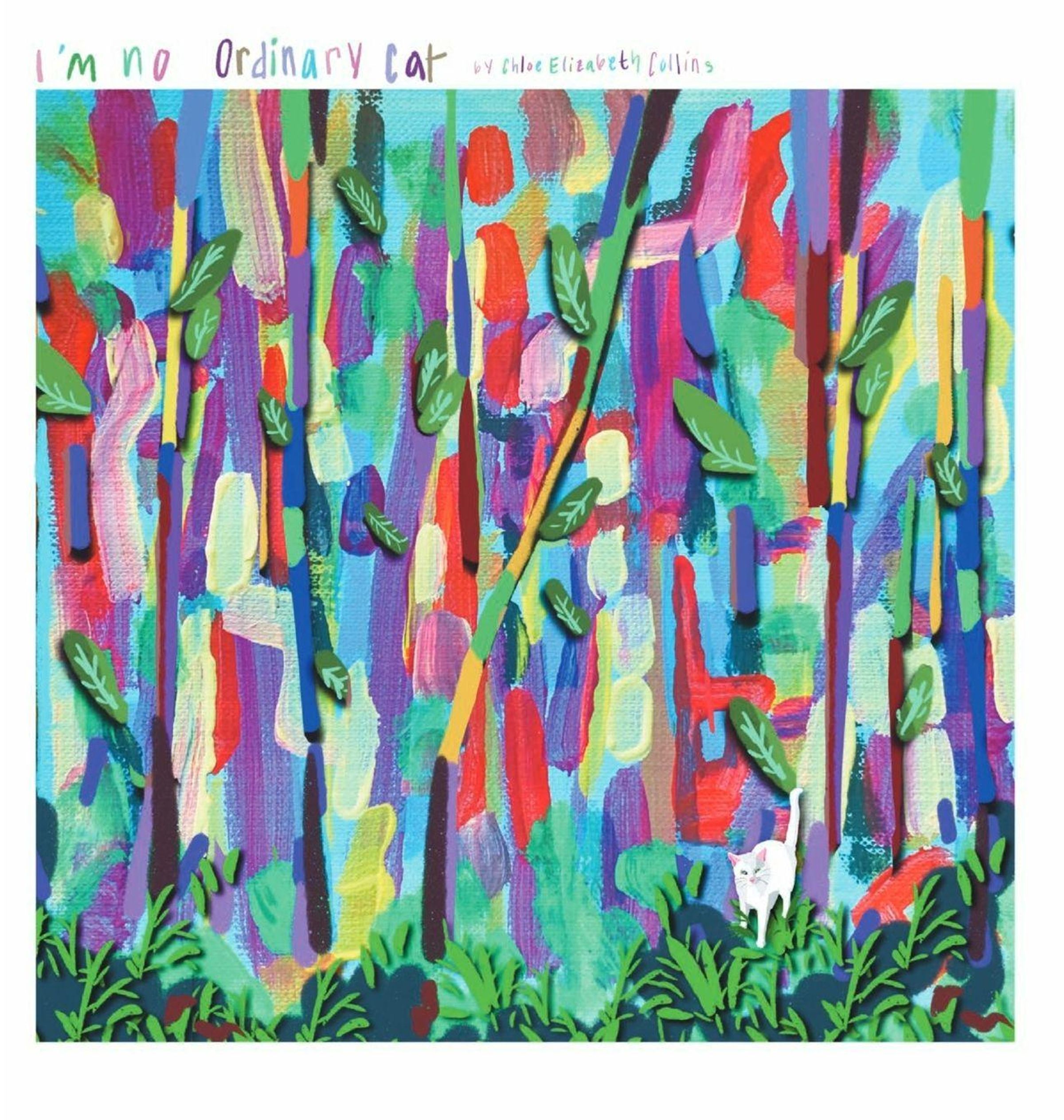 "I'm no Ordinary Cat" von Chloe Elizabeth Collins. Bunte, abstrakte Illustration mit Pflanzen und einer weißen Katze im Vordergrund., Buch