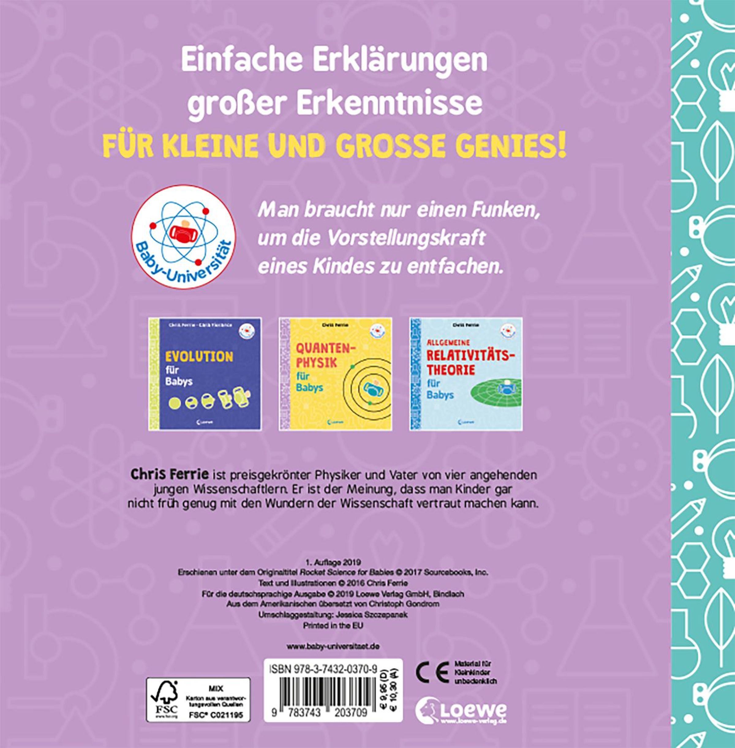 Raketenwissenschaft für Babys ist eine heitere und verständliche Hinführung zur Luft- und Raumfahrttechnik. Kleinkinder (und Erwachsene!) lernen die Grundlagen von Auftrieb kennen und begreifen, wie Schubkraft Dinge zum Fliegen bringt. Auf unnachahmlich leichte Weise und stets mit einem Augenzwinkern schafft es der Quantenphysiker und Familienvater Chris Ferrie, Kinder und Erwachsene gleichermaßen zu inspirieren. Die Bücher der Baby-Universität sind der einfachste Weg, um schon die Jüngsten für die Wunder der Wissenschaft zu begeistern.