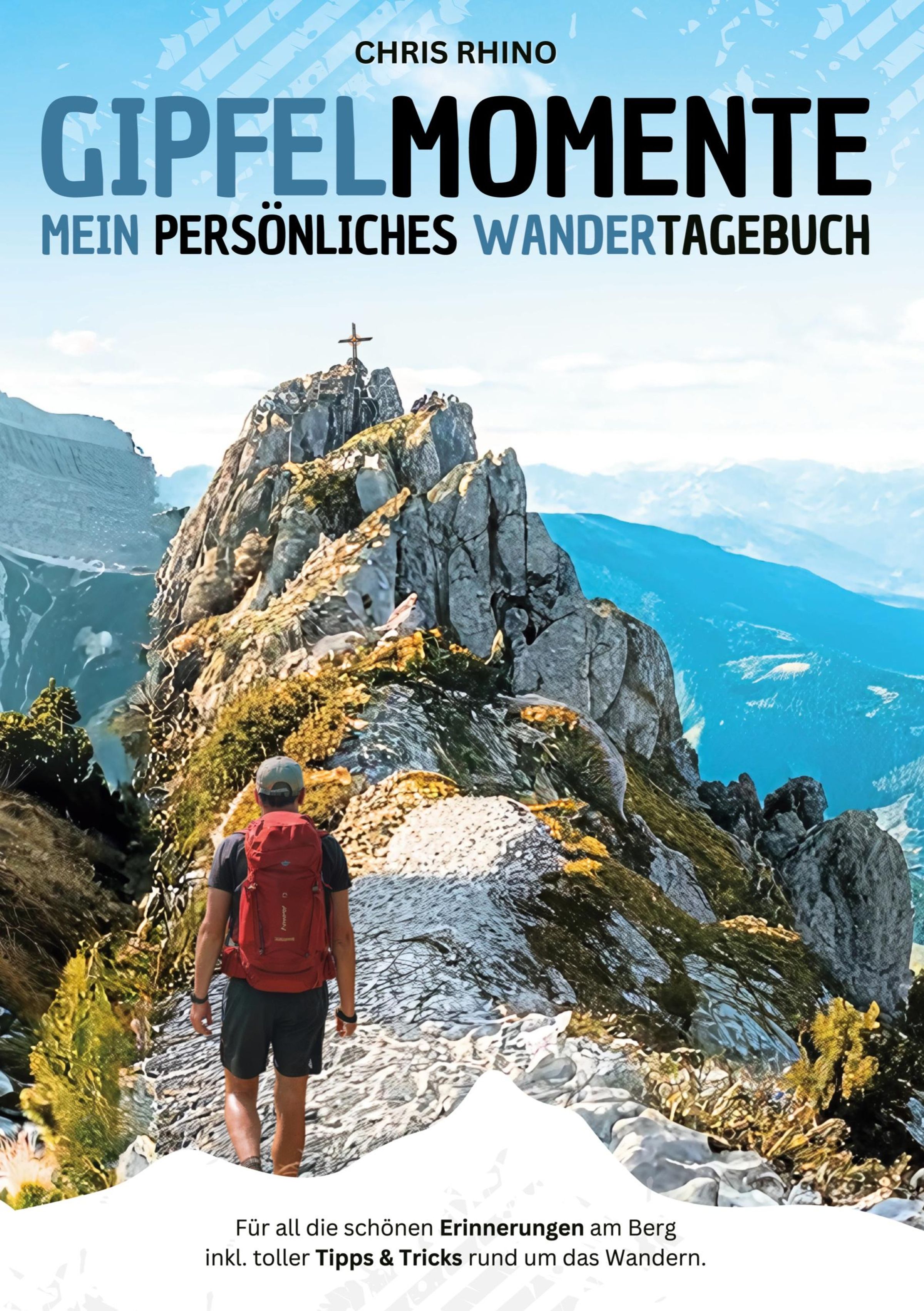 CHRIS RHINO. GIPFELMOMENTE: Wandertagebuch. Mensch mit rotem Rucksack auf Bergweg, Gipfelkreuz in der Ferne., Buch