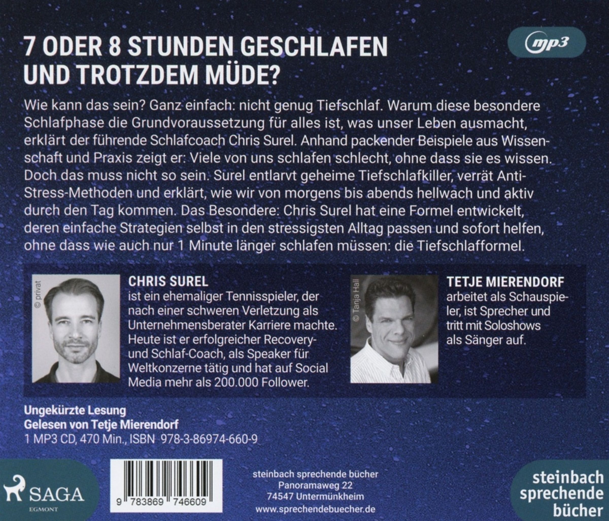 Kennen Sie das: Sie haben acht Stunden geschlafen und sind immer noch komplett platt. Oder sie liegen seit Stunden im Bett, die Gedanken drehen sich schneller als ein Highspeed-Karoussel und sie können einfach nicht einschlafen? Sie kennen das? Kein Stress. Chris Surel zeigt ihnen, worauf es beim Schlafen wirklich ankommt. Er befreit sie von dem Druck auf eine bestimmte Schlafstundenanzahl zu kommen und erklärt, wie sie innerhalb kürzester Zeit Einschlafstörungen überwinden. Surel war Profisportler und Topmanager und irgendwann total am Ende. Bis er sein Leben umstellte und den Ausweg fand: die Tiefschlafformel. Heute berät der gefragte Recovery- und Schlafcoach führende Konzerne, aber auch viele Privatleute und verrät ihnen das Geheimnis des erholsamen Schlafes, gestützt auf zahlreiche wissenschaftliche und praktische Erfahrungen. Surel erklärt anschaulich, dass es auf den Tiefschlaf ankommt, wie lange der dauern muss und welche Tricks es dafür gibt.