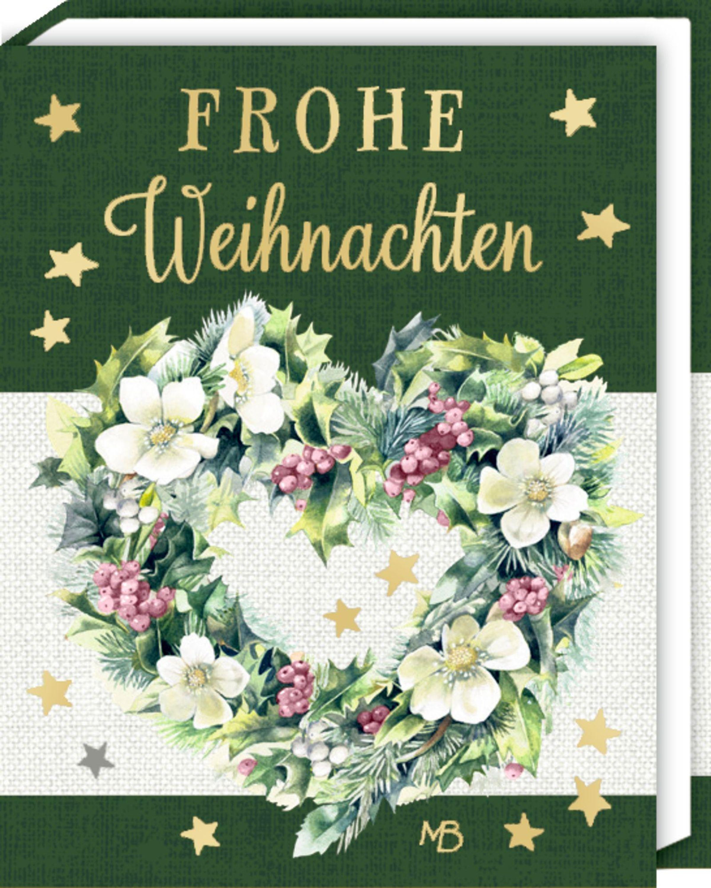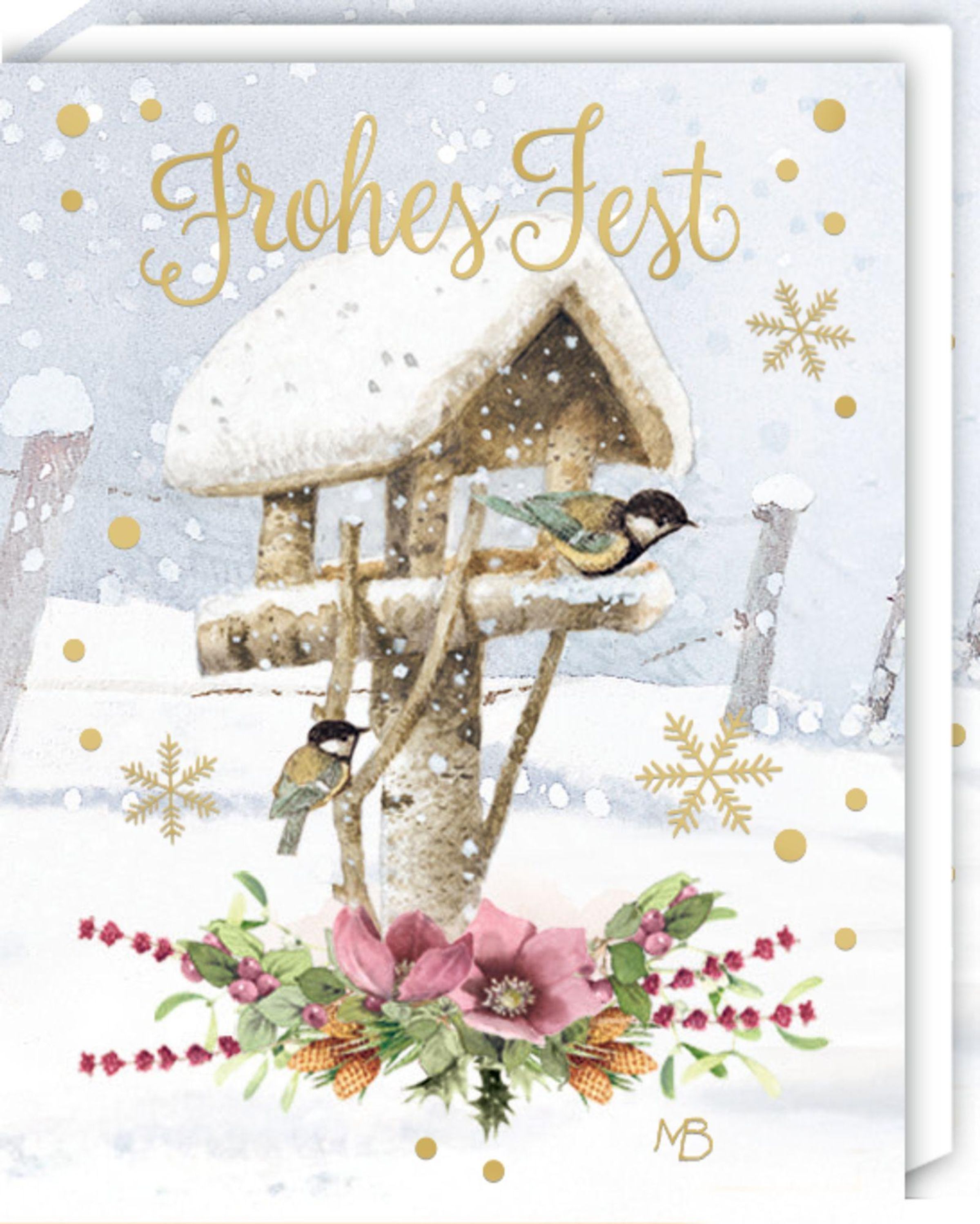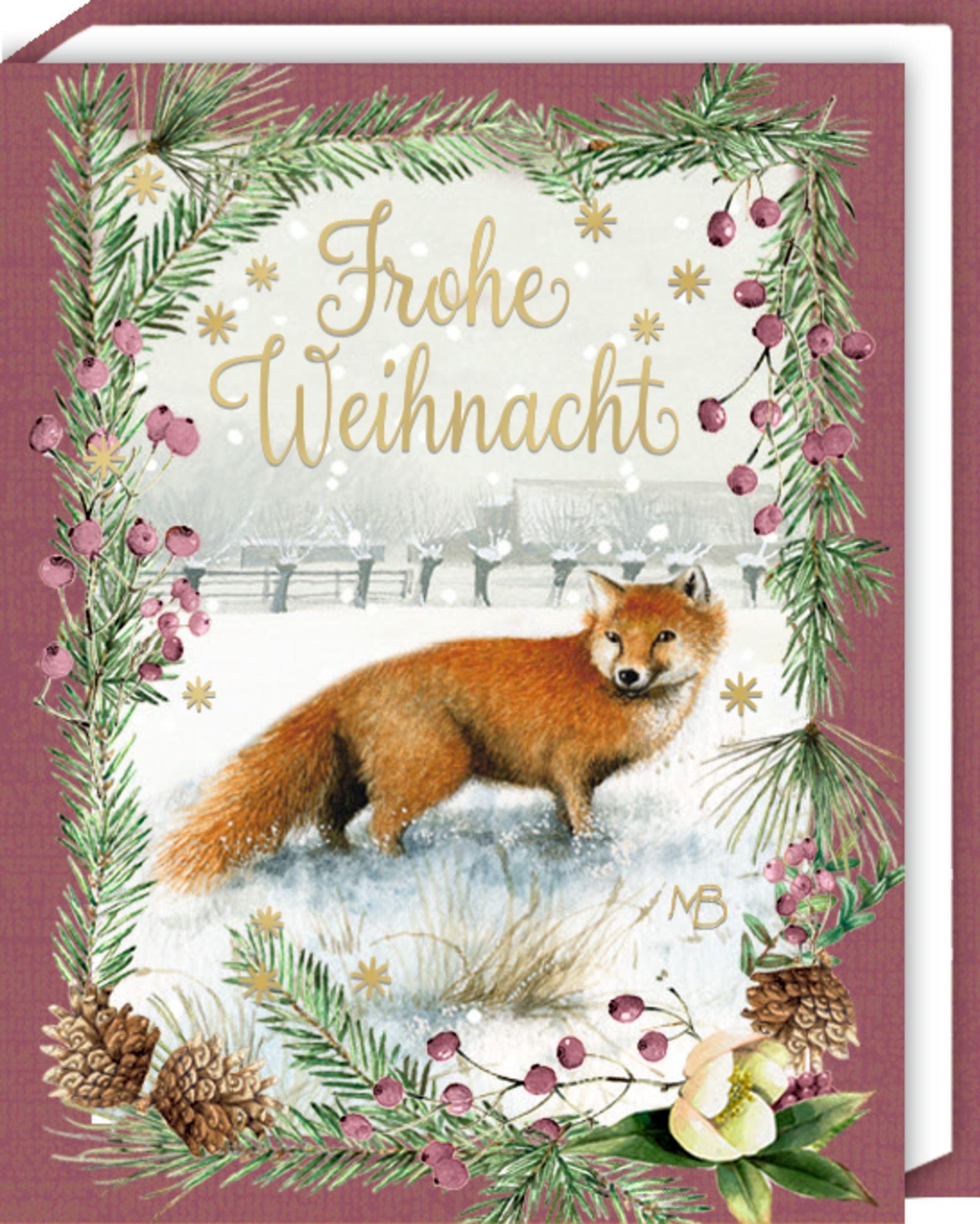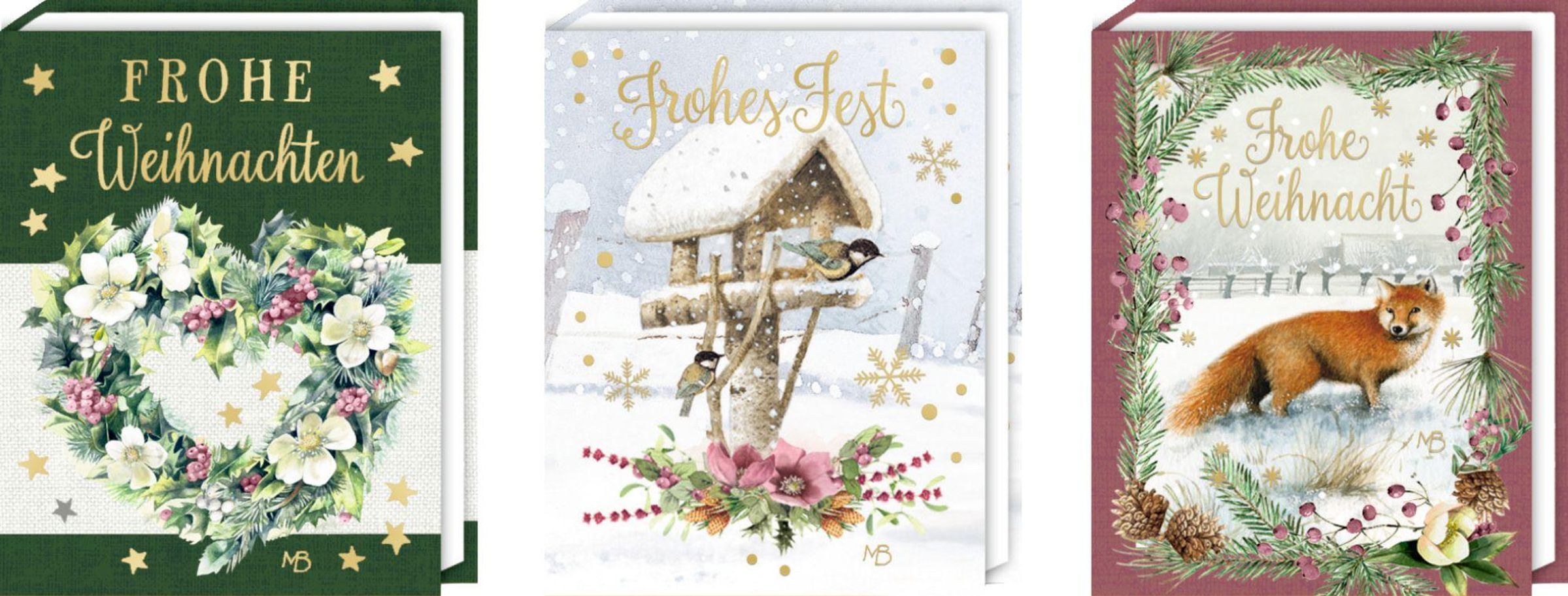 Links: "FROHE Weihnachten" über einem Blumenkranz. Mitte: "Frohes Fest" mit Vögeln im Schnee. Rechts: "Frohe Weihnacht" mit Fuchs., Buch