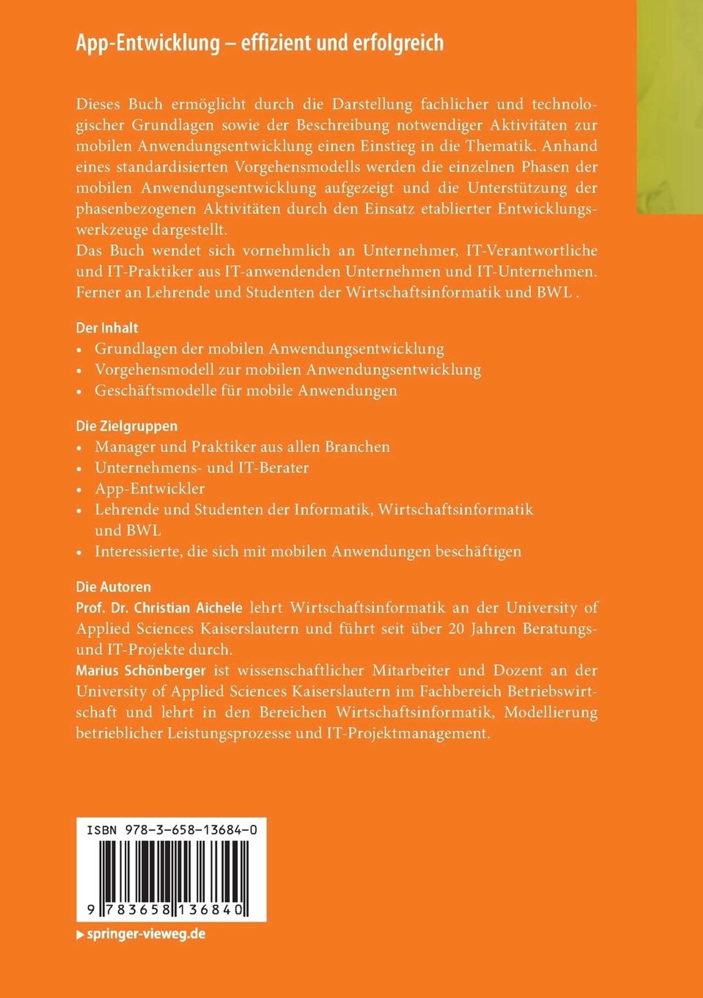 Dieses Buch ermöglicht durch die Darstellung fachlicher und technologischer Grundlagen sowie der Beschreibung notwendiger Aktivitäten zur mobilen Anwendungsentwicklung einen Einstieg in die Thematik. Anhand eines standardisierten Vorgehensmodells werden die einzelnen Phasen der mobilen Anwendungsentwicklung aufgezeigt und die Unterstützung der phasenbezogenen Aktivitäten durch den Einsatz etablierter Entwicklungswerkzeuge dargestellt.