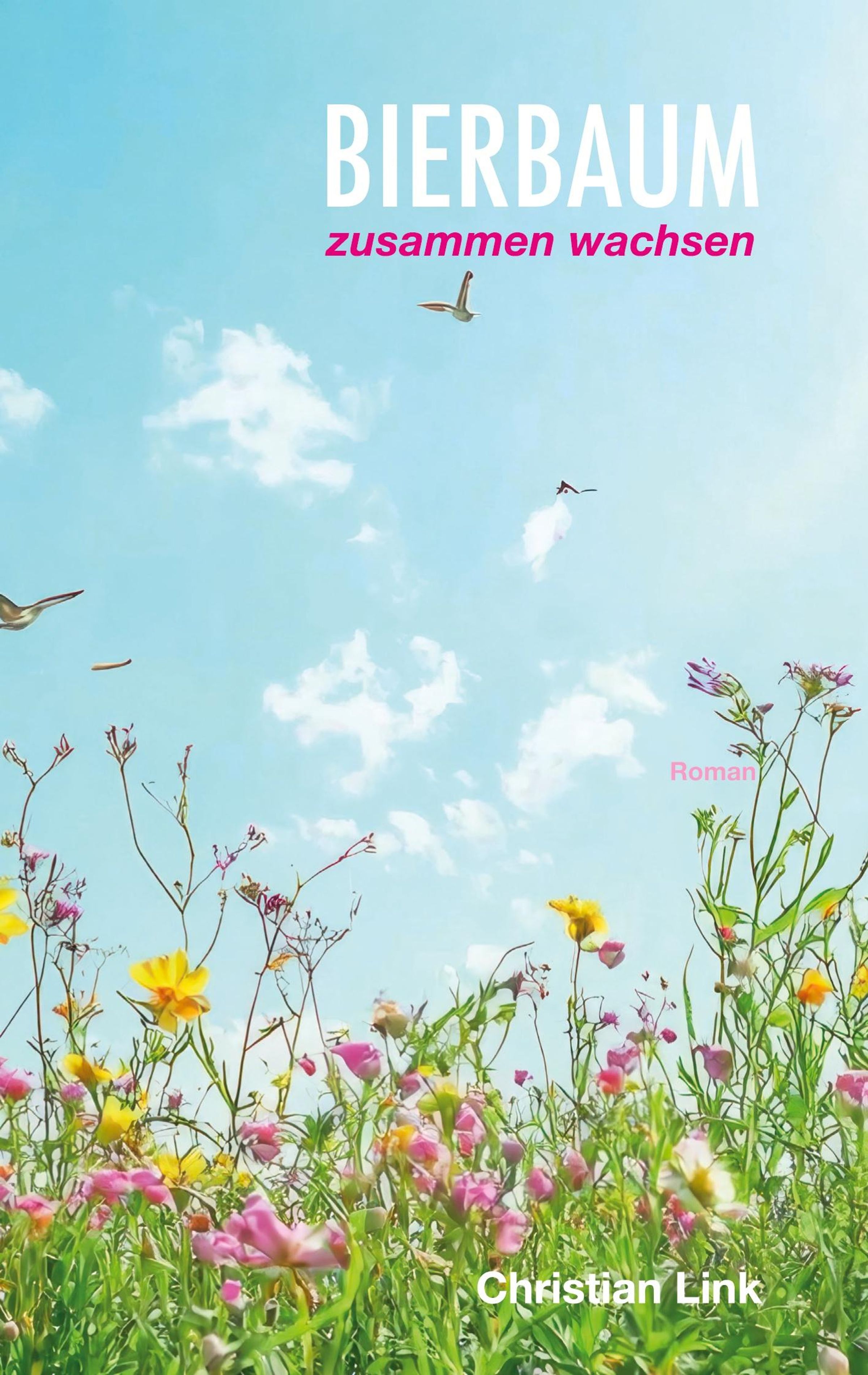 Text: BIERBAUM, zusammen wachsen, Roman, Christian Link. Bunte Blumenwiese unter blauem Himmel mit Vögeln., Buch