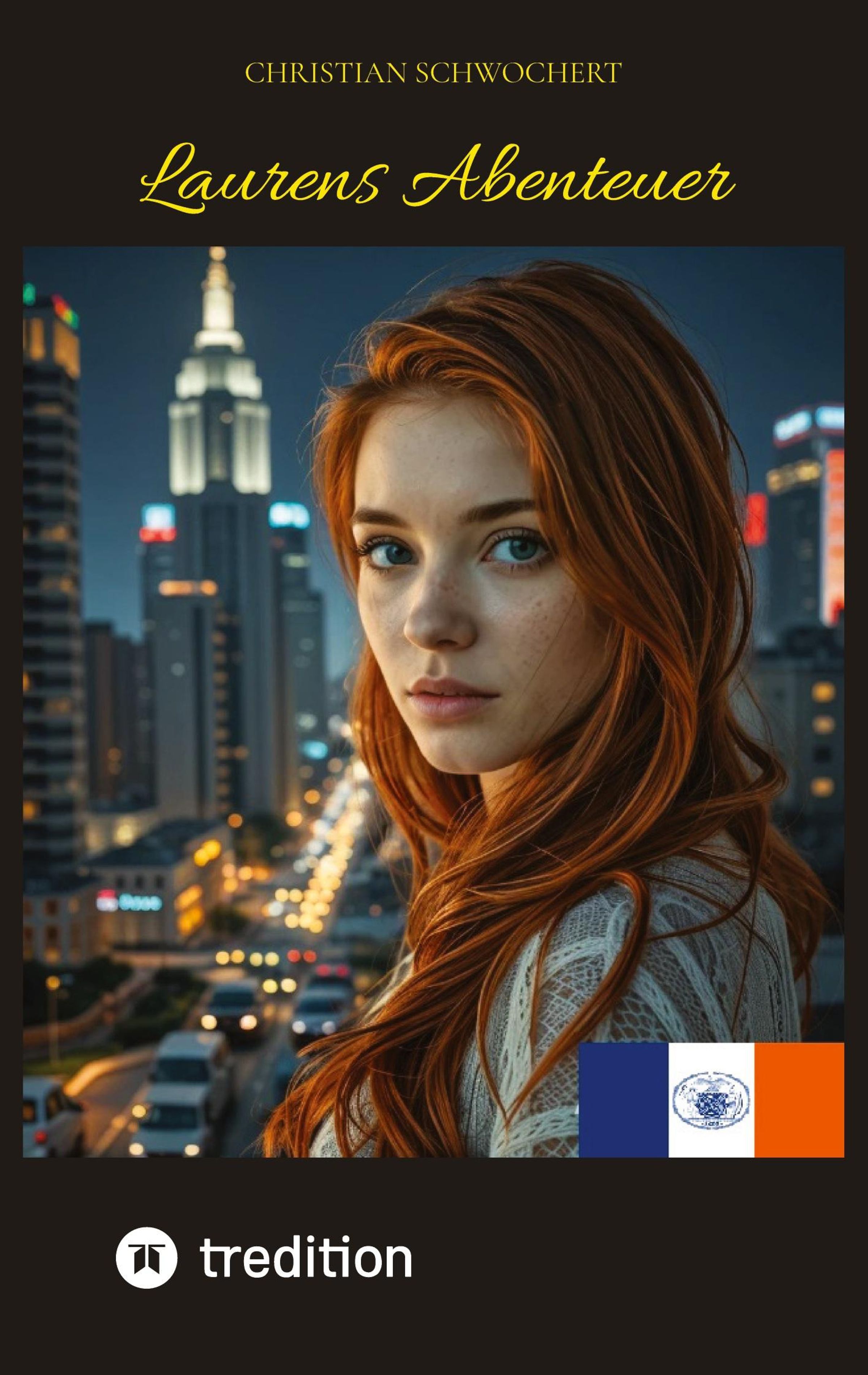 Junge Frau mit roten Haaren vor beleuchteter Stadtansicht. Flagge unten rechts., Buch