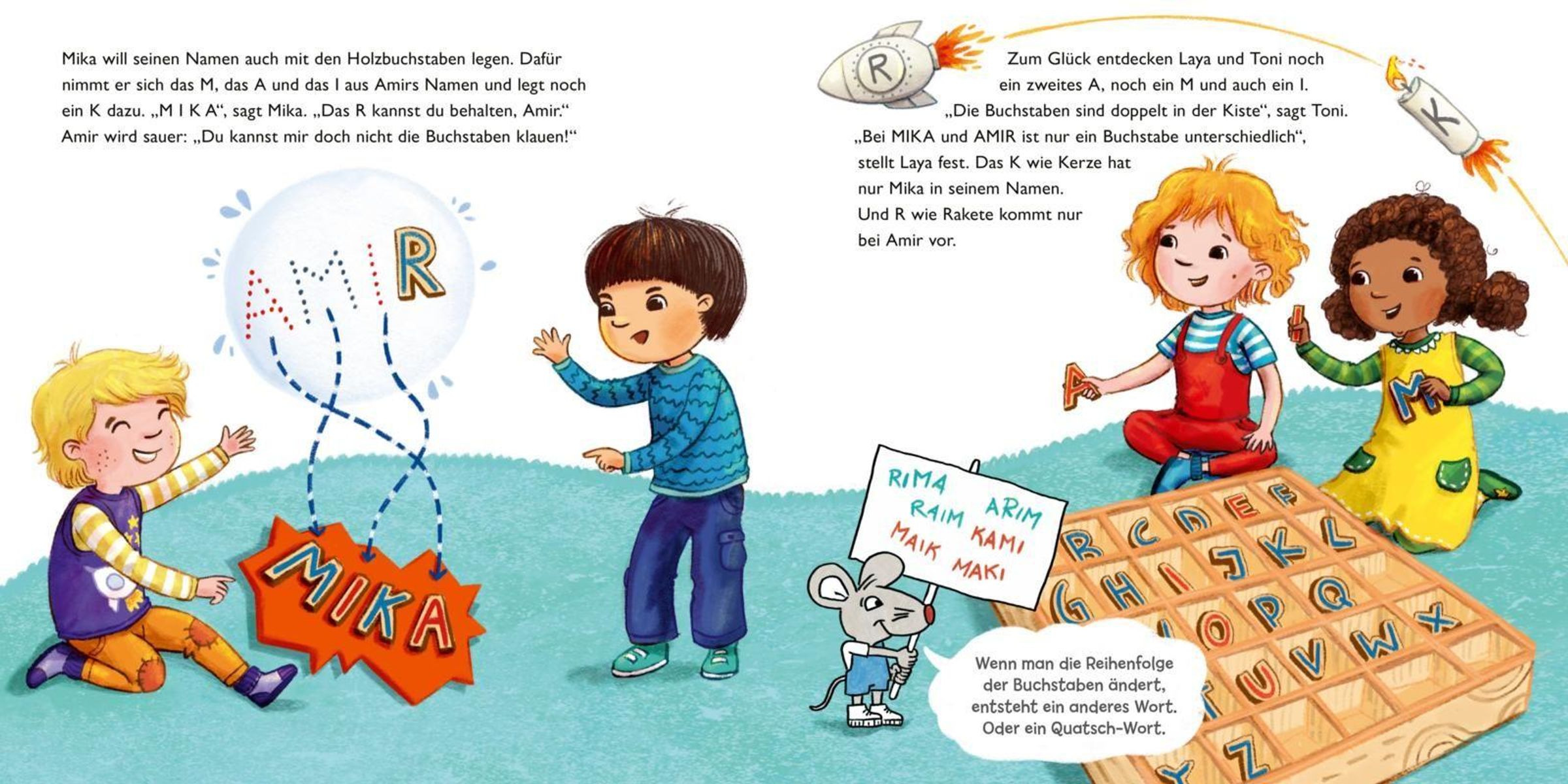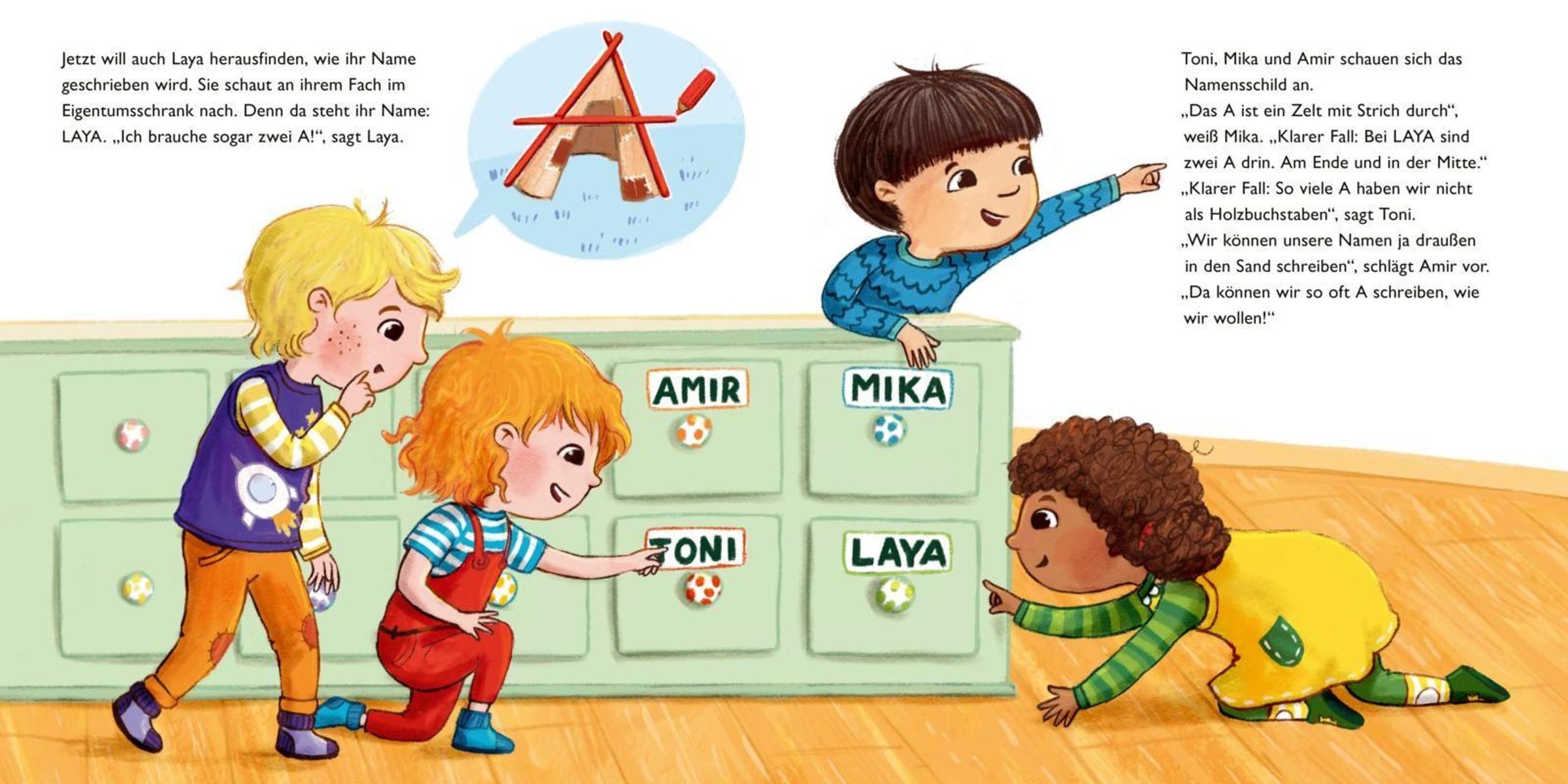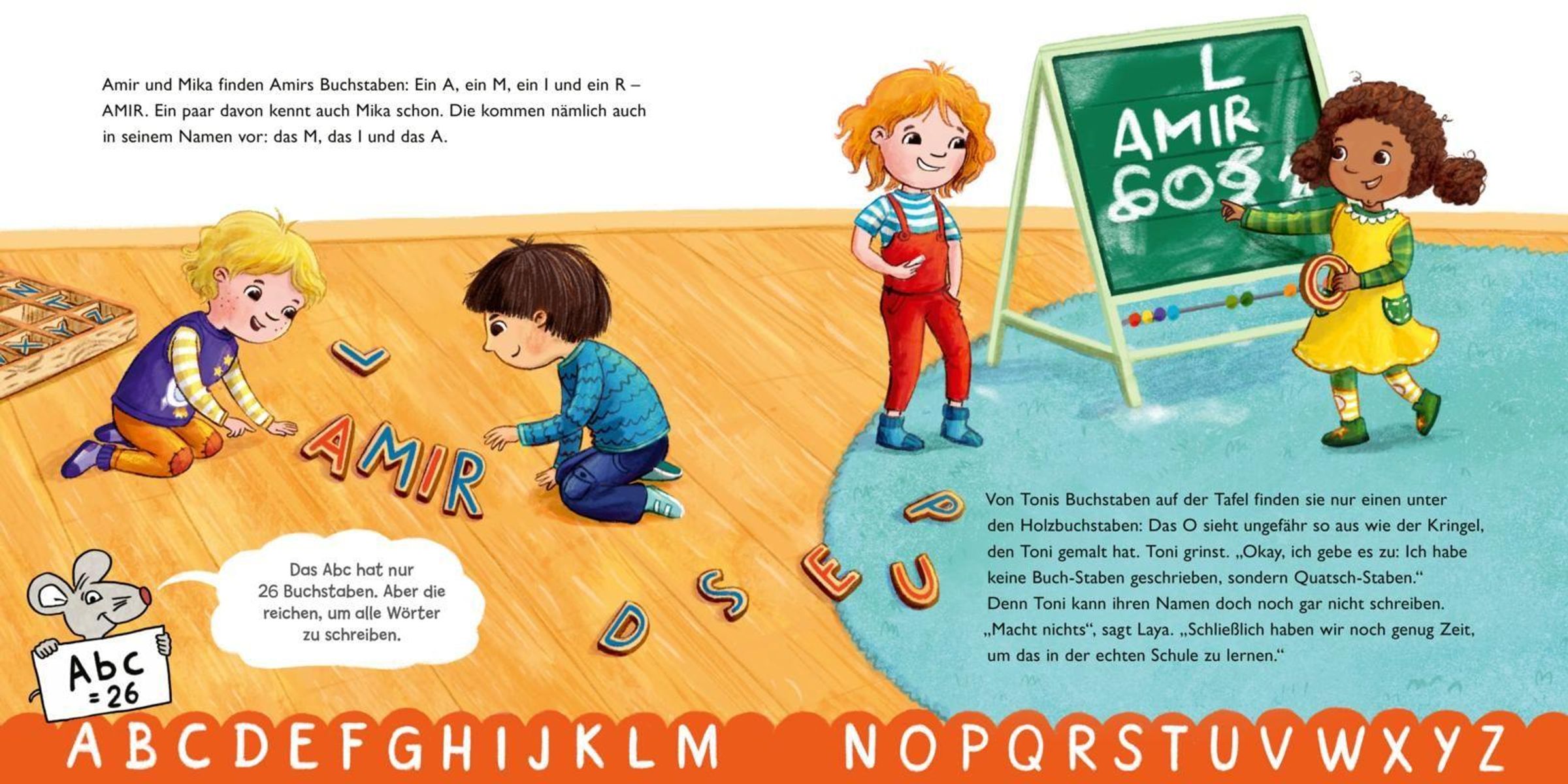 Laya, Mika, Toni und Amir gehen zusammen in den Kindergarten. Was die vier Freunde dort erleben, welche Buchstaben des Alphabets in ihren Namen stecken und dass Lesen- und Schreibenlernen nicht nur wichtig sind, sondern auch richtig Spaß machen - davon erzählt diese Geschichte.