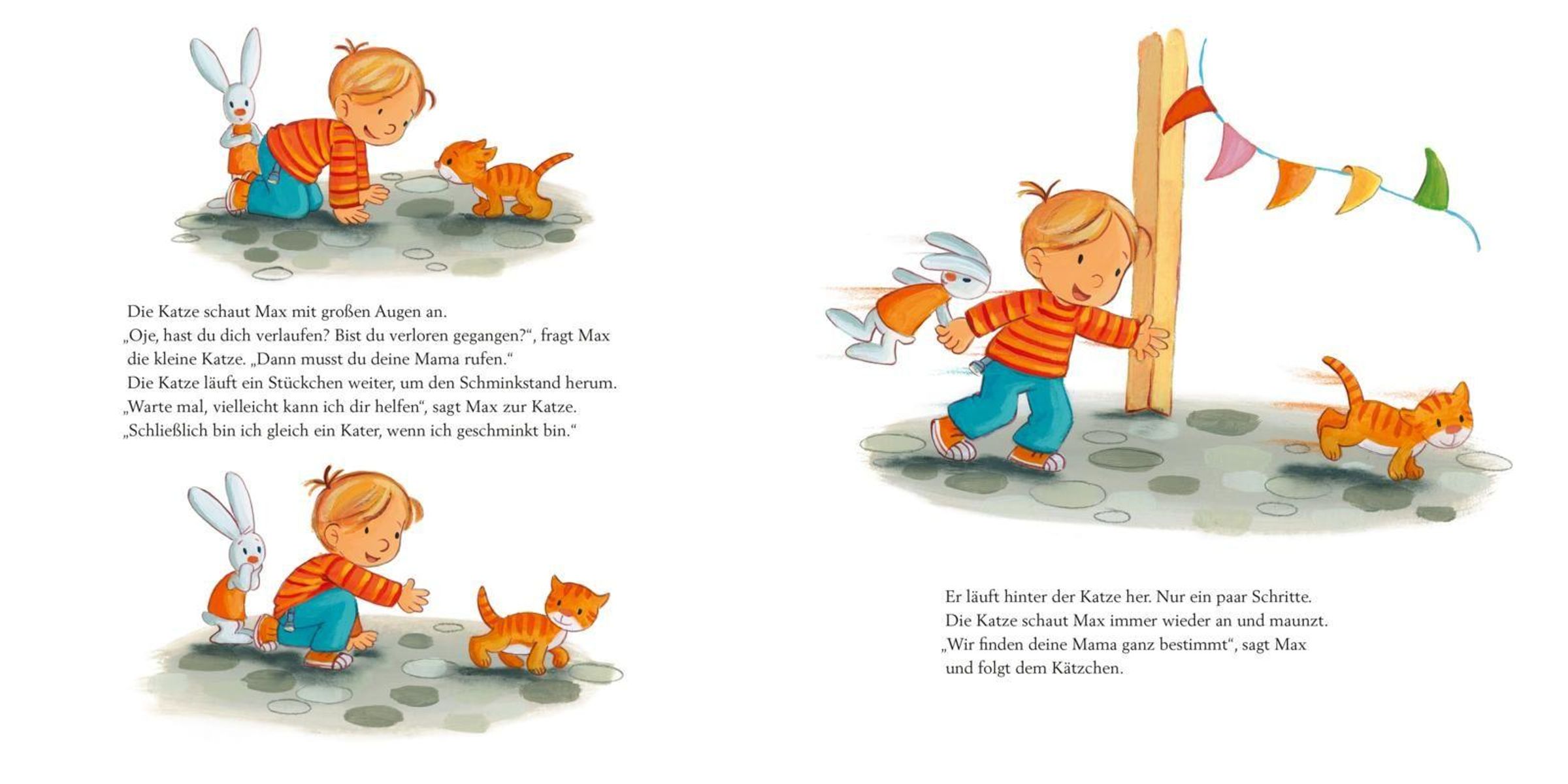 Juhu! Max geht mit Papa und seiner Freundin Pauline zum Straßenfest in der Stadt. Hier ist eine Menge los und es gibt viel zu entdecken: Max und Pauline möchten sich schminken lassen, Karussell fahren, Eis essen und eine super Band auf der Bühne sehen. Im Getümmel bemerkt Max auf einmal ein kleines Kätzchen. Ob es sich verlaufen hat? Max läuft ihm ein paar Schritte hinterher - und als er sich umsieht, sind Pauline und Papa plötzlich weg. Oje! Was nun?