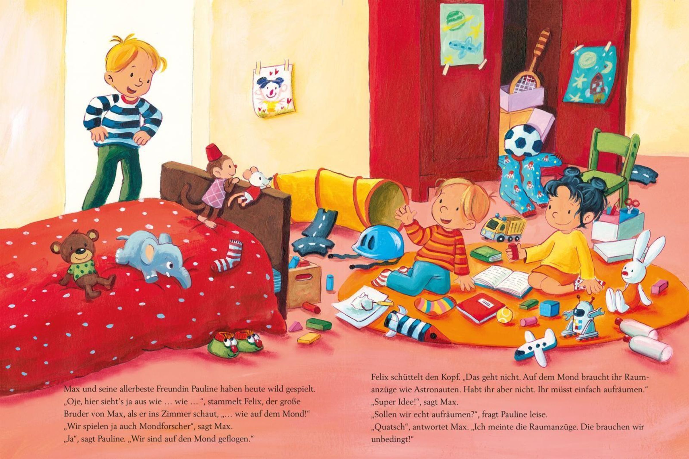Max und Pauline wollen nicht aufräumen. Sie möchten viel lieber zum Mond fliegen. Dafür brauchen sie aber Raumanzüge, sagt Felix, der große Bruder von Max. Denn im Weltraum gibt es keine Luft zum Atmen. Bei einem Ausflug ins Planetarium erfahren die Kinder außerdem jede Menge über die Sonne, den Mond, die Erde und andere Planeten. Schließlich fehlt nur noch eine Rakete - dann kann die Reise zu den Sternen beginnen!