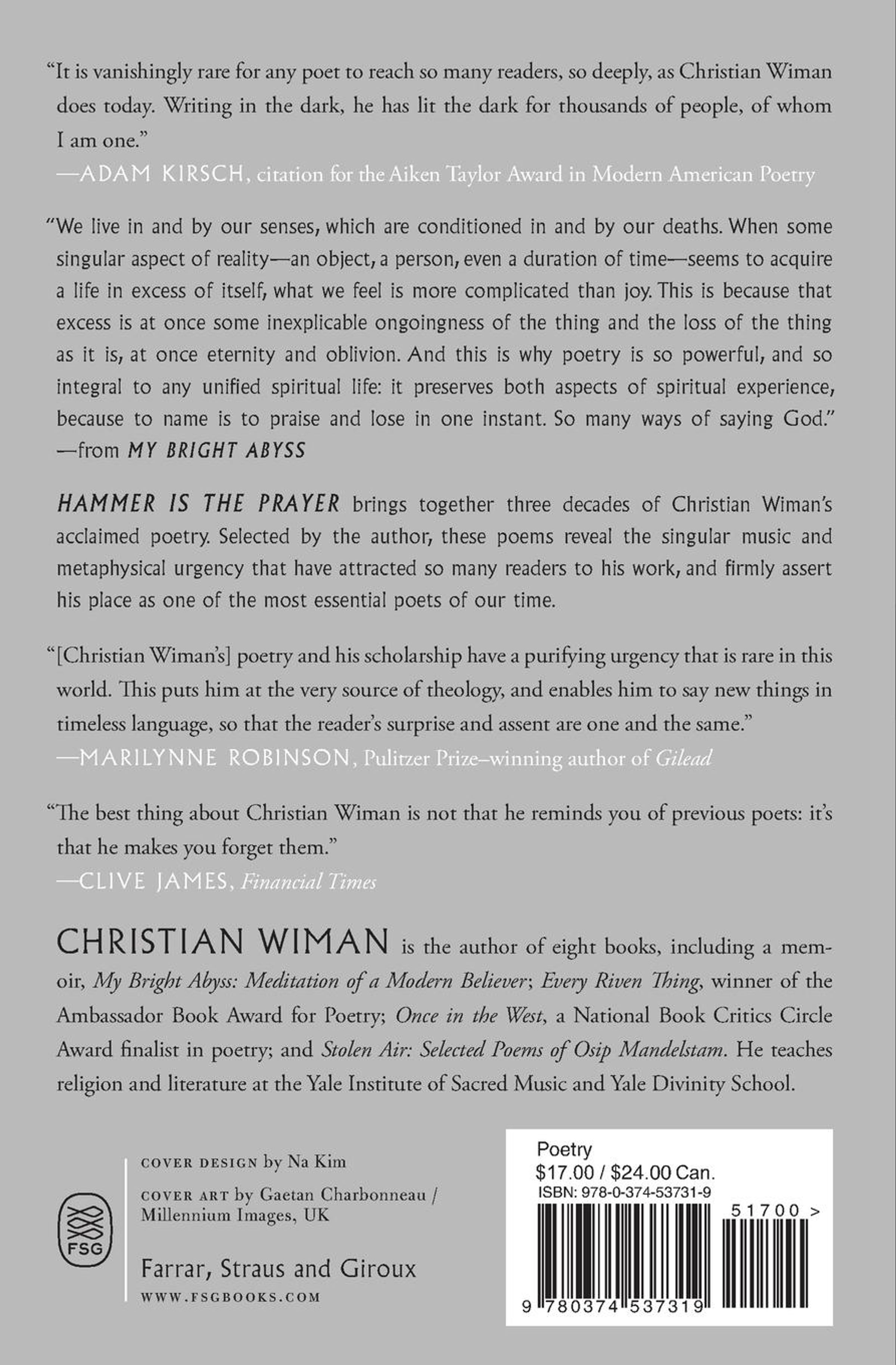 One of the most distinctive voices in contemporary American poetry, Christian Wiman has forged a singular style that fuses a vivid and propulsive music with clear-eyed realism, wry humor, and visionary lament. In his "daring and urgent" (The New York Times Book Review ) memoir, My Bright Abyss , he asks, "What is poetry's role when the world is burning?" Hammer Is the Prayer: Selected Poemsmight be read as an answer to that question.