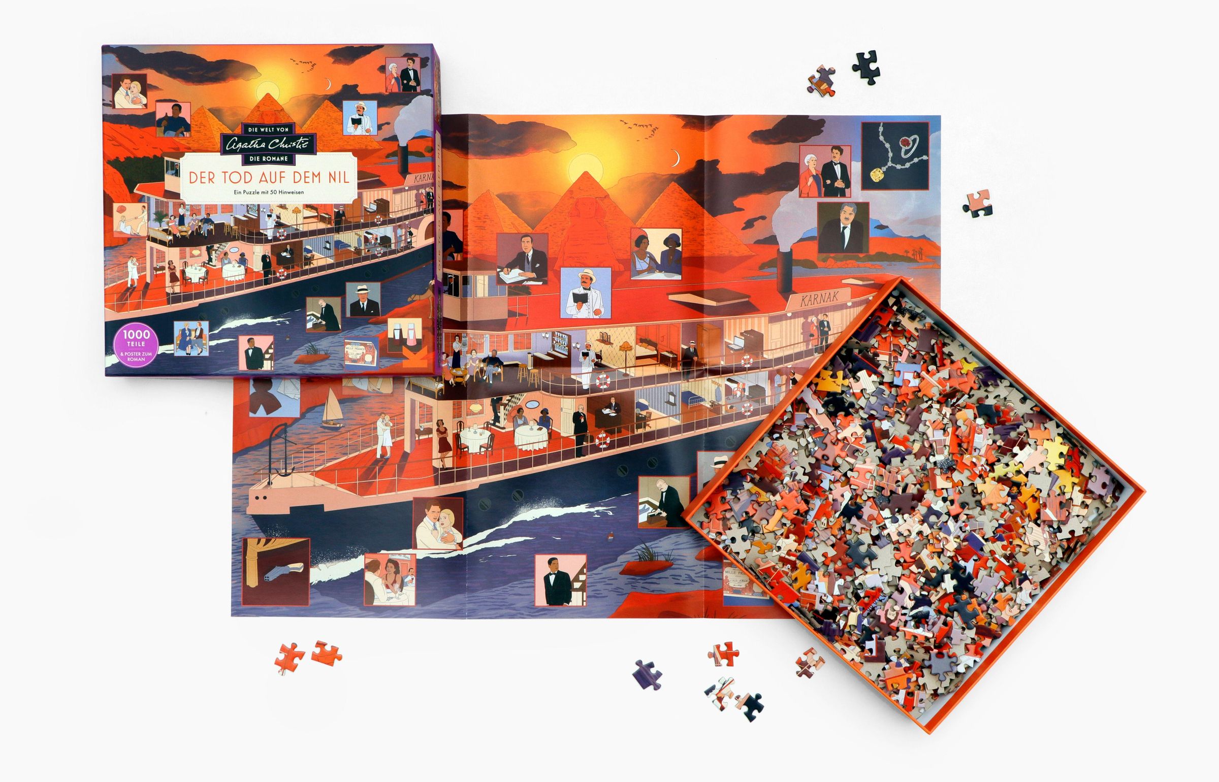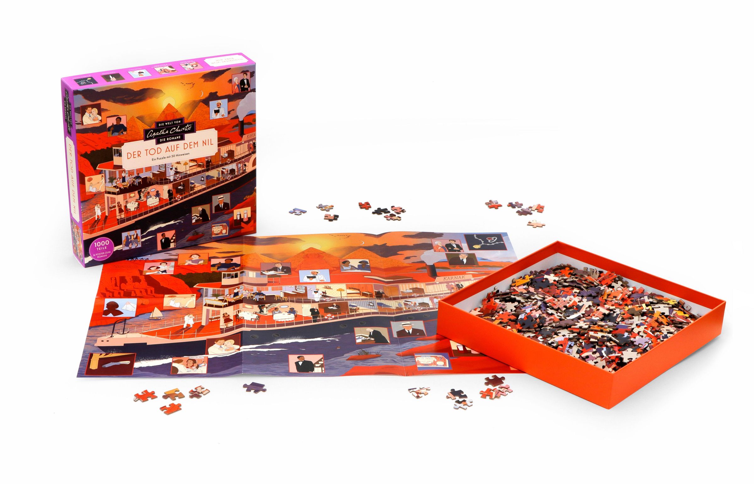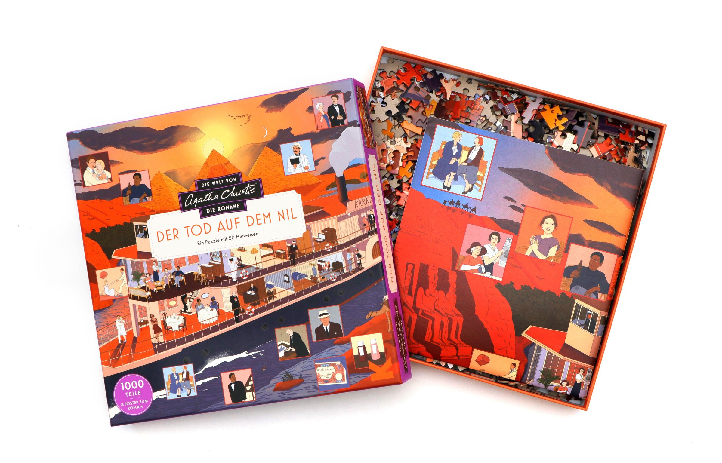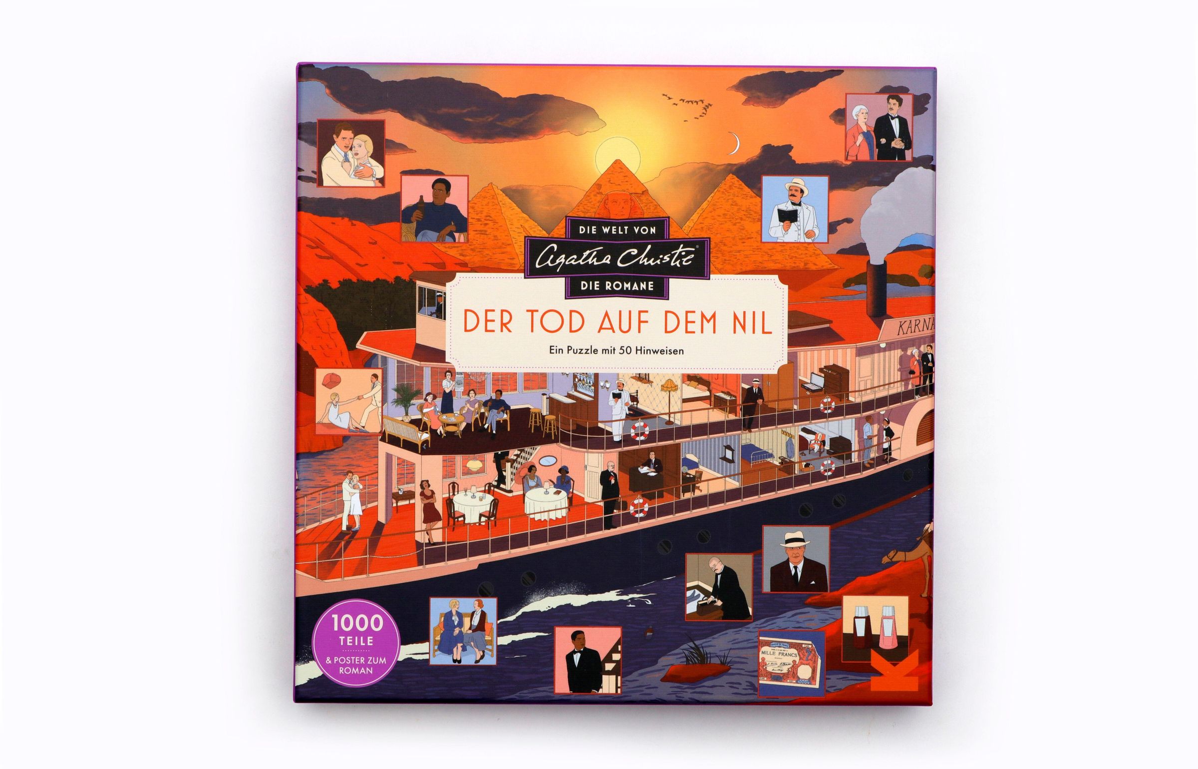 Tauchen Sie ein in die atmosphärische Kulisse eines der bekanntesten Romane von Agatha Christie: Tod auf dem Nil. Begeben Sie sich an Bord des Dampfers Karnak, der den Nil entlang gleitet, und treffen Sie die rätselhaften Passagiere wieder, darunter die glamouröse Linnet Ridgeway und ihr neuer Ehemann Simon Doyle. Doch die Fahrt nimmt eine mysteriöse Wendung: Können Sie Hercule Poirot helfen, den Fall aufzuklären? Entschlüsseln Sie die Hinweise, während Sie die Lösung Teil für Teil zusammensetzen, und erfahren Sie auf dem beiliegenden Poster mehr über den Roman und die dargestellten Details.