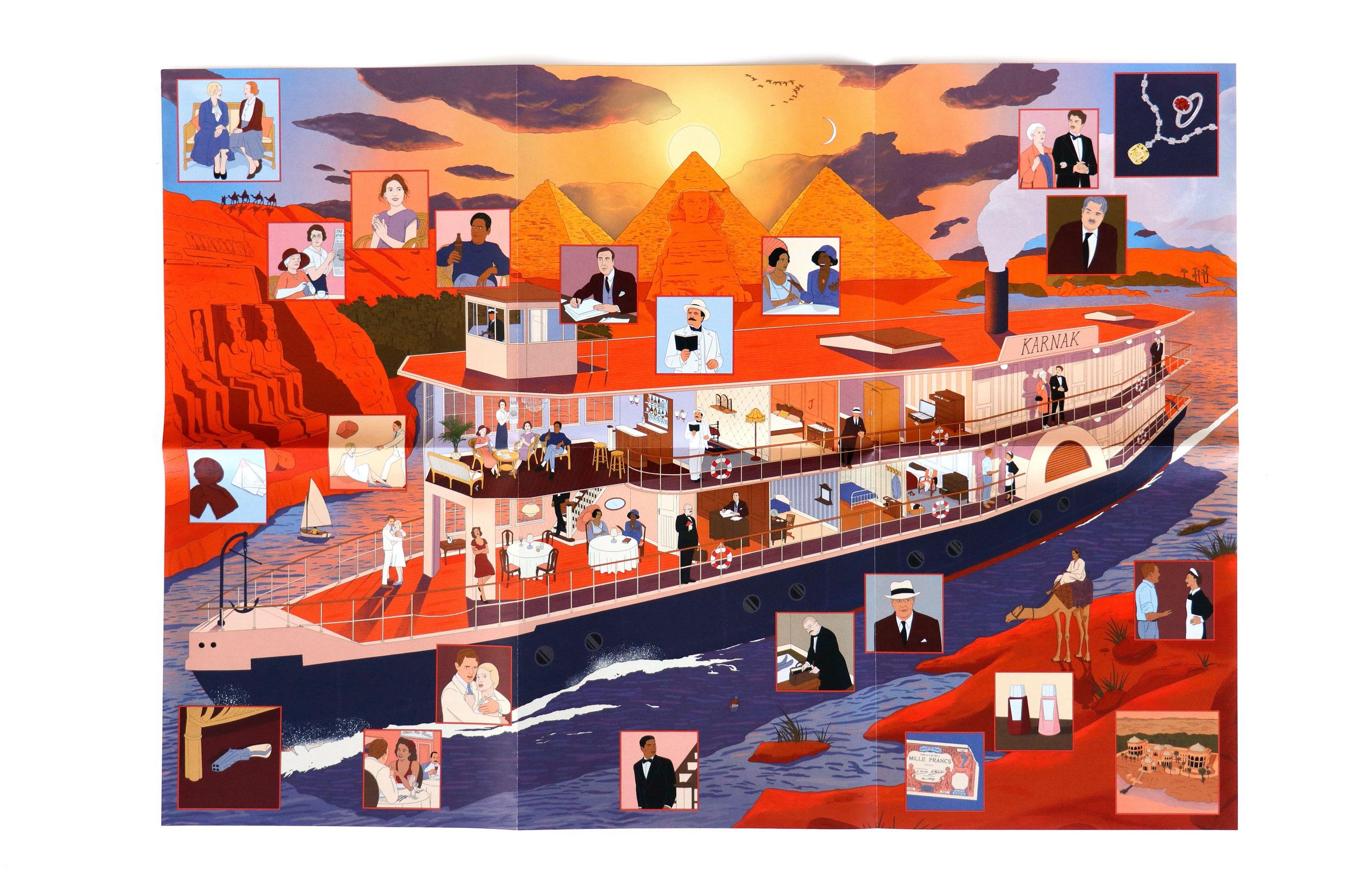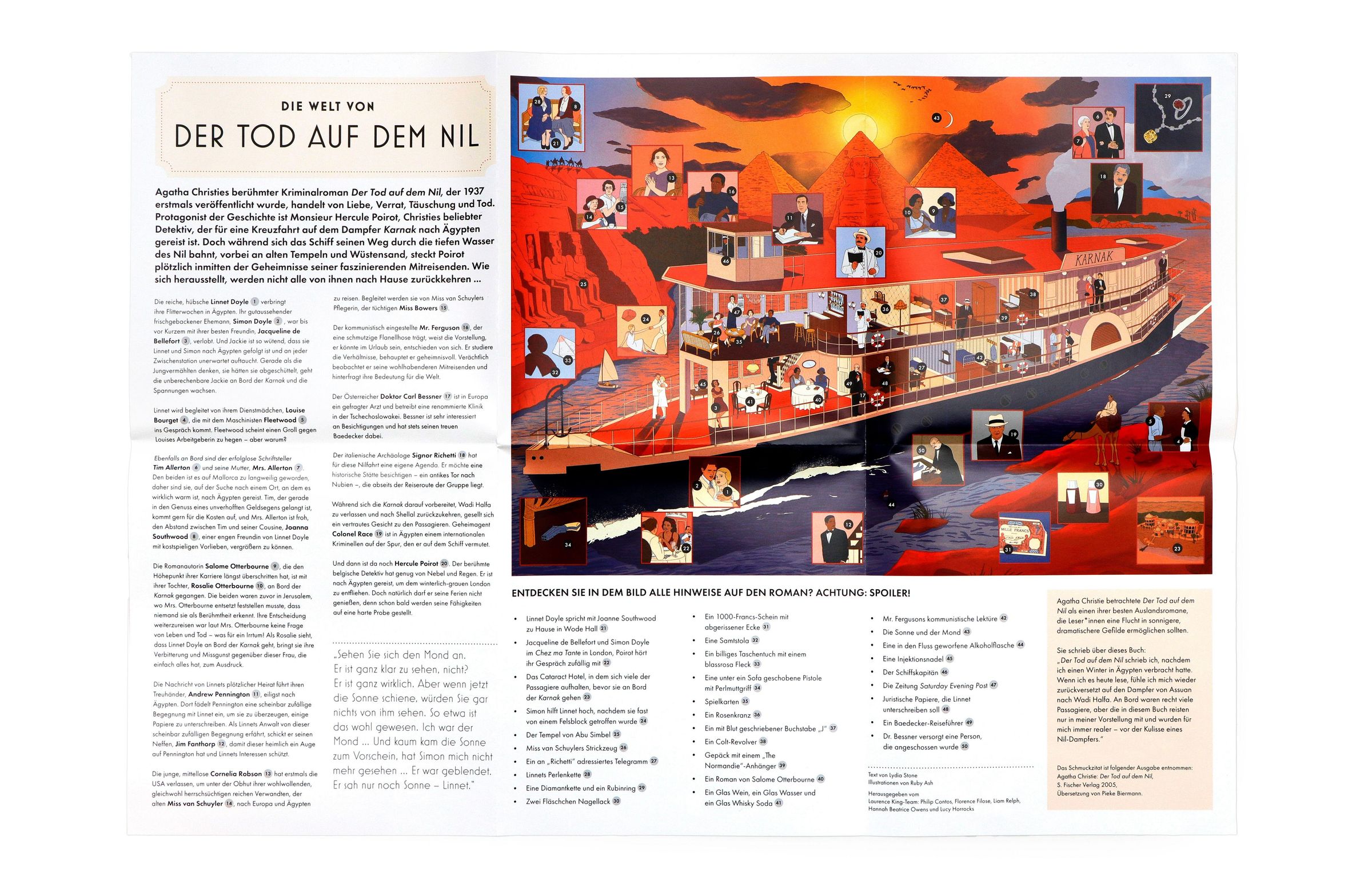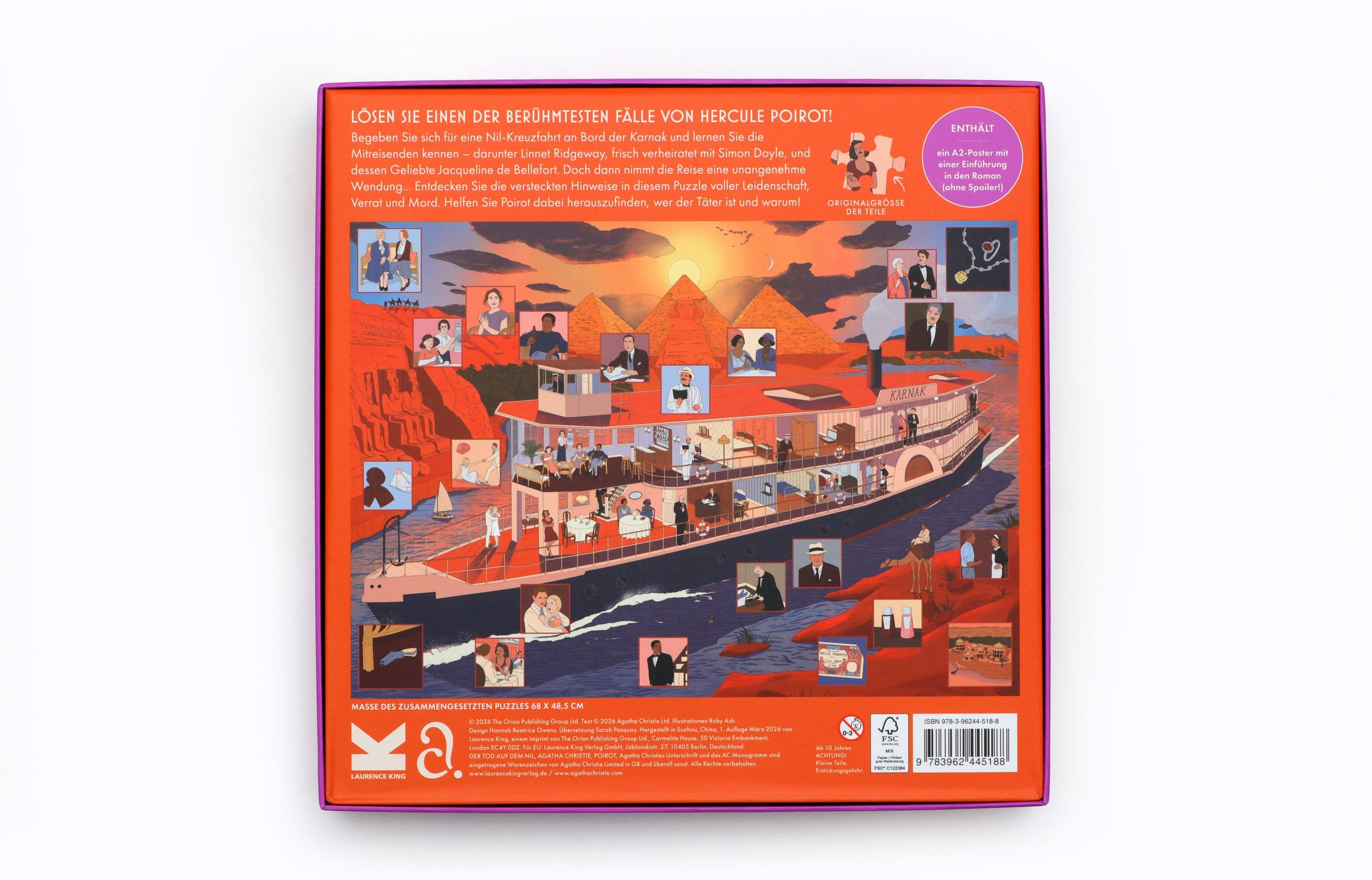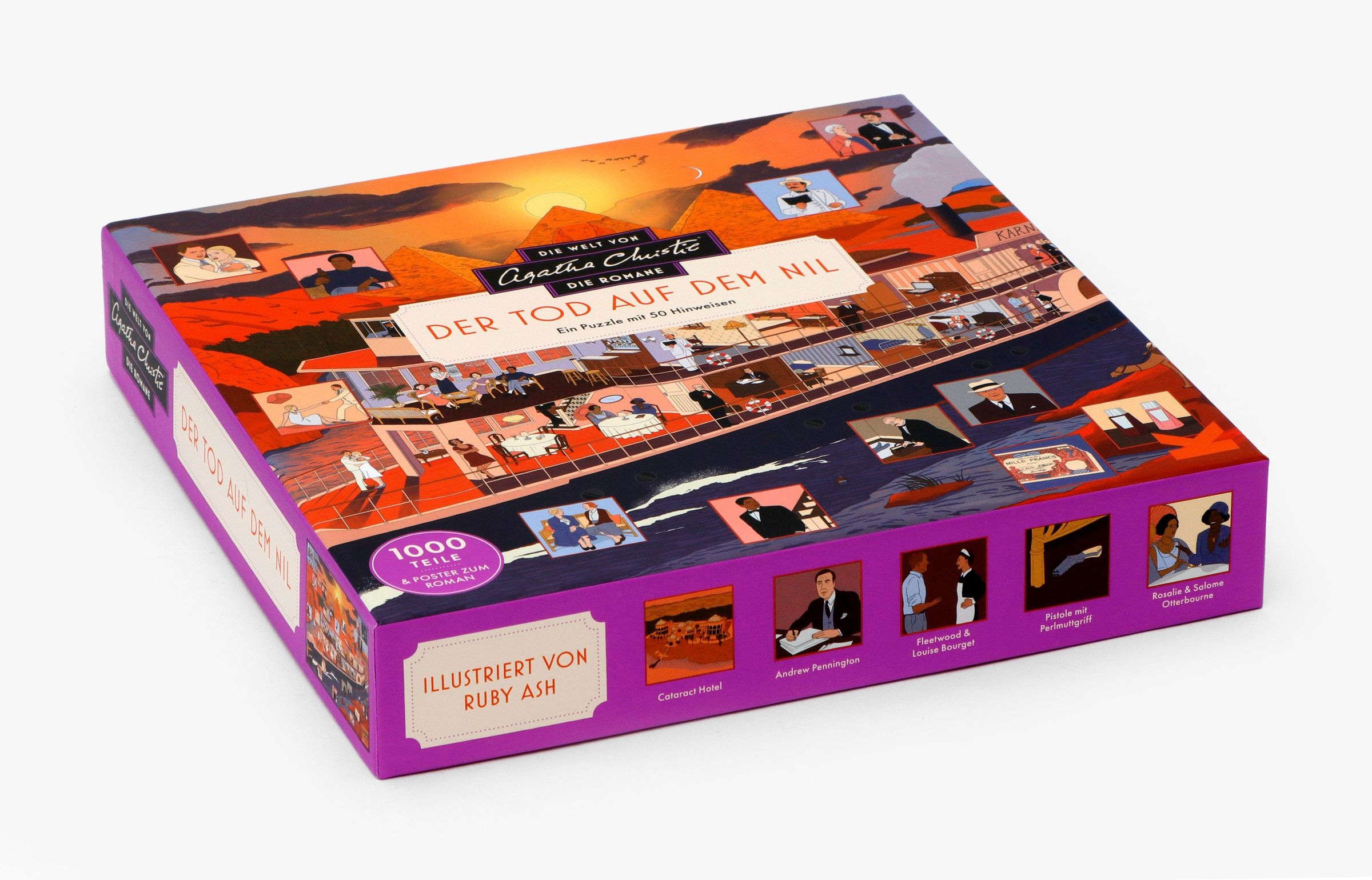 Tauchen Sie ein in die atmosphärische Kulisse eines der bekanntesten Romane von Agatha Christie: Tod auf dem Nil. Begeben Sie sich an Bord des Dampfers Karnak, der den Nil entlang gleitet, und treffen Sie die rätselhaften Passagiere wieder, darunter die glamouröse Linnet Ridgeway und ihr neuer Ehemann Simon Doyle. Doch die Fahrt nimmt eine mysteriöse Wendung: Können Sie Hercule Poirot helfen, den Fall aufzuklären? Entschlüsseln Sie die Hinweise, während Sie die Lösung Teil für Teil zusammensetzen, und erfahren Sie auf dem beiliegenden Poster mehr über den Roman und die dargestellten Details.