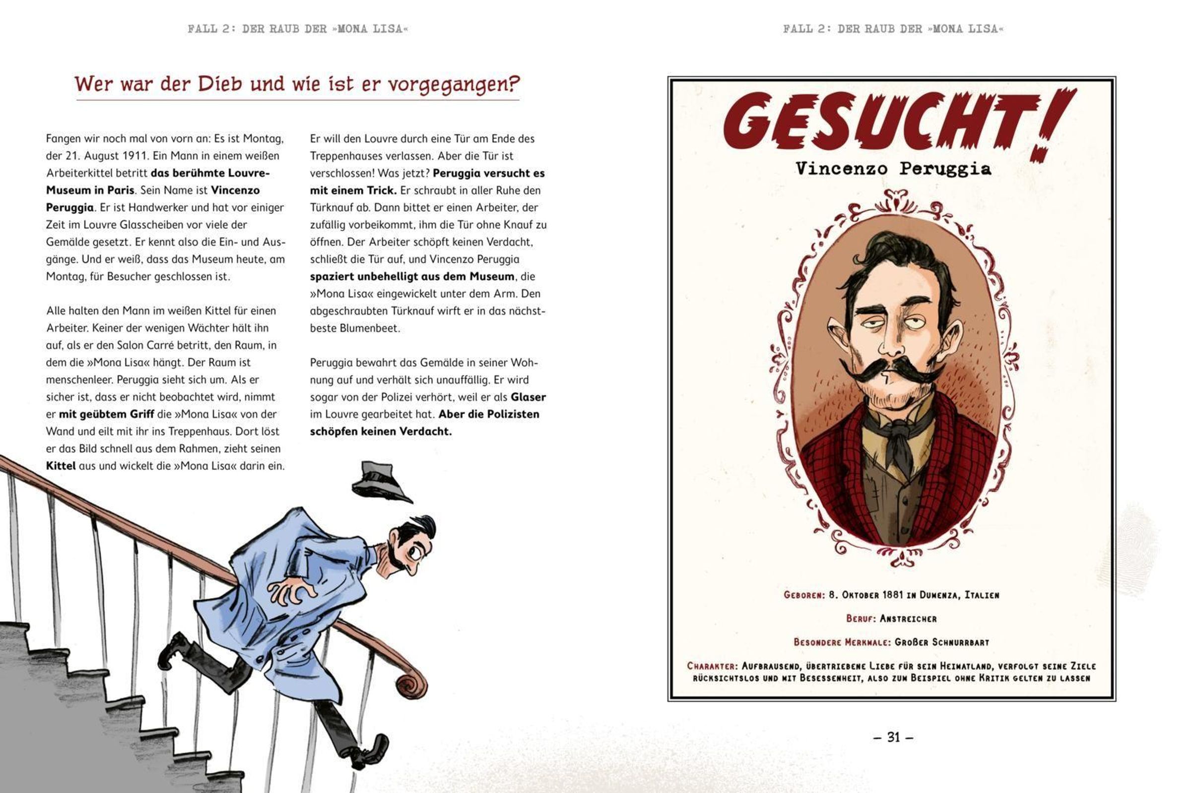 Unfassbar! Eben noch hing die Mona Lisa, das berühmteste Gemälde der Welt, gut gesichert im Museum. Jetzt ist sie verschwunden. Wie konnte das passieren? Und wer ist der Täter? Jetzt ist Ermittlungsarbeit gefragt! In diesem Comic-Sachbuch können Hobbydetektiv*innen hautnah miterleben, wie fünf der spannendsten und aufsehenerregendsten Kriminalfälle der Geschichte aufgelöst wurden. Dabei schauen sie Polizei und Kripo bei ihren Ermittlungen über die Schulter und erhalten spannende Einblicke in die Kriminal- und Polizeigeschichte. In diesem Band sind folgende Kriminalfälle enthalten: