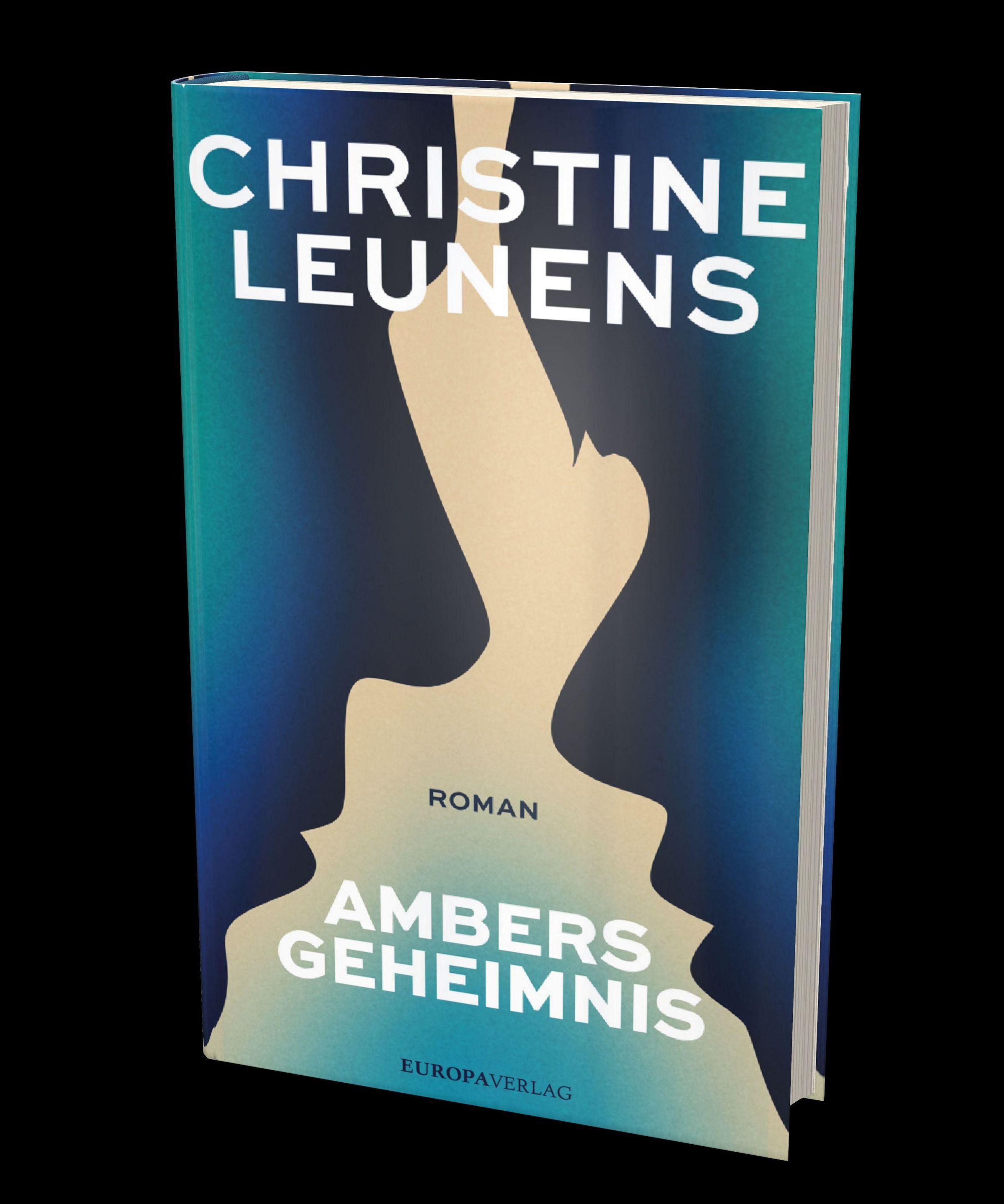 Oben "CHRISTINE LEUNENS", unten "AMBERS GEHEIMNIS". Dazwischen eine abstrakte Silhouette auf blau-grünem Hintergrund., Buch