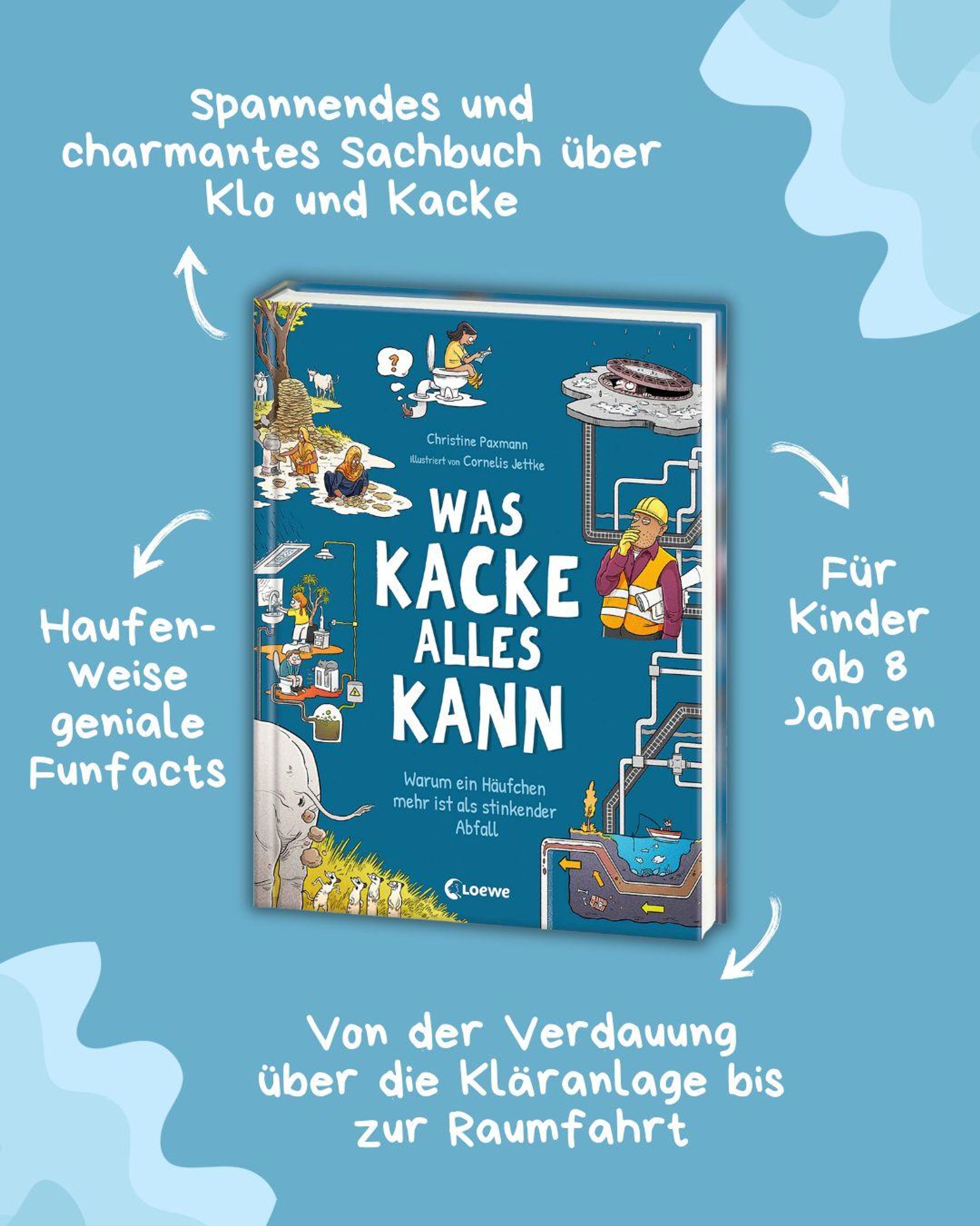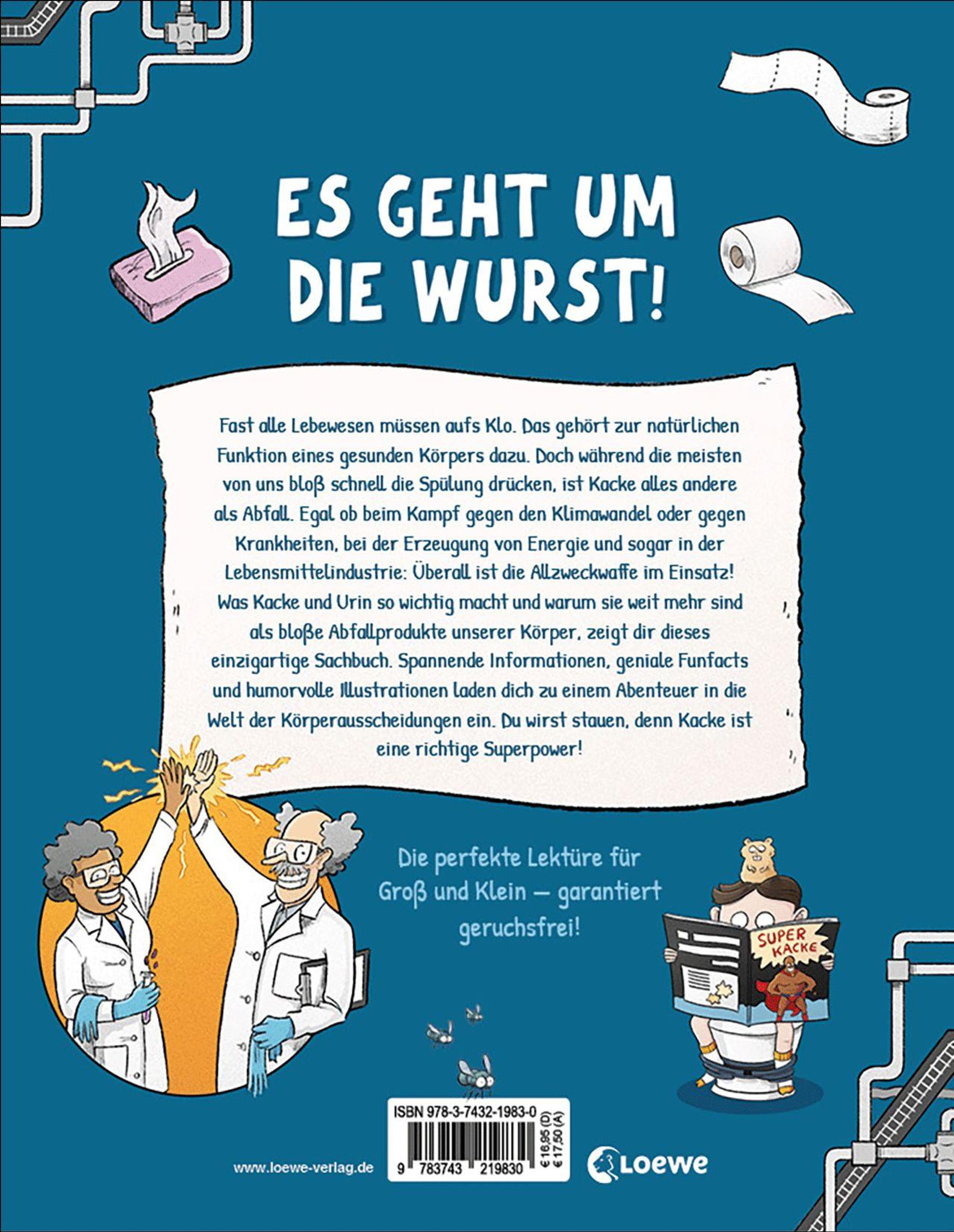 Es geht um die Wurst! Fast alle Lebewesen müssen aufs Klo. Das gehört zur natürlichen Funktion eines gesunden Körpers dazu. Doch während die meisten von uns bloß schnell die Spülung drücken, ist Kacke alles andere als Abfall. Ob in der Medizin, beim Kampf gegen den Klimawandel oder Krankheiten, in der Erzeugung von Energie und sogar in der Lebensmittelindustrie ist die Allzweckwaffe im Einsatz! Was Kacke und Urin so wichtig macht und warum sie weit mehr sind als bloße Abfallprodukte unserer Körper, zeigt dir dieses einzigartige Sachbuch. Spannende Informationen, geniale Funfacts und humorvolle Illustrationen laden dich zu einem Abenteuer in die Welt der Körperausscheidungen ein. Du wirst stauen, denn Kacke ist eine richtige Superpower!