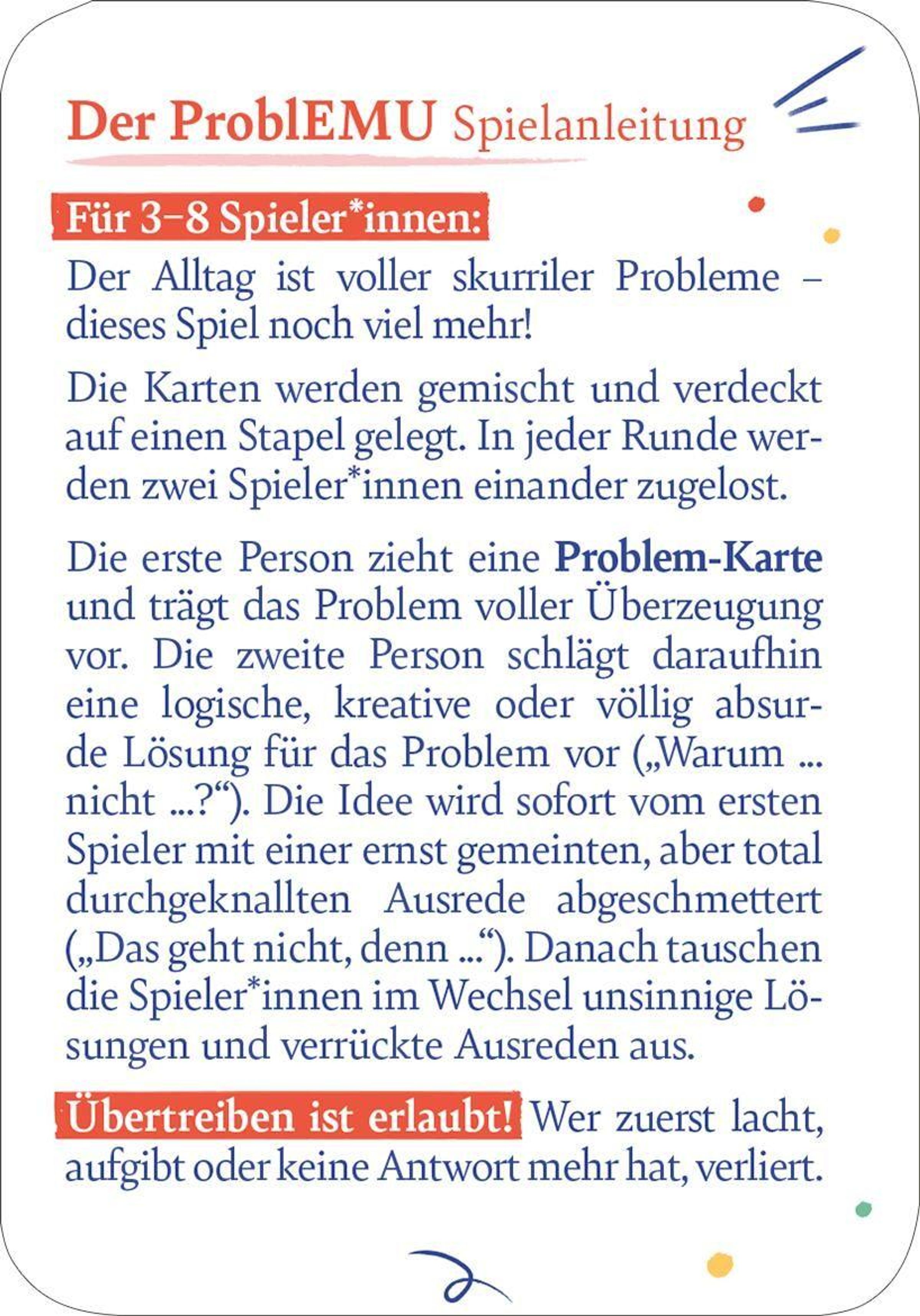 Mit diesem schrägen Partyspiel werdet ihr zu Problemlöserinnen und Ausredenkönigen! Diese liebevoll gestaltete Kartenbox mit 50 skurrilen und witzigen Problemlösungsaufgaben fordert euer Improvisationstalent heraus. Entwickelt absurde Lösungen, schlagfertige Ausreden und sorgt für jede Menge Gelächter. Perfekt für Partys, Geburtstage oder als originelles Mitbringsel!