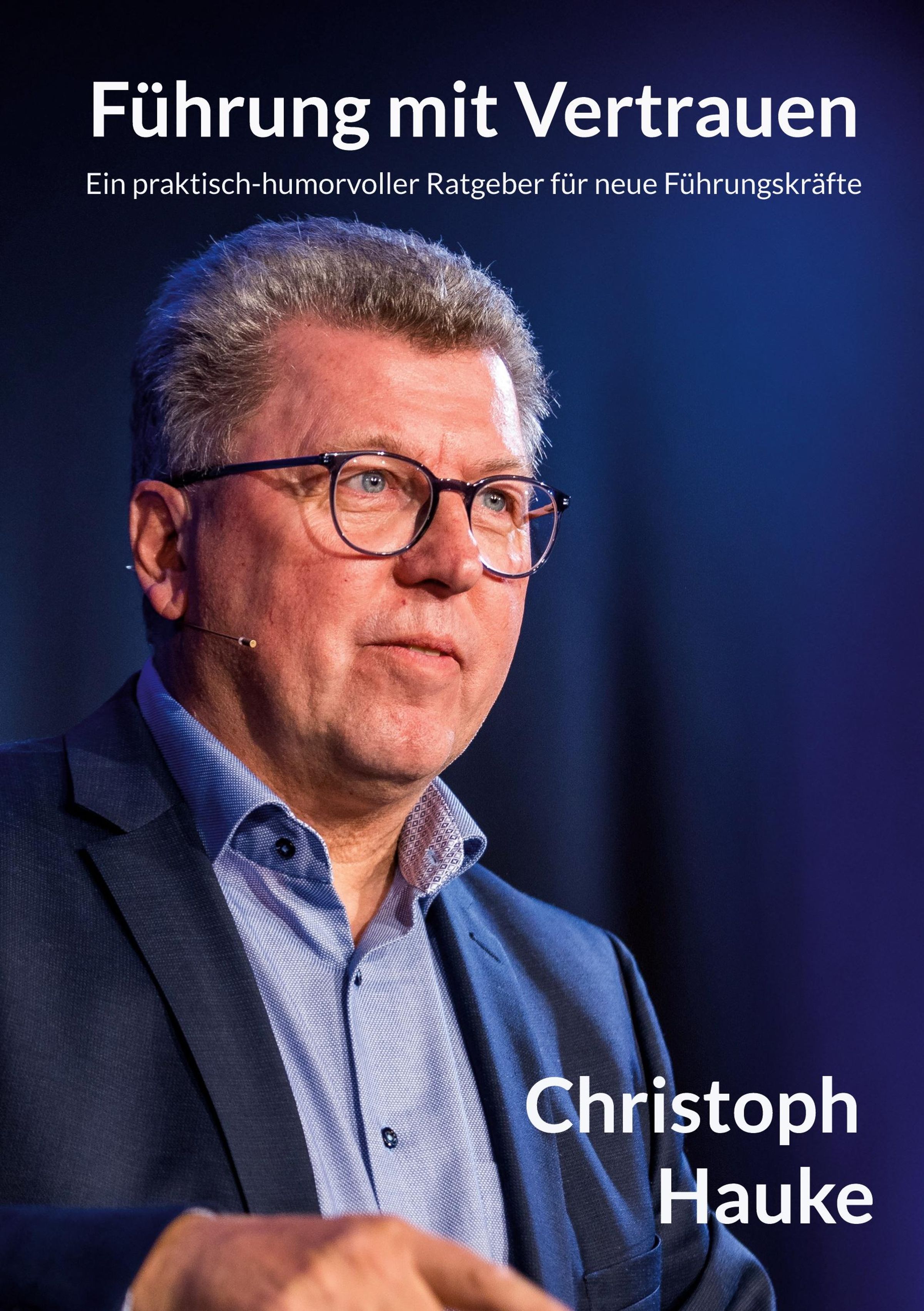 „Führung mit Vertrauen“, Ratgeber für Führungskräfte. Darunter der Name Christoph Hauke. Mann mit Brille und Anzug., Buch