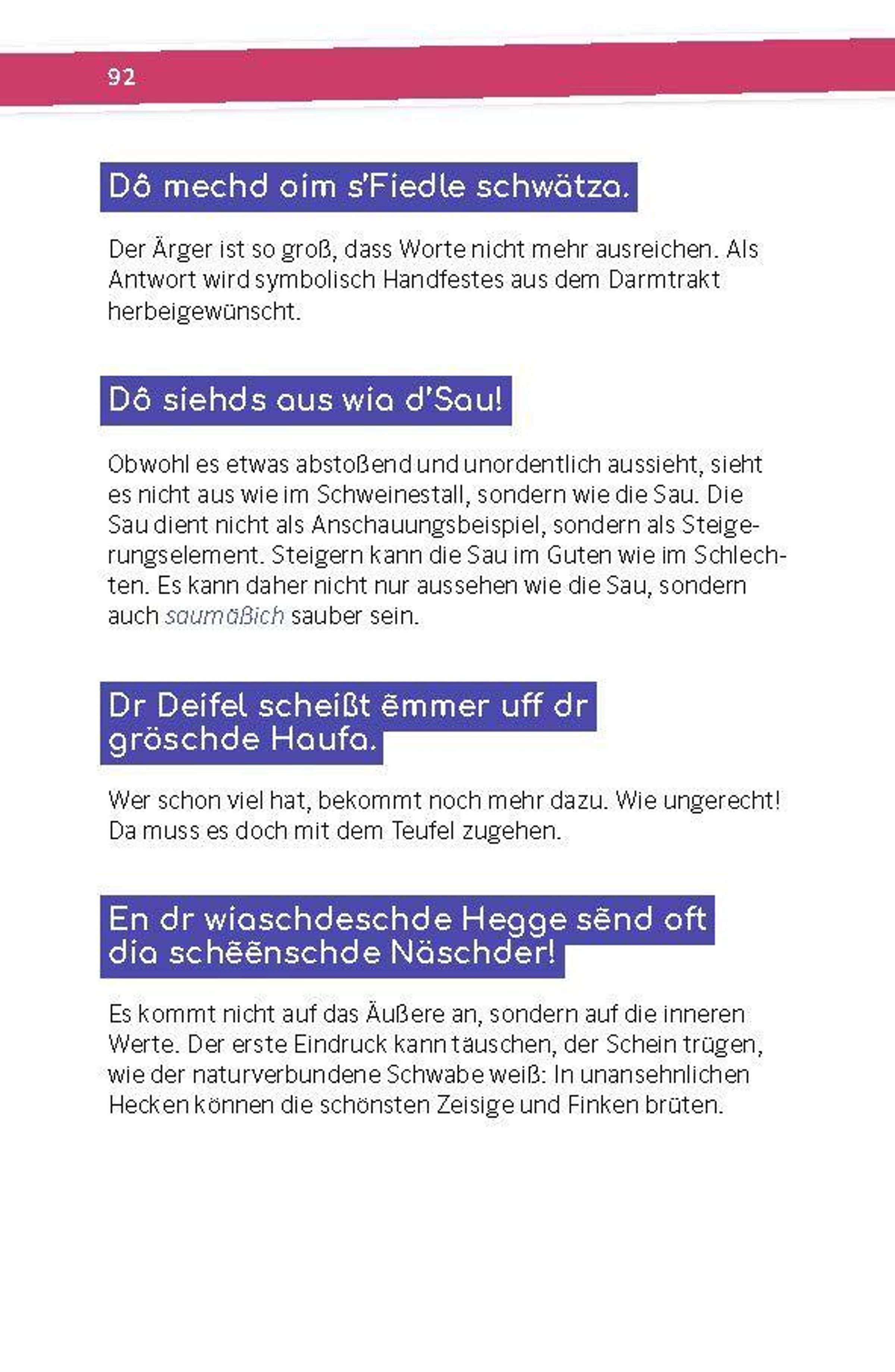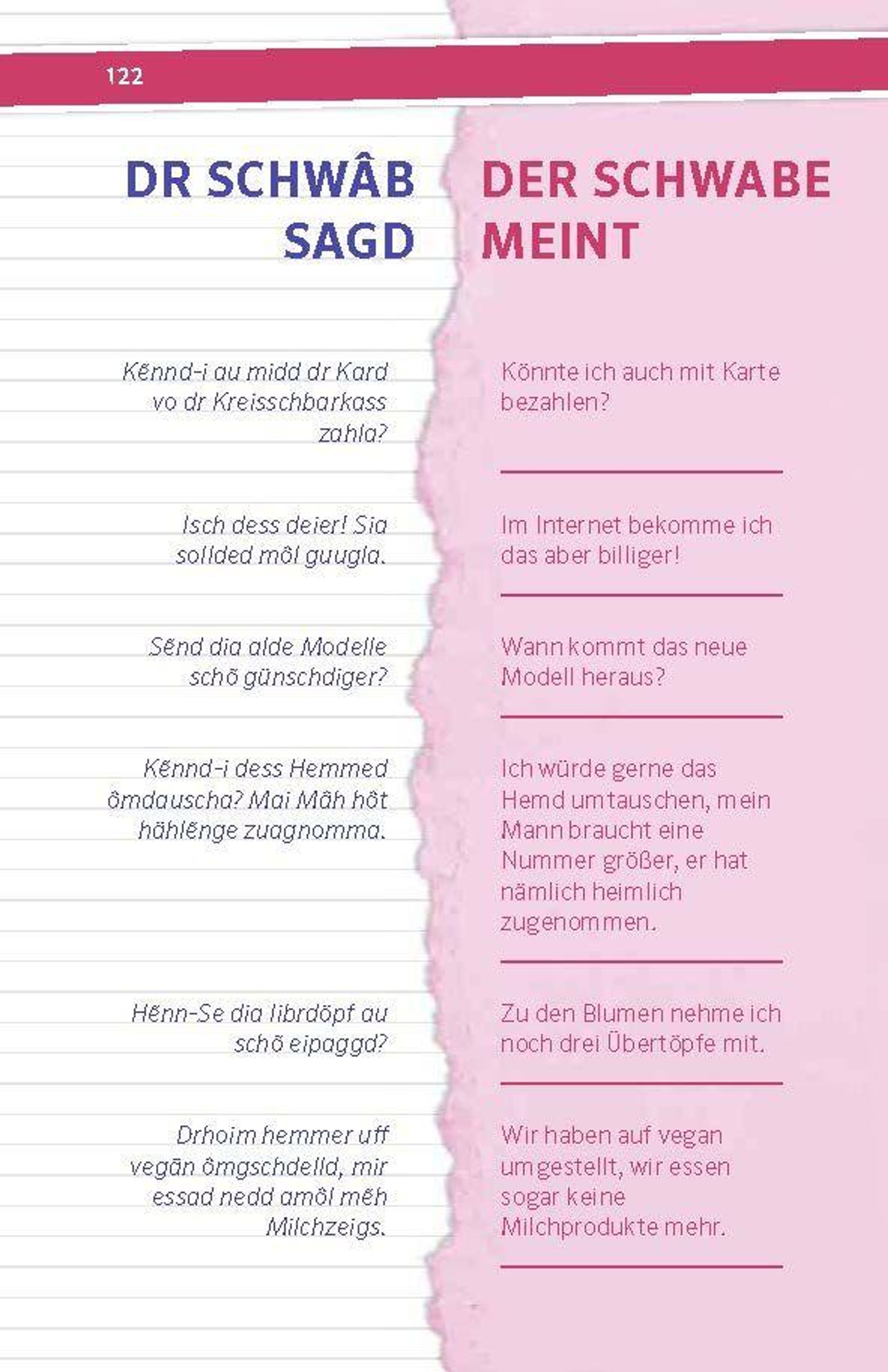 Anhand vieler charmanter Worterklärungen und Anekdoten lernen Sie die schwäbische Sprache und Mentalität mit all ihren Eigenheiten kennen und punkten so selbst bei den pedantischsten alt-eingesessenen Nachbarn! Auch das Eikaufa wird sprachlich ein voller Erfolg - frei nach dem Motto "Mir kaufet nix, mir gucket bloß" .