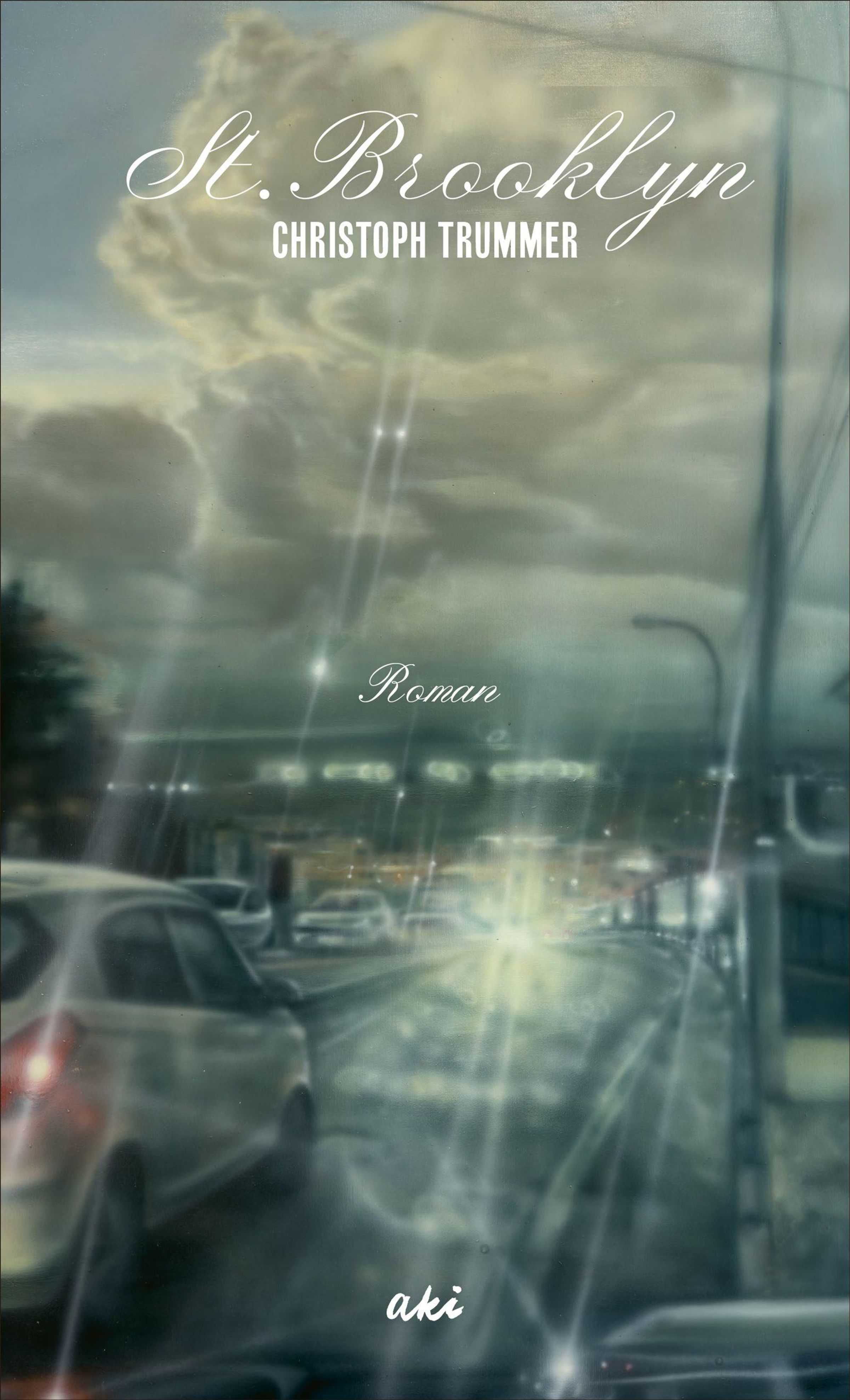 St. Brooklyn oben, Christoph Trummer darunter, Roman in Weiß in der Mitte; unscharfe Straßenszene bei Regen., Buch