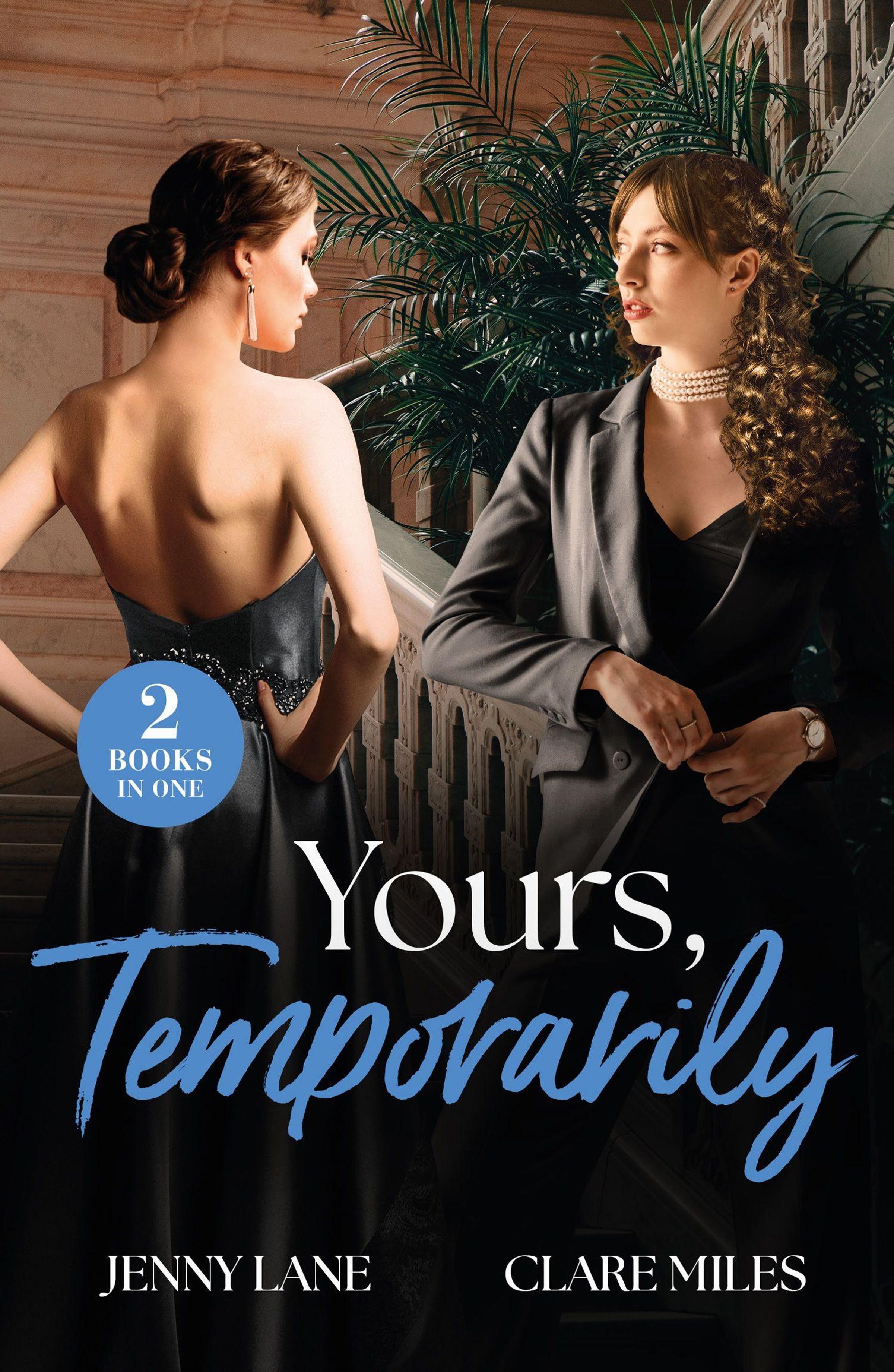 "2 Books in One. Yours, Temporarily. Jenny Lane. Clare Miles." Zwei elegante Frauen vor einer Treppe mit Pflanzen., Buch
