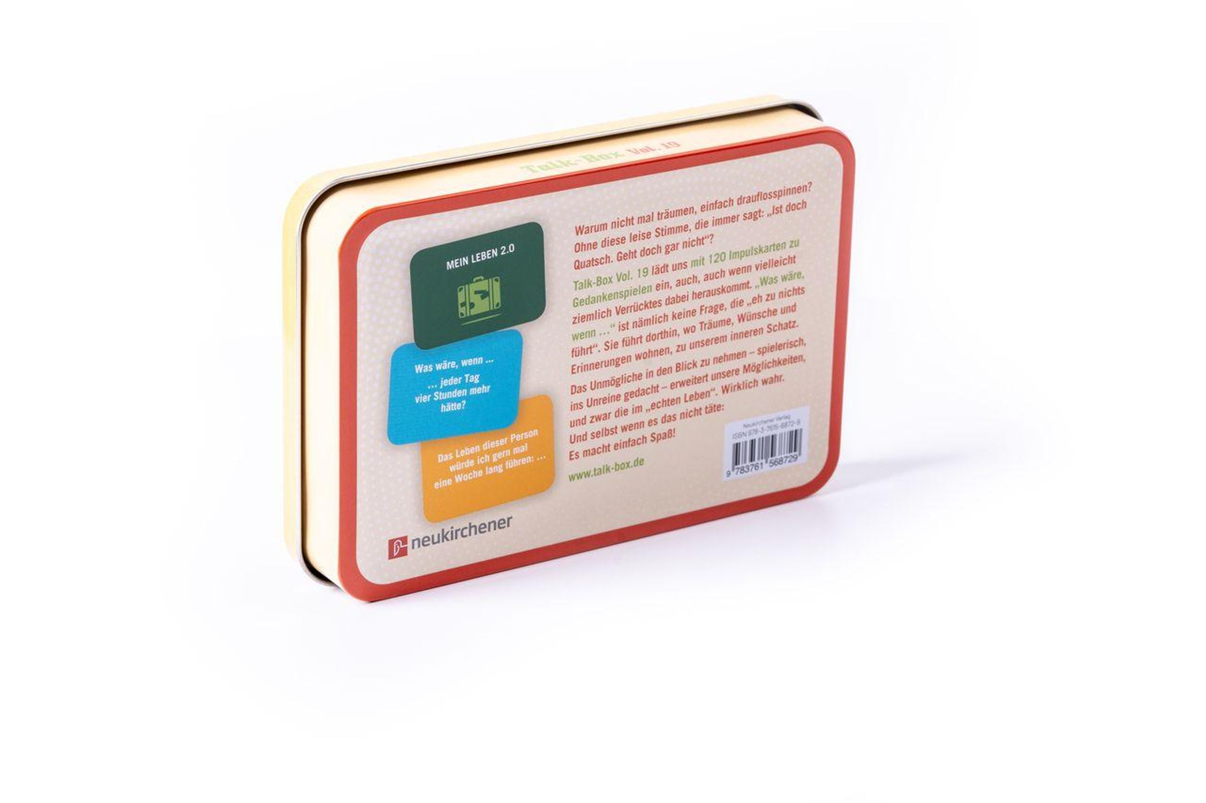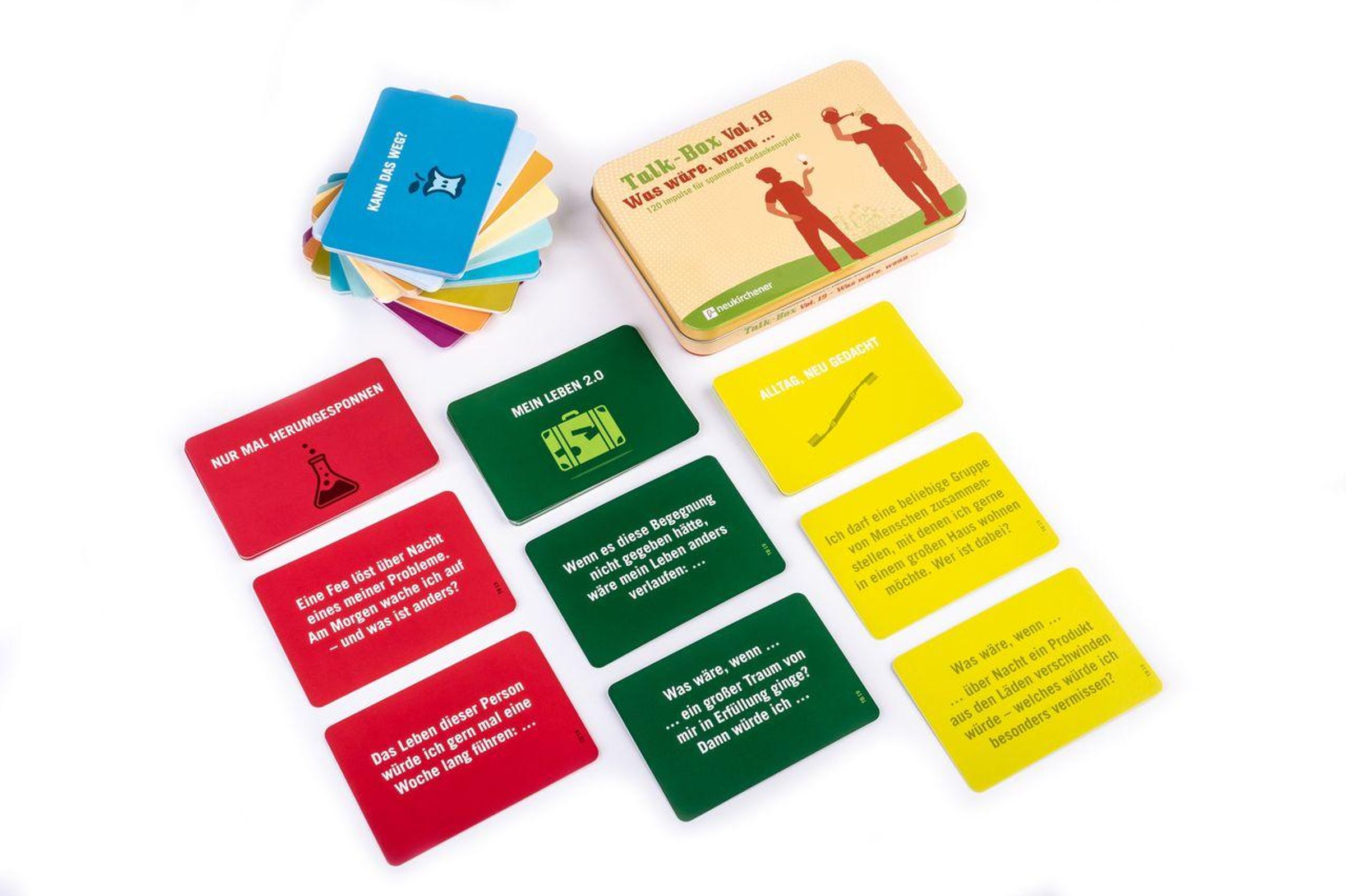 Die 120 Impulskarten laden dazu ein, die Fantasie spielen zu lassen - zum Beispiel beim Spieleabend im Freundeskreis, als Paar oder im Familienurlaub. Mit überraschenden Erkenntnissen für alle. Auch für Gemeindearbeit, Schule und Freizeitgruppen bietet diese Talk-Box spannende Einsatzmöglichkeiten. Was wäre, wenn Sie, du und ihr es einfach mal ausprobiert?