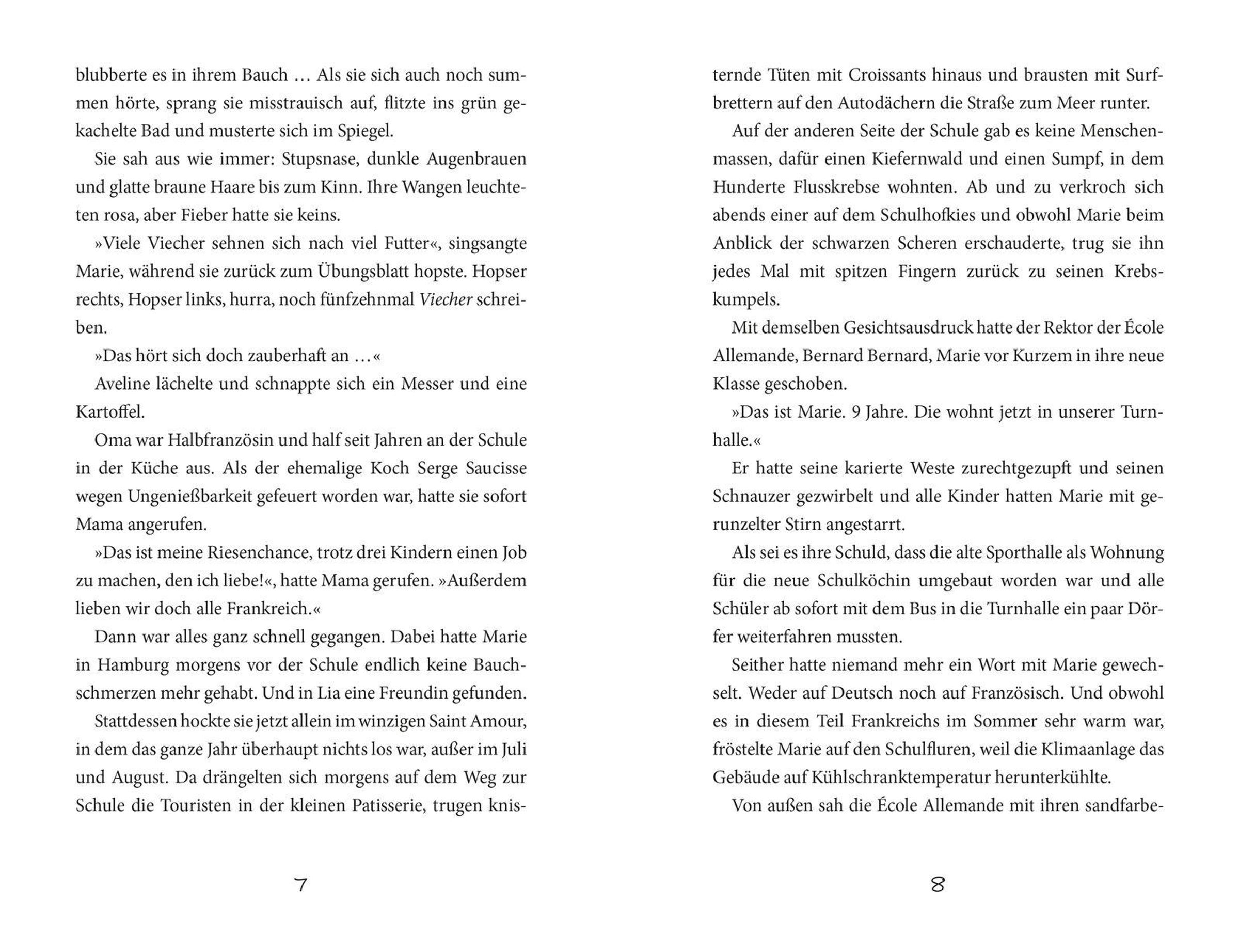 Ein Umzug nach Frankreich ? Marie ist nur mittelbegeistert, als ihre Mutter eine Stelle als Köchin an einer französischen Schule annimmt und die ganze Familie in einen kleinen Ort am Meer umzieht. Dass sie dort in einer alten Turnhalle wohnen, ist ja ganz witzig. Dass ihr Bruder fortan mit seinem Surfbrett zusammengewachsen ist - schön für ihn. Aber Marie fehlen ihre Freundinnen ! In der neuen Schule sind alle komisch.