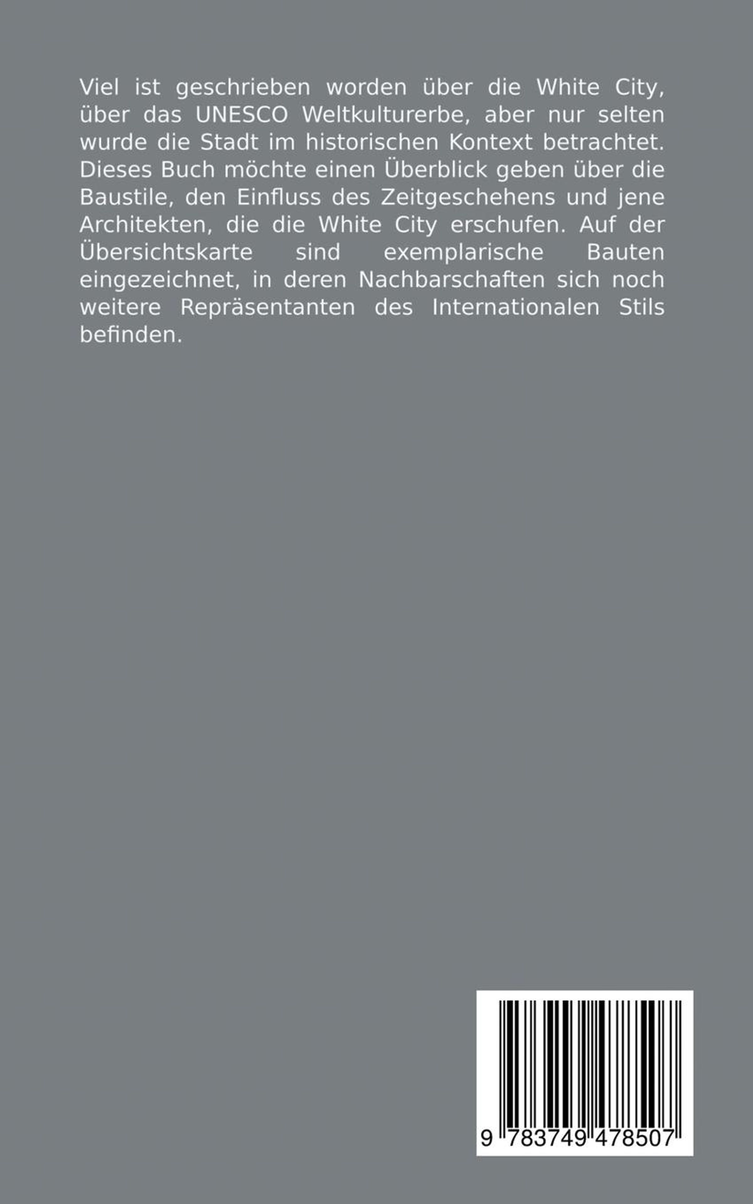 Viel ist geschrieben worden über die White City, über das UNESCO Weltkulturerbe, aber nur selten wurde die Stadt im historischen Kontext betrachtet. Dieses Buch möchte einen Überblick geben über die Baustile, den Einfluss des Zeitgeschehens und jene Architekten, die die White City erschufen. Auf der Übersichtskarte sind exemplarische Bauten eingezeichnet, in deren Nachbarschaften sich noch weitere Repräsentanten des Internationalen Stils befinden.