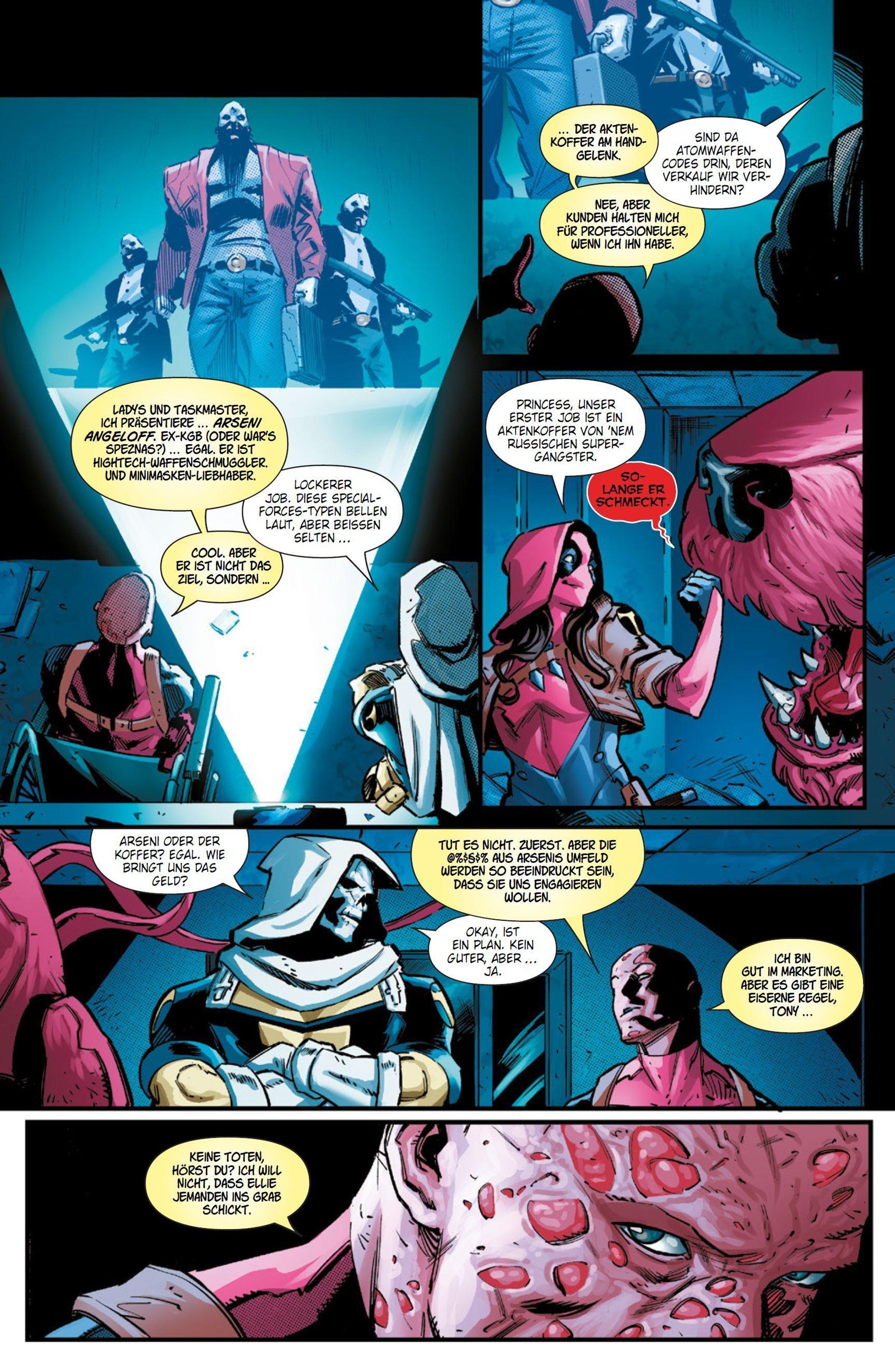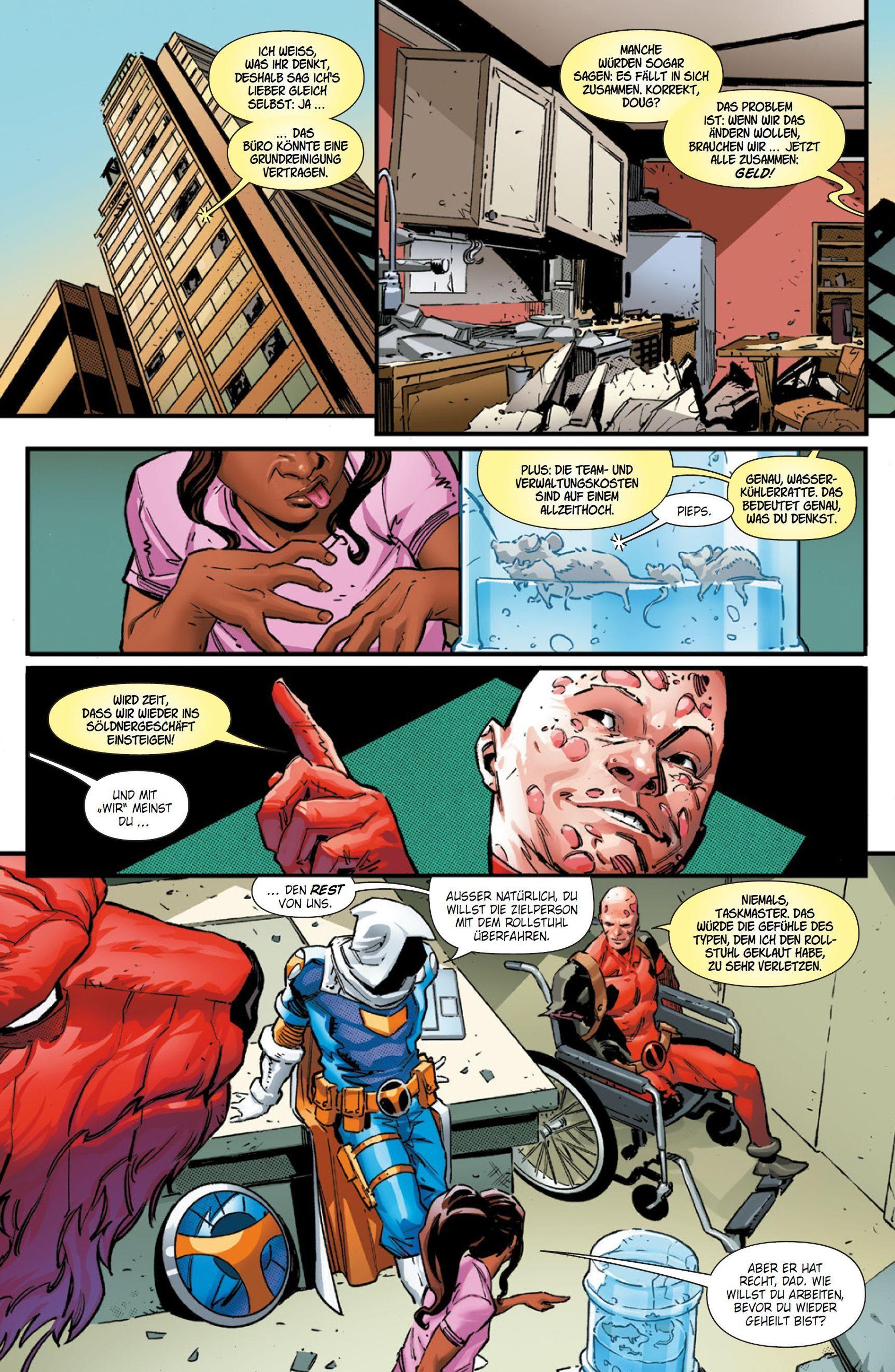DEADPOOL IST TOT! Aber lang lebe Deadpool? Und ob! Denn Wade Wilsons Tochter Ellie tritt in die Fußstapfen ihres Vaters! Taskmaster setzt ihr Söldnertraining fort, aber Ellie will eigentlich nur eines: Rache! Und um die zu kriegen, braucht sie die Hilfe ihrer ... äh, "Symbiontenhundeschwester" Princess und einer alten Freundin ihres Vaters. Aber dann sieht es so aus, als wäre Ellies Karriere vorbei, noch ehe sie begonnen hat: Sie trifft von Angesicht zu Riesengesicht auf den Mega-Schurken MODOK!