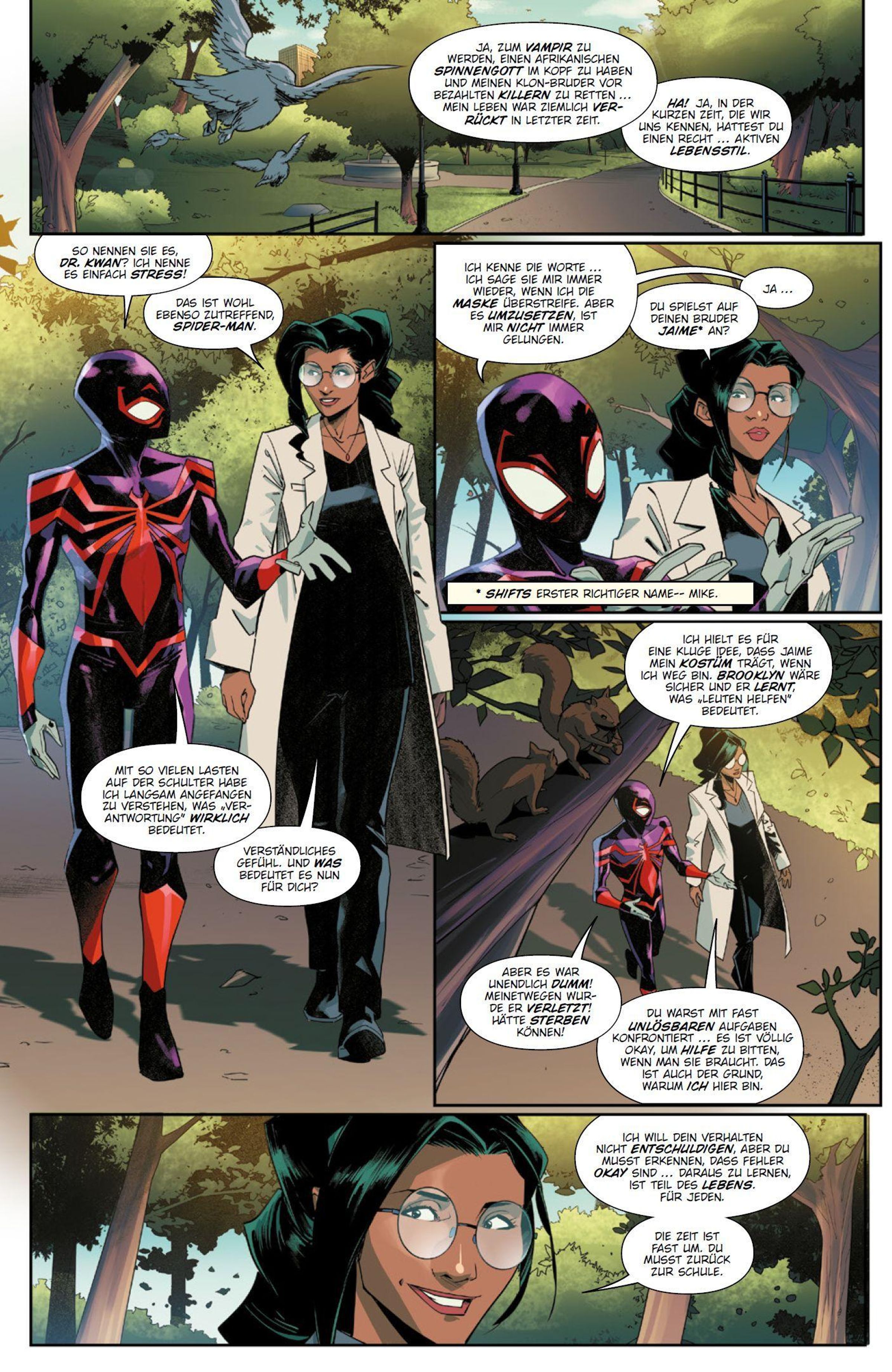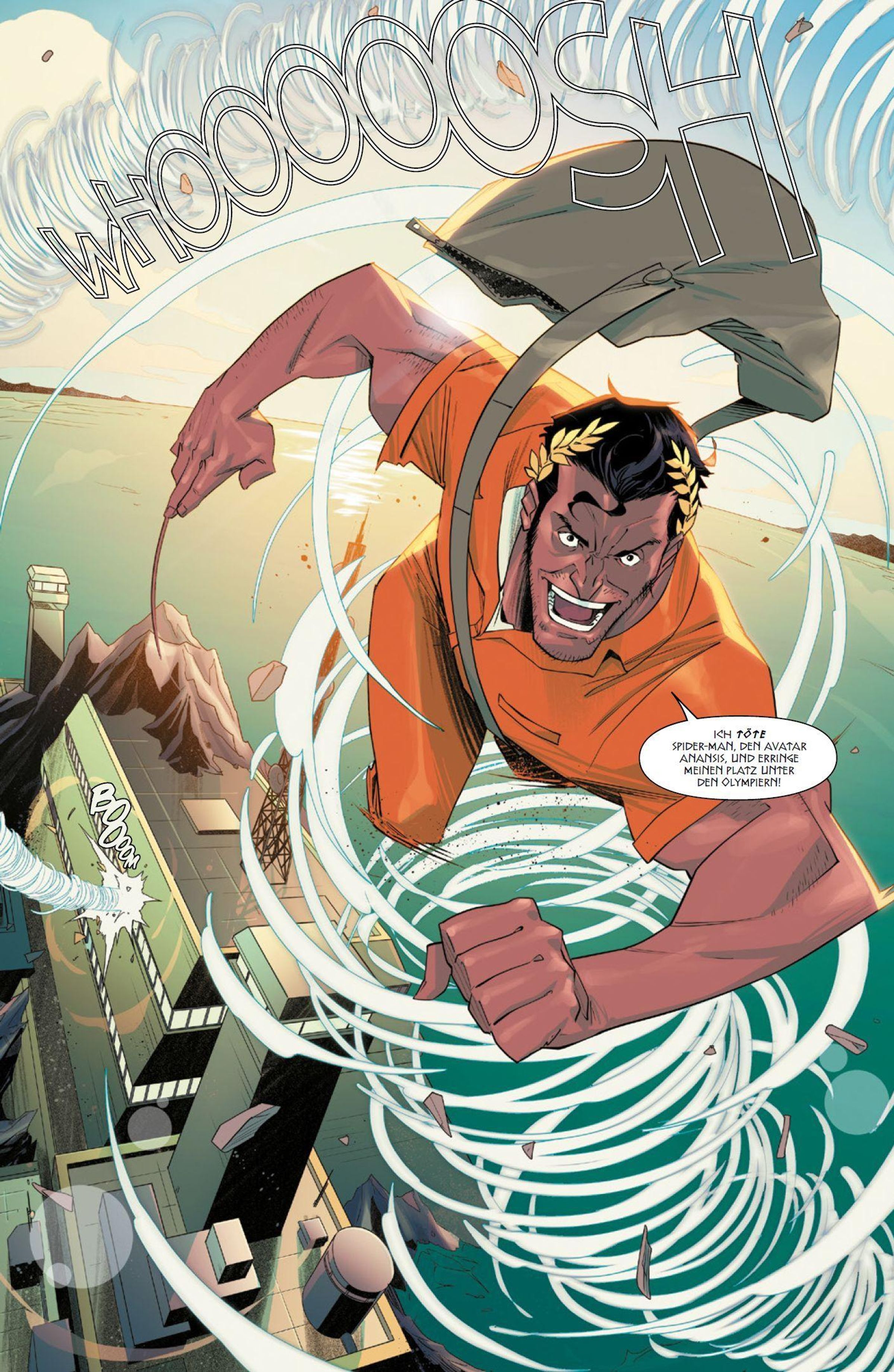 GÖTTLICHES CHAOS Neuerdings ist Nachwuchs-Netzschwinger Miles Morales auch der Herold des alten afrikanischen Spinnengottes Anansi - und ein Gott kommt selten allein! Gut, dass Thor und Hercules bereitstehen, um Spidey gegen den göttlich verstärkten Zip Zephyr zu helfen. Dann fordert Anansi aber auch noch Kriegsgott Ares und andere göttliche Wesen zu einem Wettstreit heraus, in dem Miles und seine Freunde antreten müssen. Doch Anansi spielt wie üblich nicht mit offenen Karten.