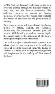 In "The Poetry of Forever," readers are invited on a profound journey through the timeless echoes of love, loss, and the human experience. This collection captures the essence of fleeting moments, weaving together verses that celebrate the beauty of existence and the permanence of memory. Each poem serves as a delicate thread, interlacing themes of nature, longing, and resilience, illuminating the connection between past and present. With lyrical grace and an emotive depth, the author explores the intricacies of the heart, inviting contemplation and reflection. This book is not just a compilation of poems; it is an odyssey into the soul, a testament to the enduring power of words to transcend time. "The Poetry of Forever" is a must-read for anyone seeking solace and inspiration in the melody of life's eternal rhythms.