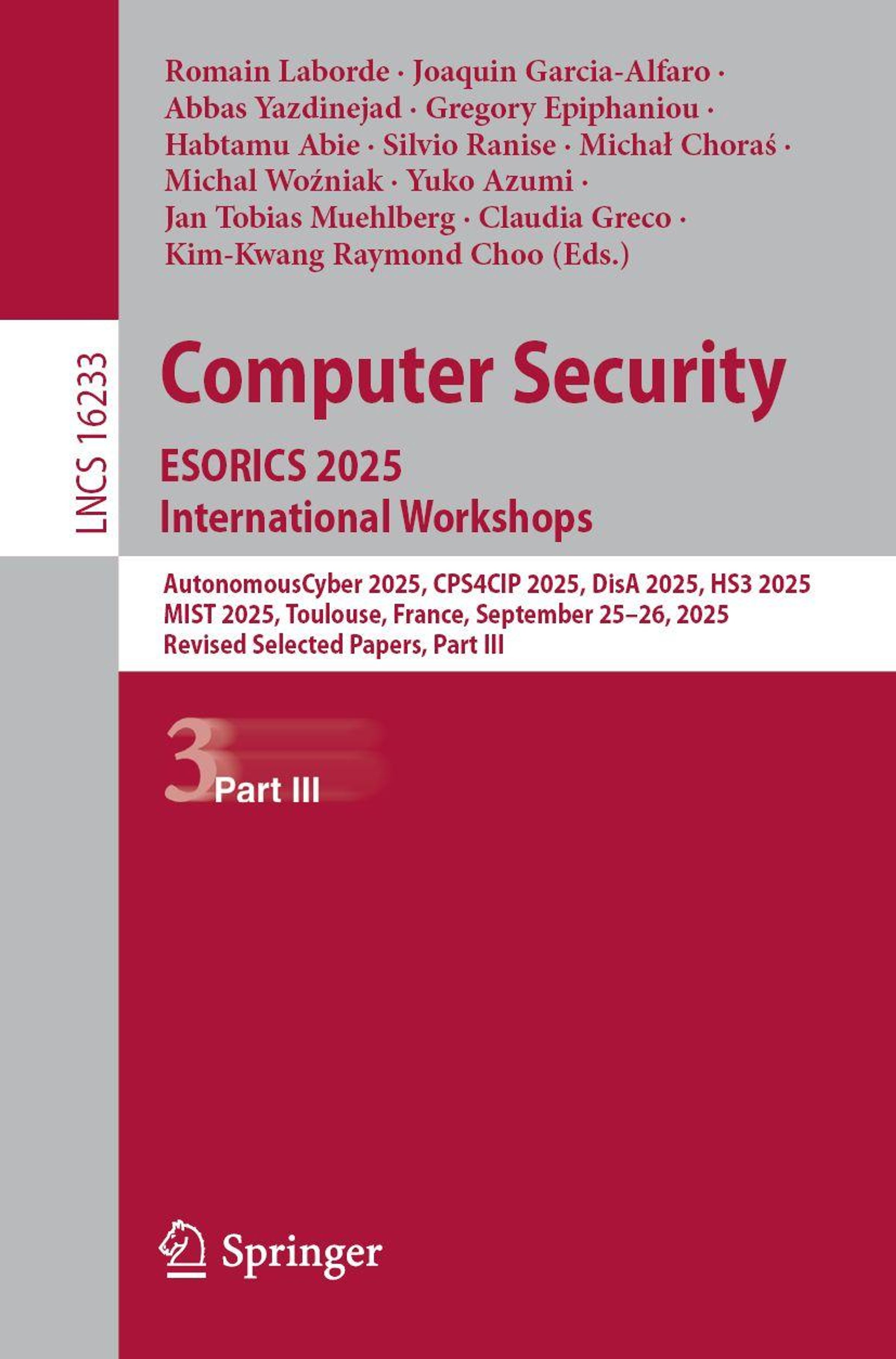 • AutonomousCyber 2025, CPS4CIP 2025, DisA 2025, HS3 2025, MIST 2025, Toulouse, France, September 25-26, 2025, Revised Selected Papers, Part III