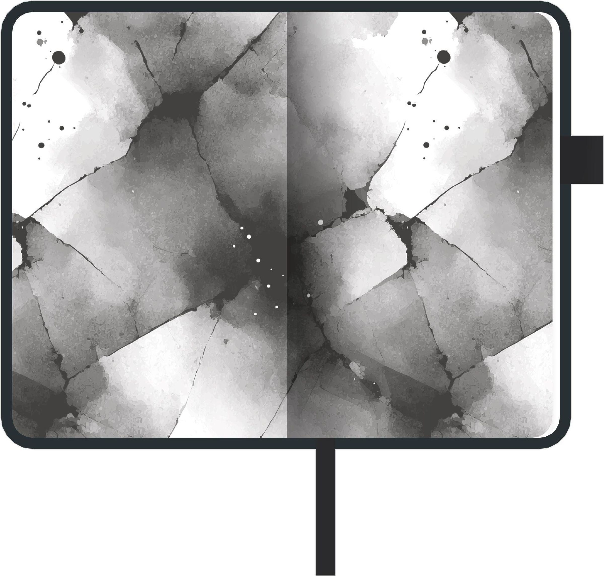 Edle Ausstattung: Schwarzer Umschlag mit widerstandsfähiger Oberfläche, gestaltete Vorsatzpapiere, Elastikbandverschluss, Stifthalter & Lesebändchen