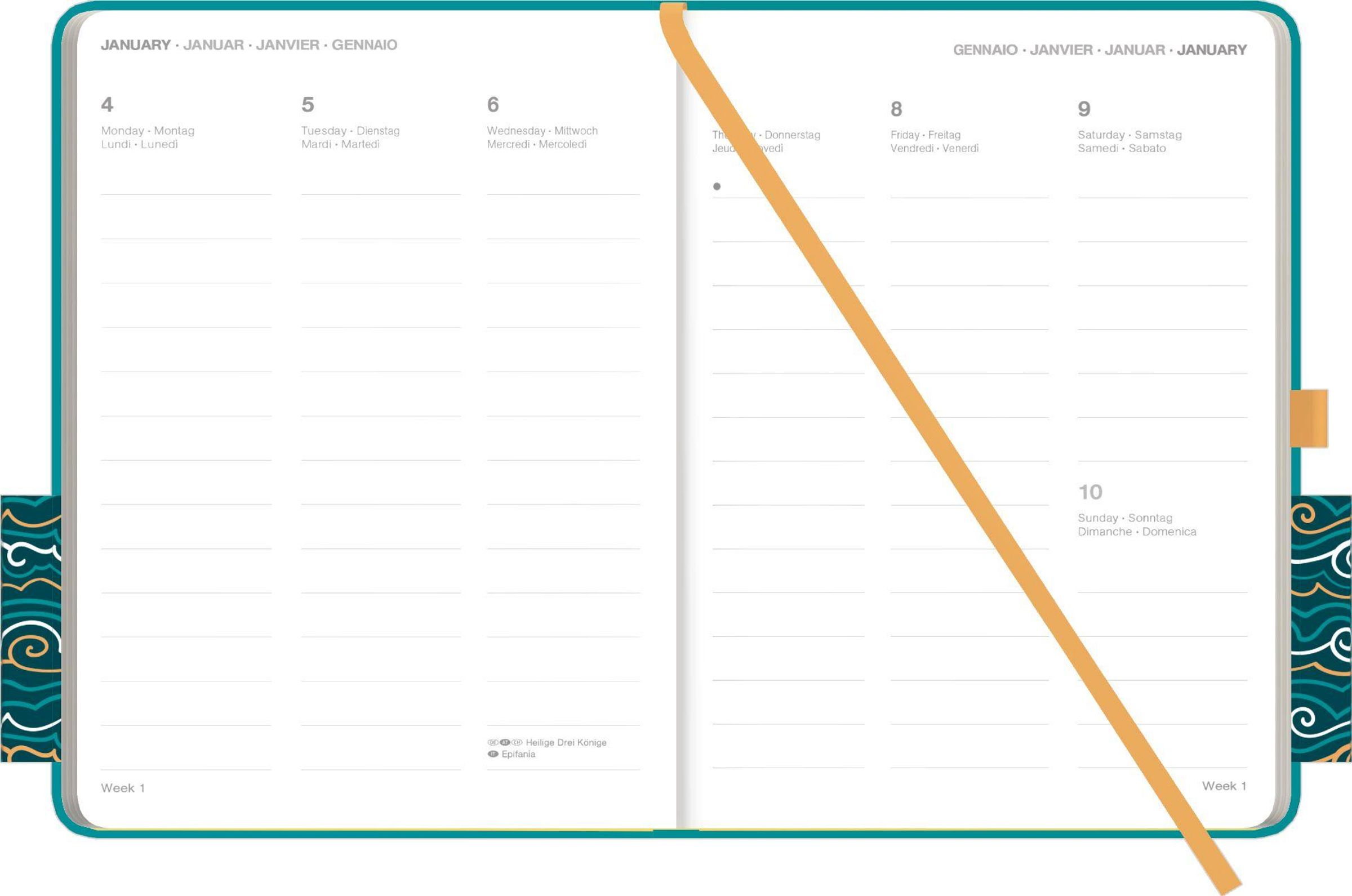 Der Cool Diary Teal Ocean Kalender 2027 vereint stilvolles Design mit praktischer Organisation. Mit edlem Einband, durchdachten Extras und übersichtlicher Wochenplanung ist er der perfekte Begleiter für Termine, Notizen und Ideen.