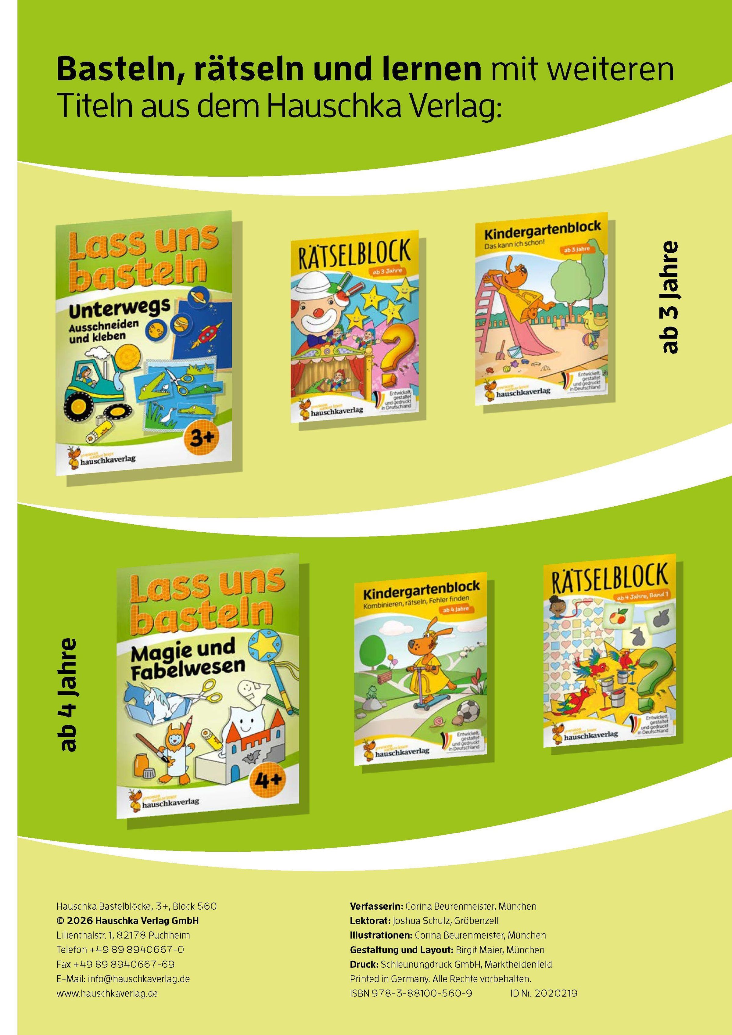 Aufgepasst, wir basteln! Mit unserer Bastelblock-Reihe können Kinder von 3 bis 5 Jahren kreativ werden. Ob schneiden, kleben, falten oder gestalten - die vielfältigen Bastelvorlagen bieten altersgerechte und bunte Ideen, die motorische Fähigkeiten fördern und stundenlangen Bastelspaß garantieren. Die Blöcke ab 3 Jahren sind als Ausschneidebuch konzipiert, um den ersten Umgang mit Schere und Kleber zu trainieren. In den Bastelblöcken ab 4 und ab 5 Jahren entstehen aus den vorgegebenen Papiervorlagen mit Schere, Kleber und Alltagsgegenständen wie Klorollen, Zahnstochern oder Streichholzschachteln kreative Kunstwerke - perfekt für kleine Bastelfans!