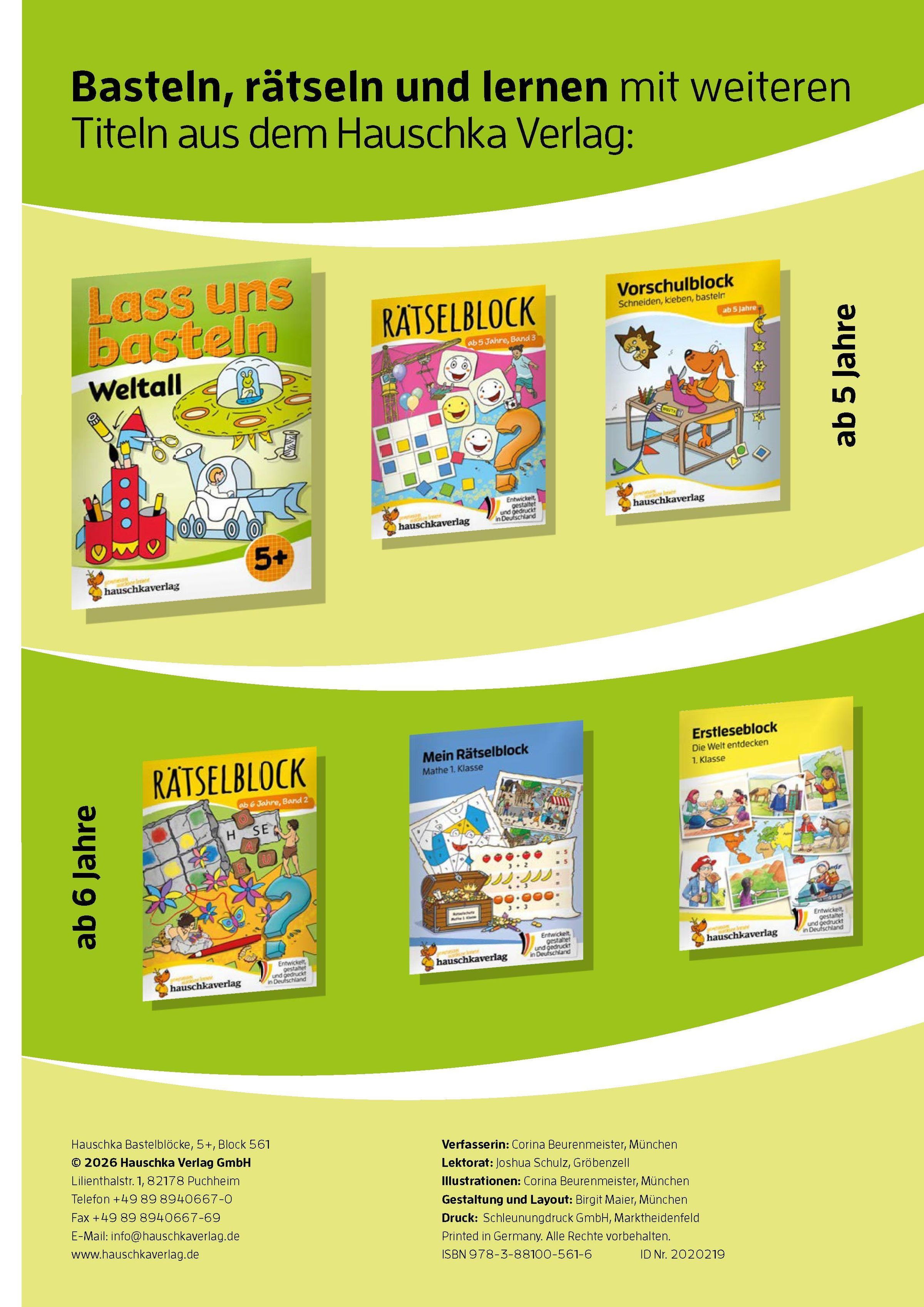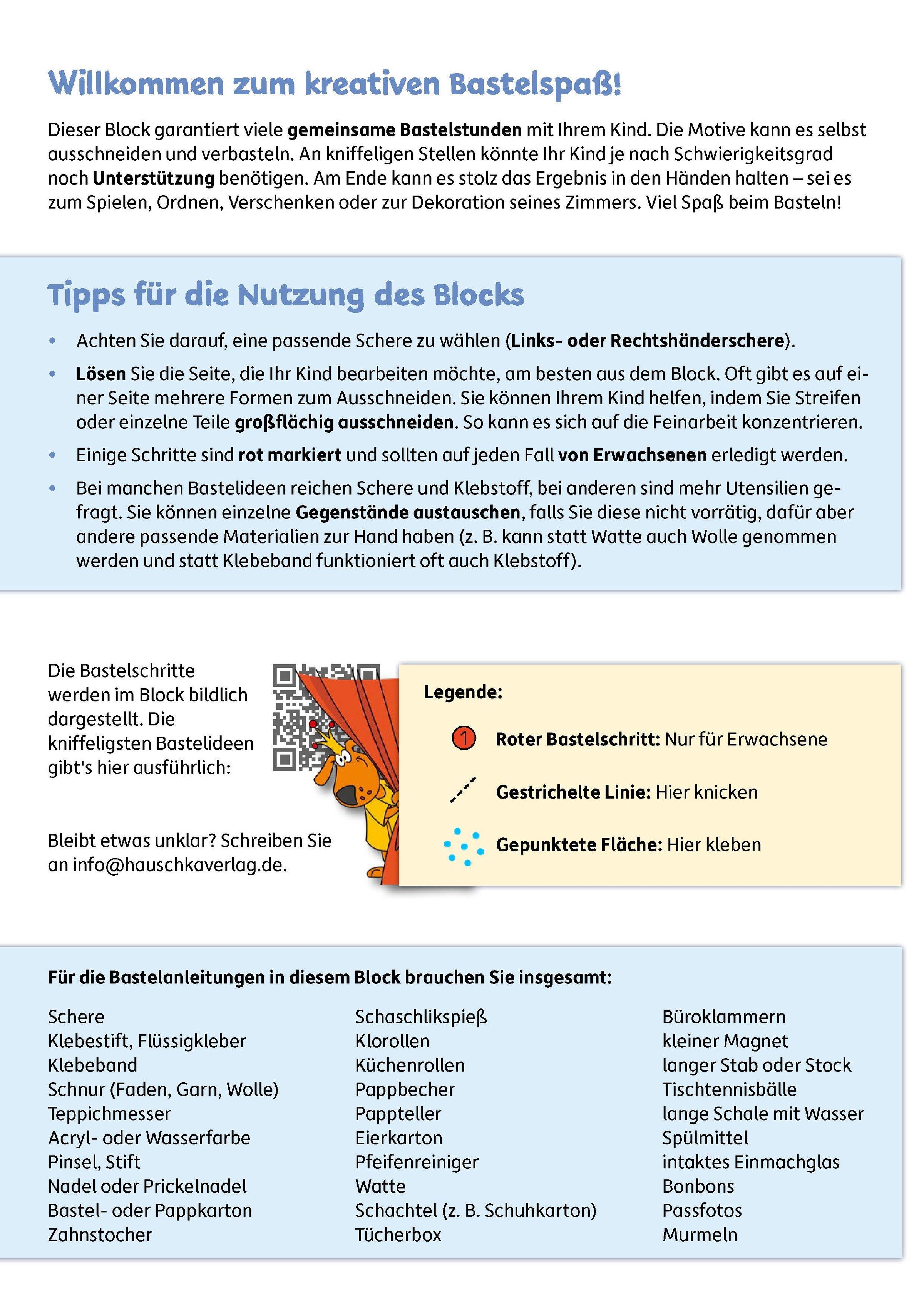 Aufgepasst, wir basteln! Mit unserer Bastelblock-Reihe können Kinder von 3 bis 5 Jahren kreativ werden. Ob schneiden, kleben, falten oder gestalten - die vielfältigen Bastelvorlagen bieten altersgerechte und bunte Ideen, die motorische Fähigkeiten fördern und stundenlangen Bastelspaß garantieren. Die Blöcke ab 3 Jahren sind als Ausschneidebuch konzipiert, um den ersten Umgang mit Schere und Kleber zu trainieren. In den Bastelblöcken ab 4 und ab 5 Jahren entstehen aus den vorgegebenen Papiervorlagen mit Schere, Kleber und Alltagsgegenständen wie Klorollen, Zahnstochern oder Streichholzschachteln kreative Kunstwerke - perfekt für kleine Bastelfans!