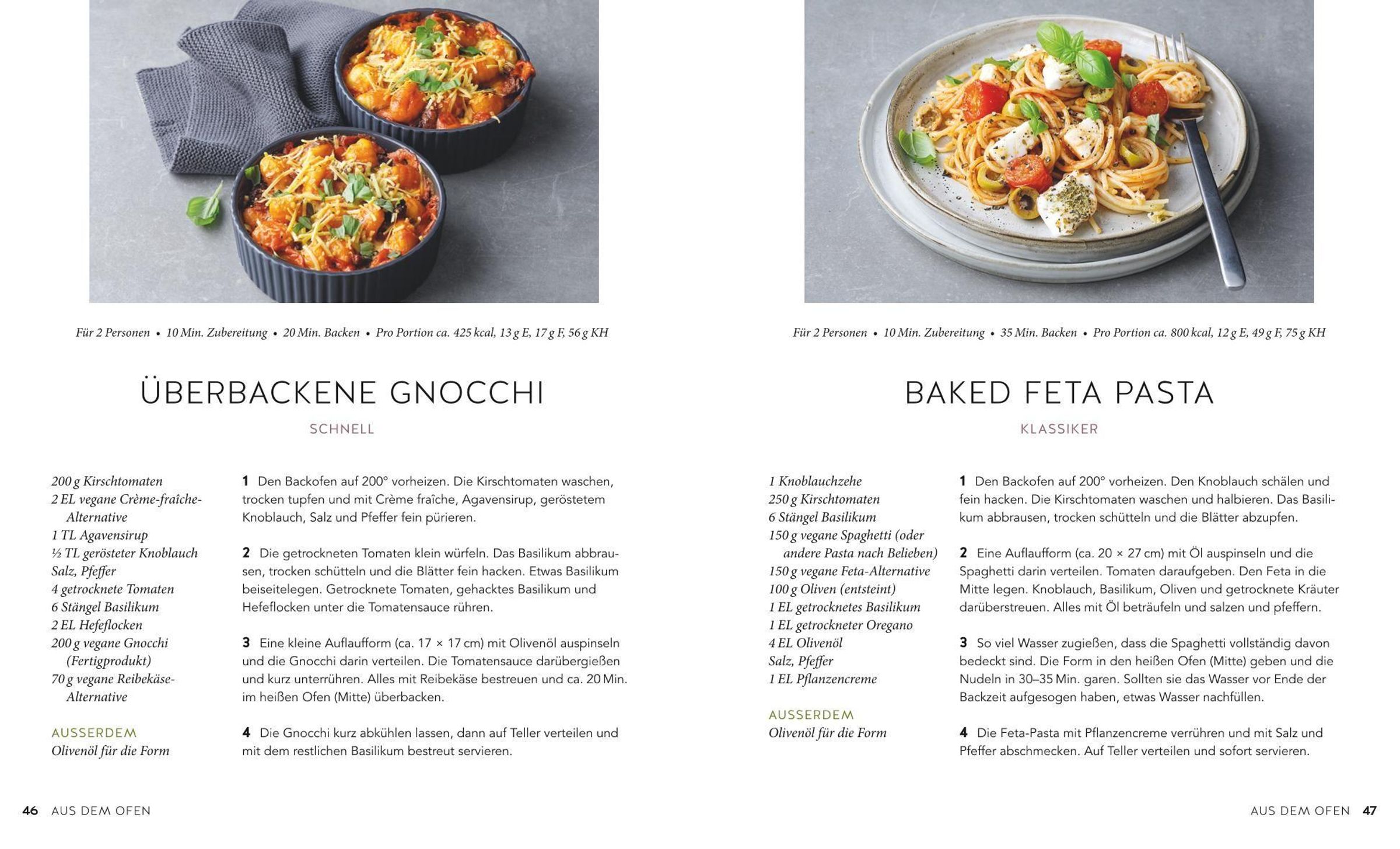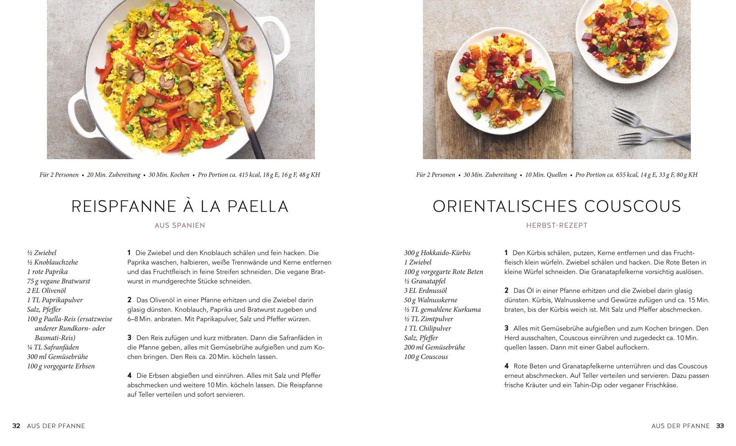 Nicht nur aus dem Topf, auch aus Pfanne sowie von einem Backblech kommen die Mahlzeiten auf den Tisch. Neben einem Schneidebrett und Messer muss somit immer nur ein weiteres Küchenaccessoire gespült werden. Gemüse, Getreide, Hülsenfrüchte, Nussmus, vegane Alternativen sowie Gewürze ergeben nicht nur saftige und würzige Aromen, sondern sorgen auch für Genuss ohne ethische Bedenken.