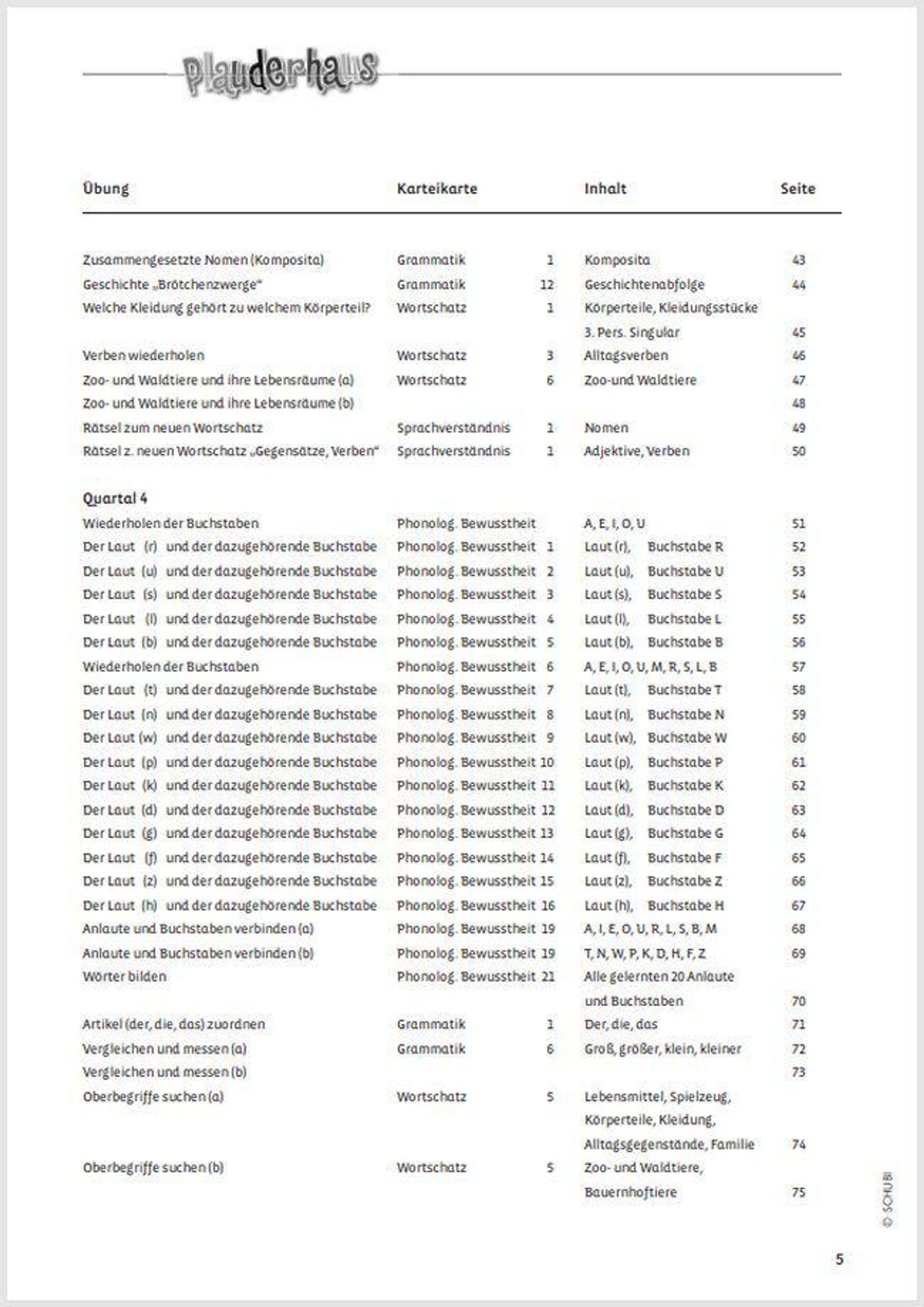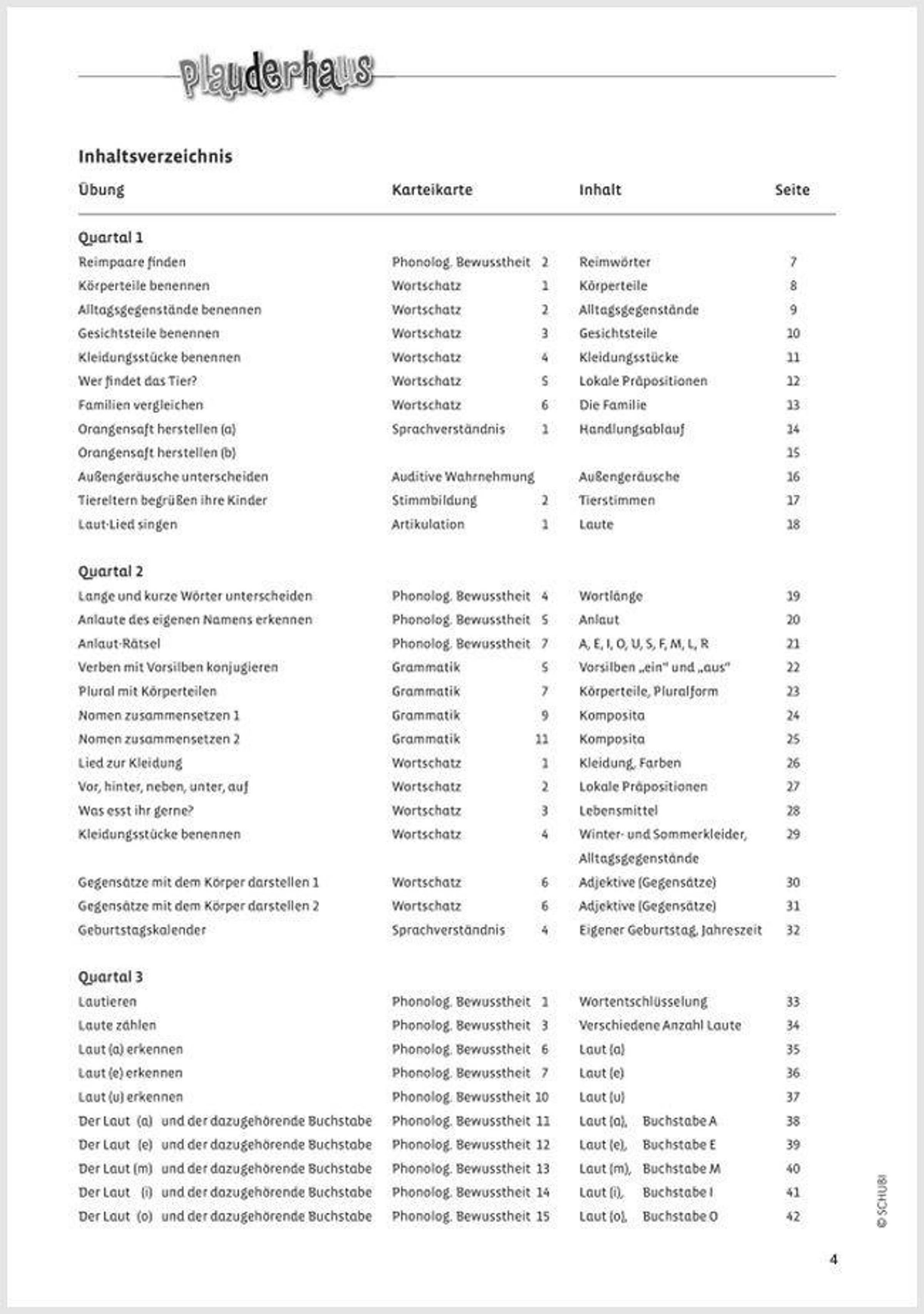 Inhalt : 68 Übungen, geordnet nach vier Quartalen und den Sprachbereichen Wortschatz, Sprachverständnis, Auditive Wahrnehmung, Stimmbildung, Artikulation, Phonologische Bewusstheit und Grammatik, didaktische Hinweise.