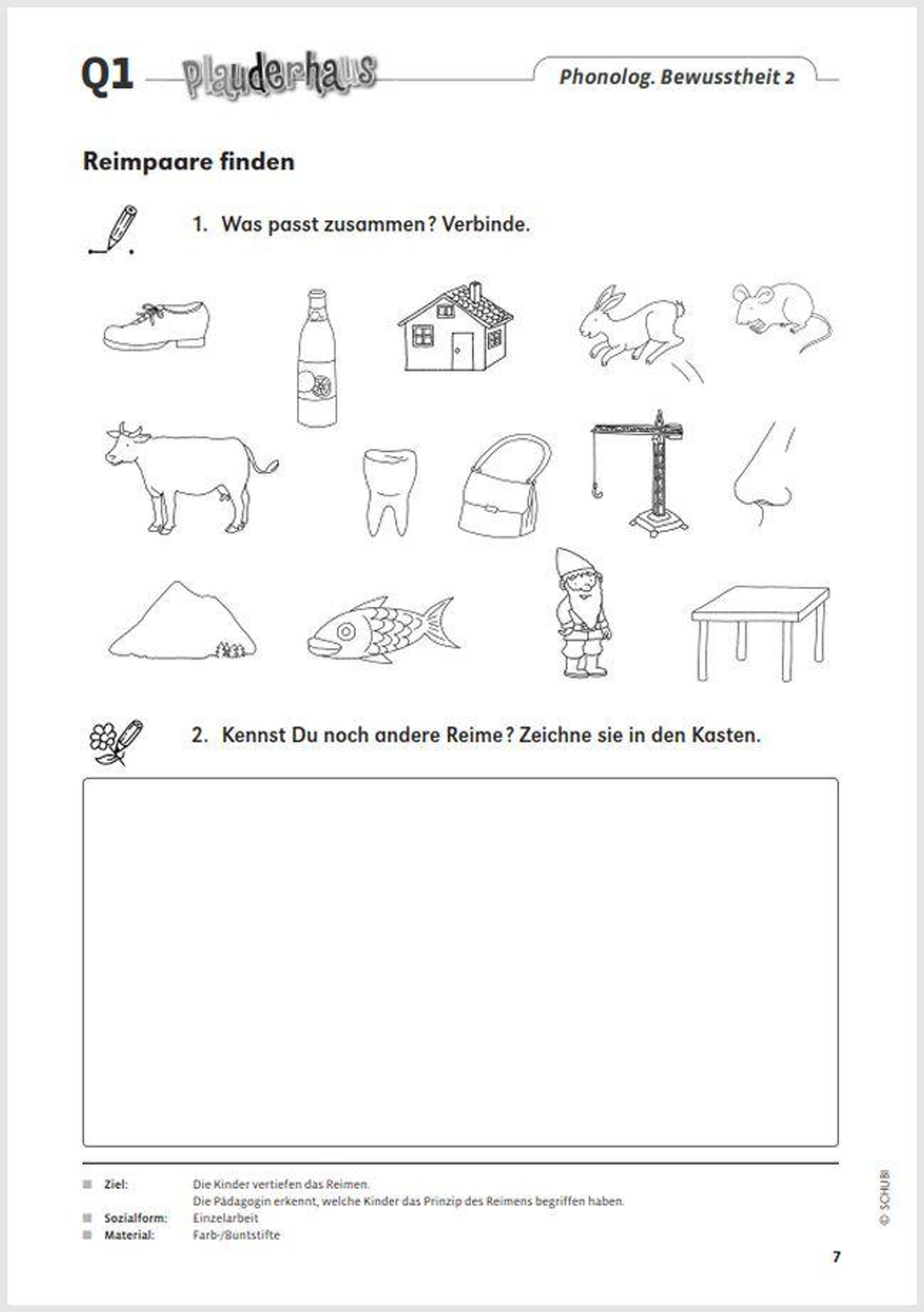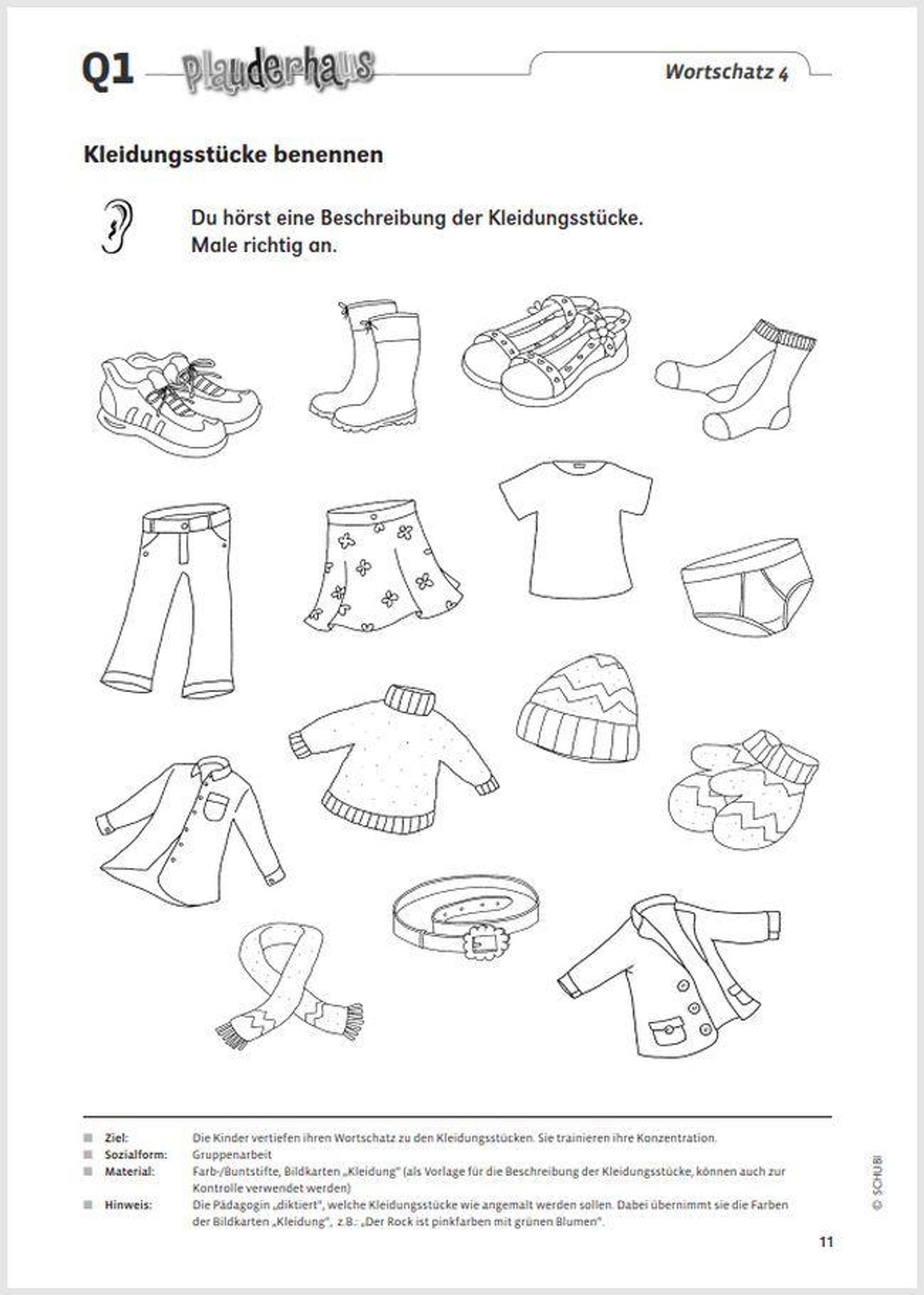Die Kinder malen und schneiden aus, ordnen zu, verbinden, gestalten und zeichnen. Dabei wenden sie den neuen Wortschatz an und festigen ihn, teilen Nomen der richtigen Artikelgruppe (der, die, das) zu, schneiden Bilder aus und kleben sie in einer logischen Handlungsabfolge auf, verbinden gelernte Laute und die dazugehörenden Buchstaben und müssen bei Rätseln ganz genau hinhören, um das gesuchte Wort zu finden.