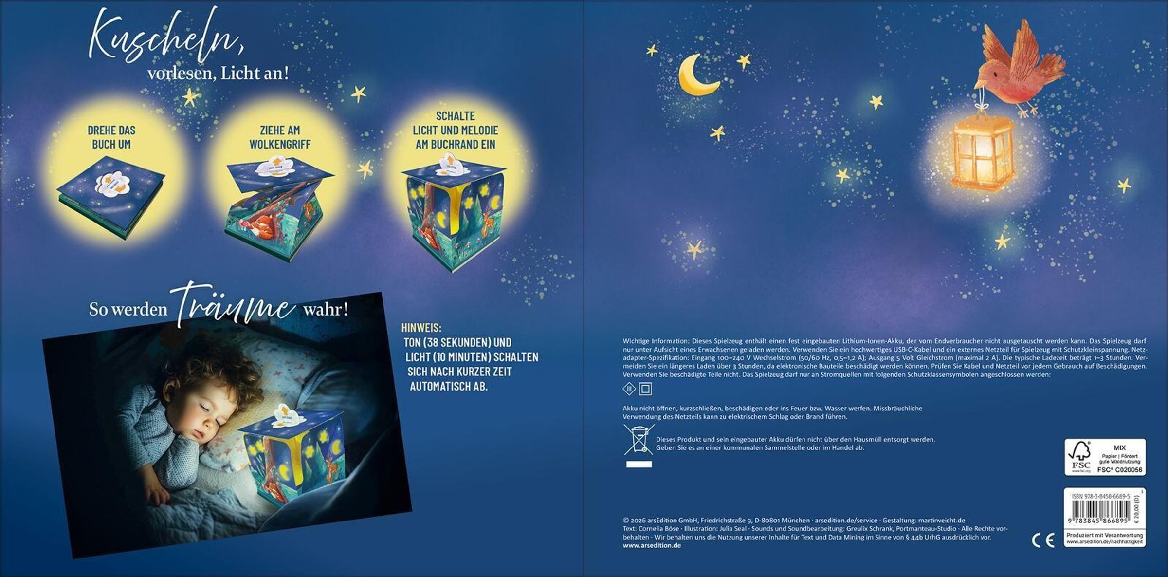 - **Liebevolle Einschlafbegleitung:**Das Einschlafbuch mit integrierter Laterne unterstützt das abendliche Ritual mit sanftem Licht und beruhigender Melodie.