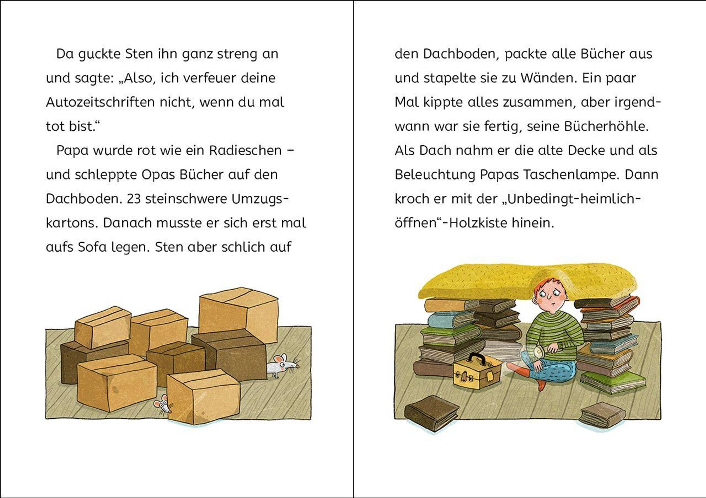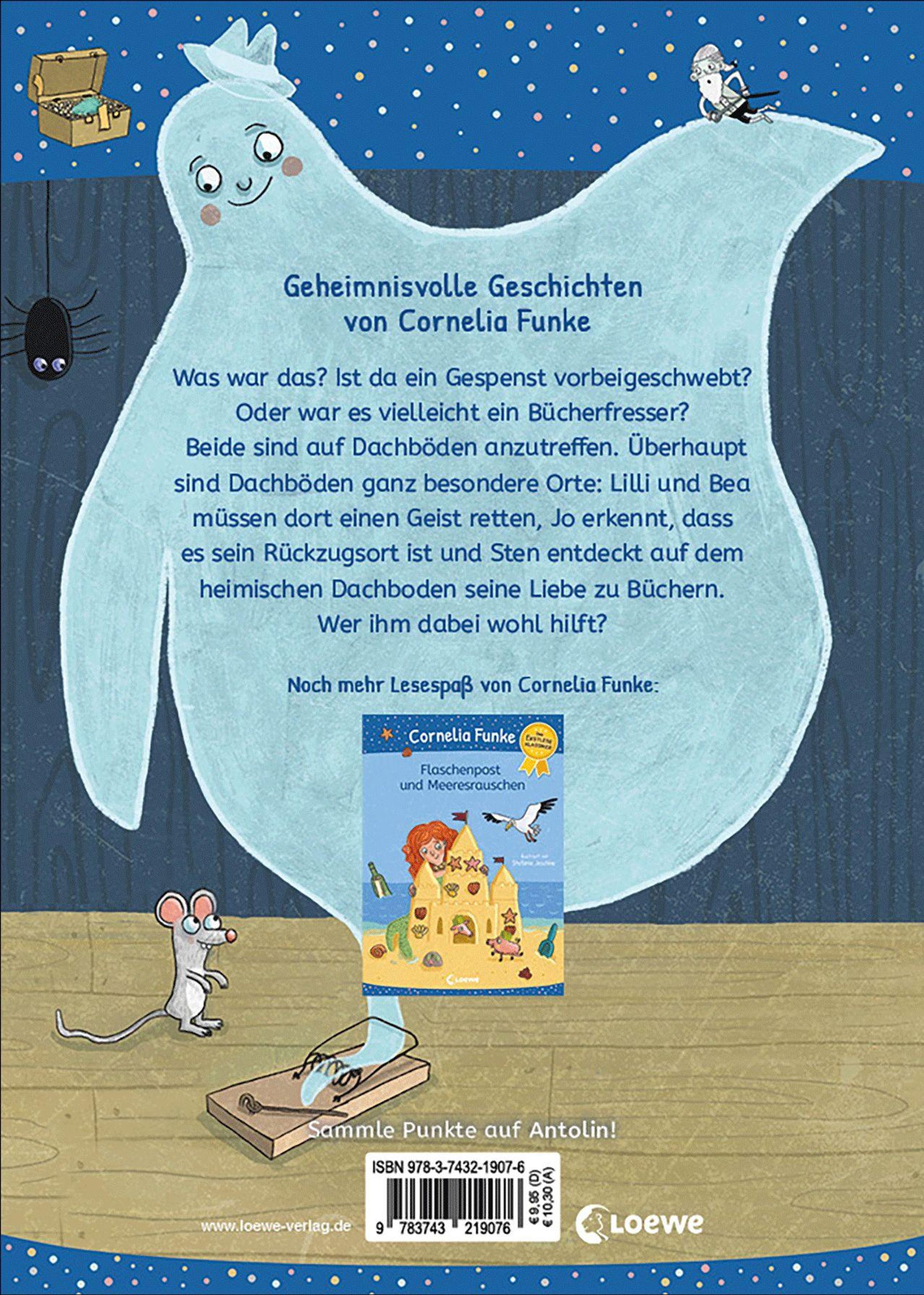 Geheimnisvolle Geschichten von Cornelia Funke Was war das? Ist da ein Gespenst vorbeigeschwebt? Oder war es vielleicht doch der seltene Bücherfresser? Denn beide sind auf Dachböden anzutreffen. Überhaupt können das ganz besondere Orte sein. So müssen Lilli und Bea einen Geist retten, Jo lernt, dass der heimische Dachboden sein Rückzugsort ist, Mäuse dürfen natürlich nicht fehlen und Sten entdeckt dort seine Liebe zu Büchern. Wer ihm dabei wohl hilft?