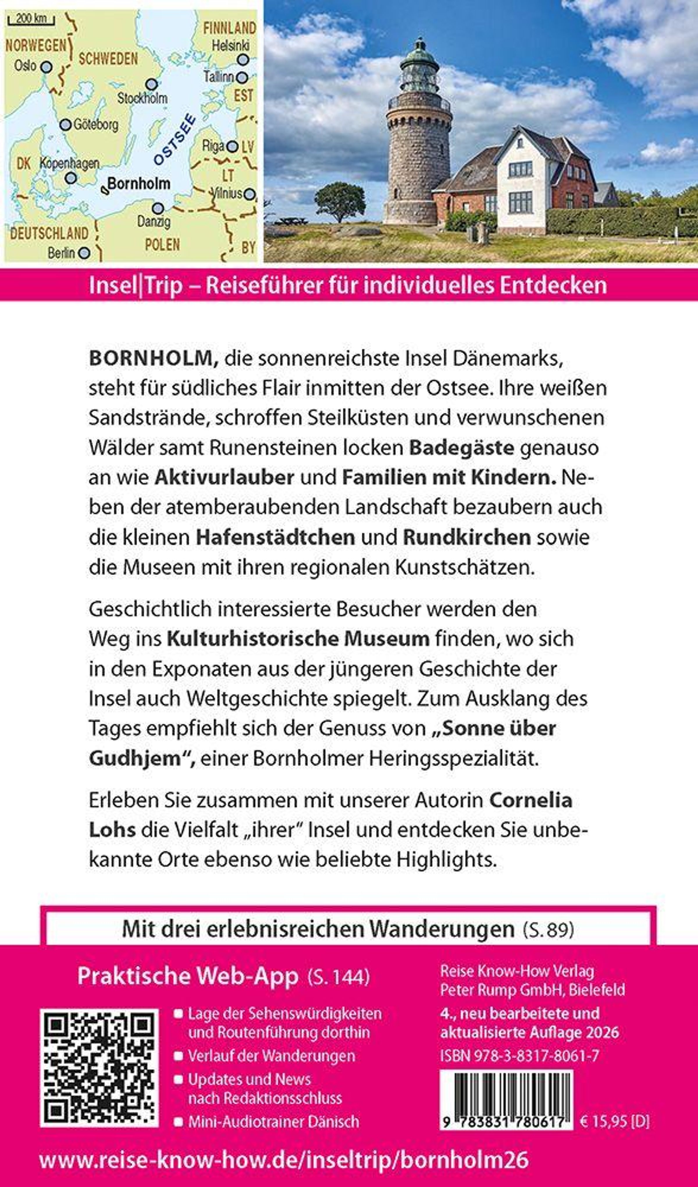 Dazu: kostenlose Web-App für Smartphone, Tablet und PC mit Inselplan- und Satellitenansichten passend zum Text, Routenführung zu allen beschriebenen Sehenswürdigkeiten und touristisch wichtigen Orten, Verlauf der Wanderungen, seitenbezogenen Updates nach Redaktionsschluss sowie einem Mini-Audiotrainer Dänisch