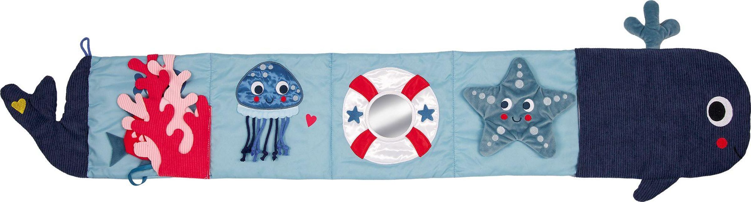 Das Activity-Kissen in Walform ist ein liebevoll gestaltetes Motorikspielzeug und zugleich Spiel- und Kuschelkissen in einem. Als weicher Begleiter unterstützt es Ihr Kind in den ersten Monaten und lädt zum Fühlen, Greifen und Entdecken ein. Spiegel, Knisterfolie sowie weicher Cord und kuscheliger Nicki-Velours fördern die sensorische Entwicklung und sorgen für abwechslungsreichen Spielspaß. Ein hochwertiges Stoffspielzeug für Babys ab 6 Monaten - auch ideal als Geschenk zur Geburt.