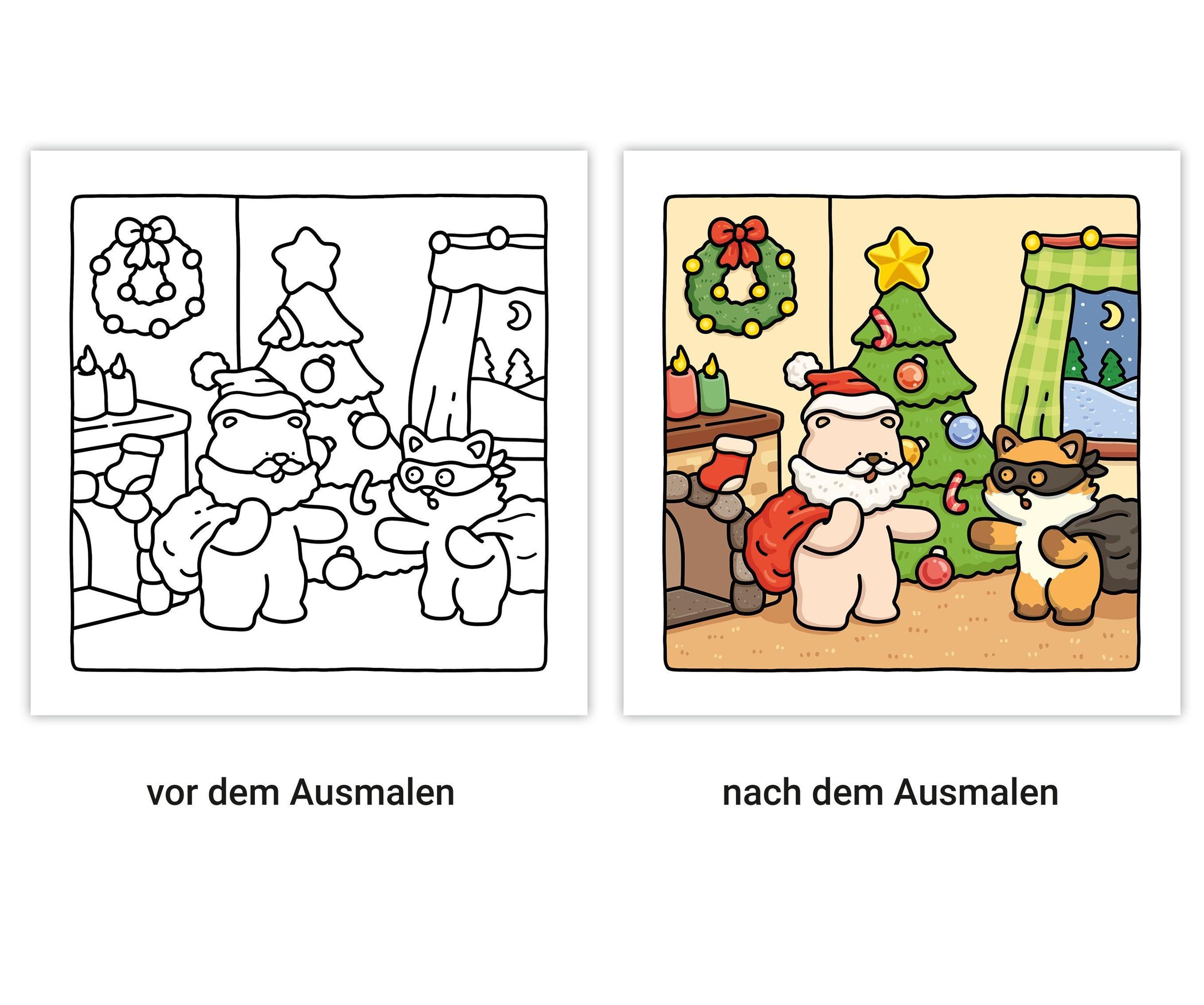 "SILLY CRIMES. COZY COLORING. HIKARU KOTZ." Zwei Tiere mit Masken knacken einen Tresor in einem humorvollen Cartoon-Stil., Buch