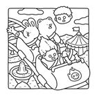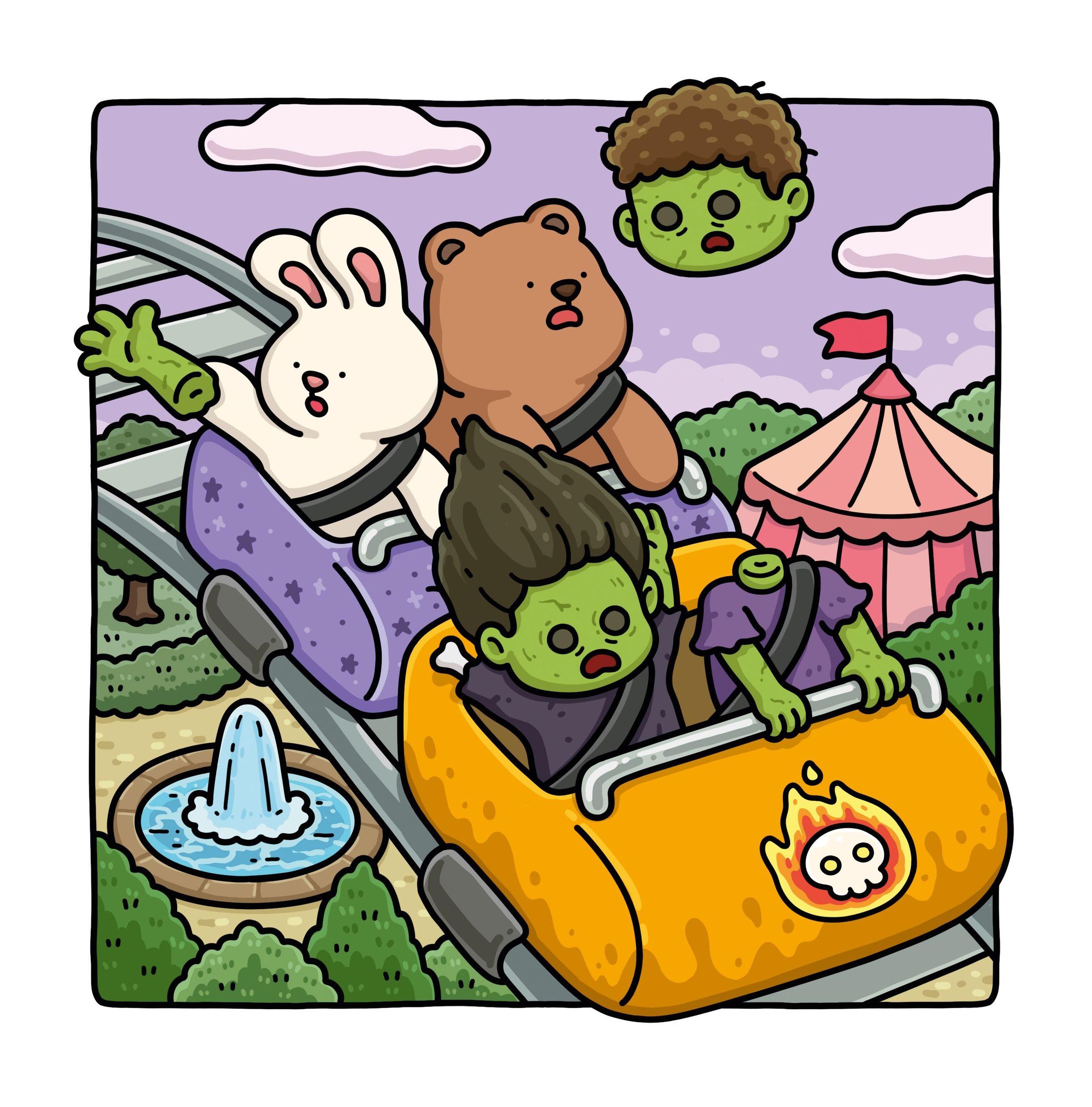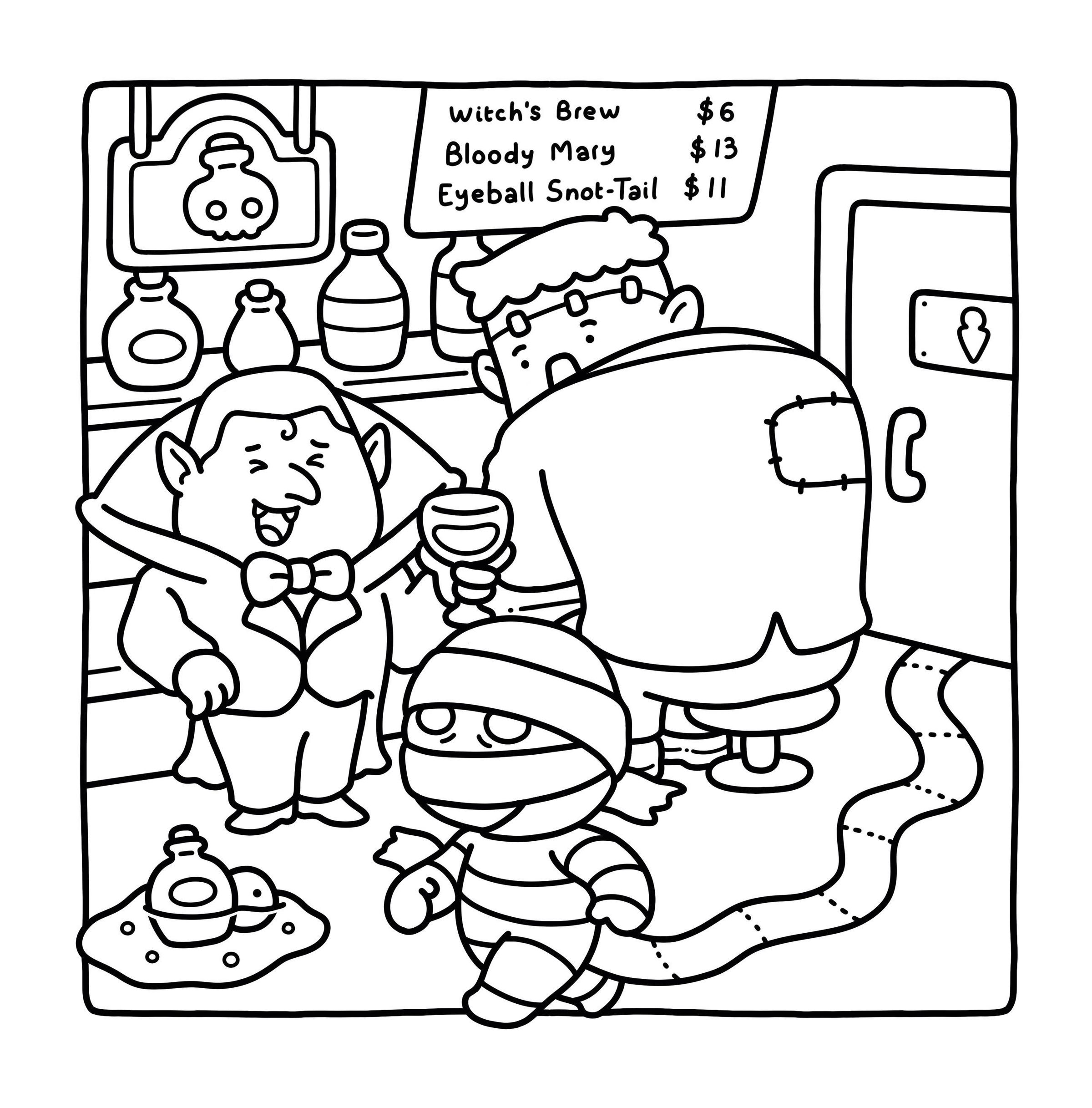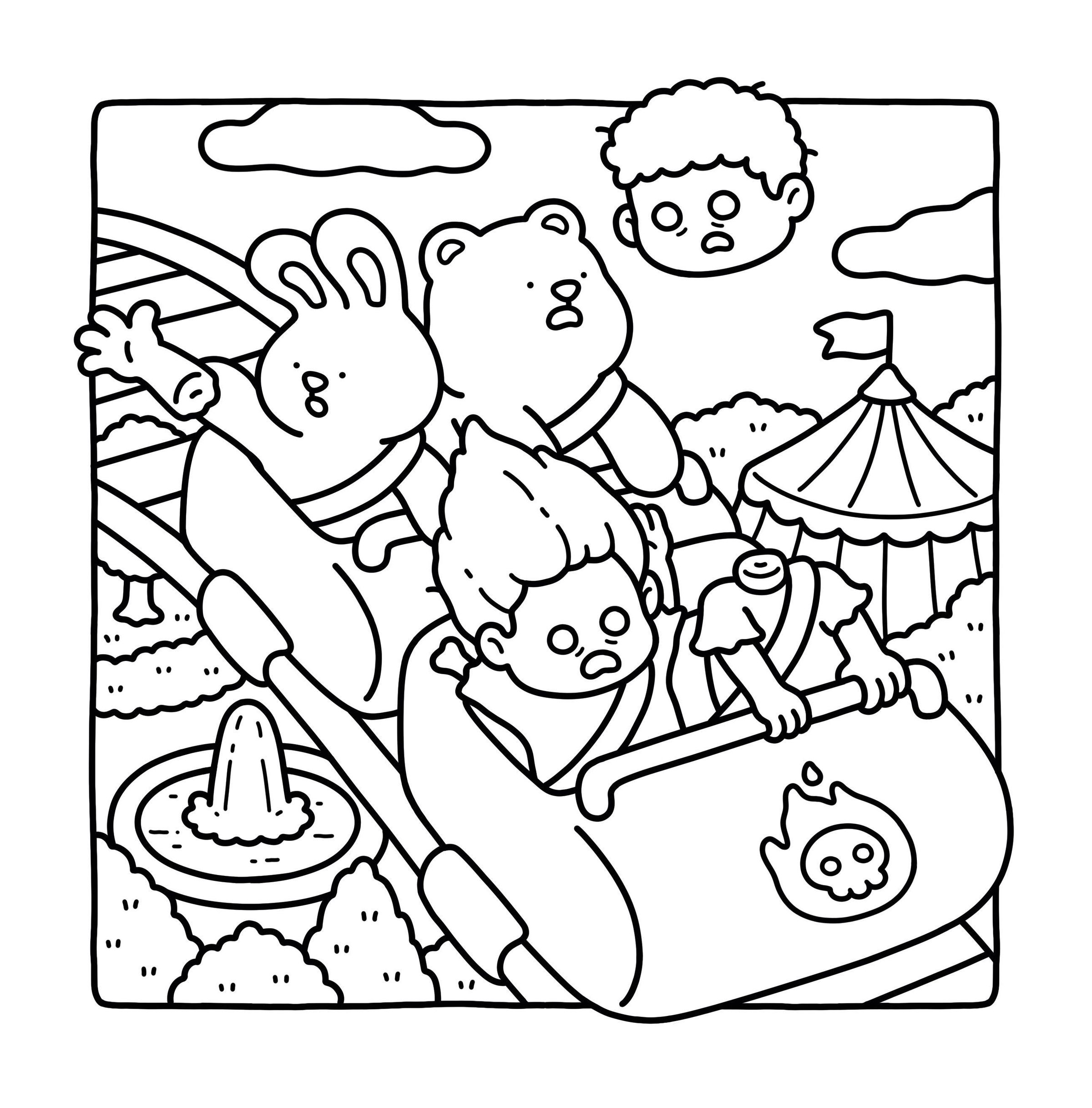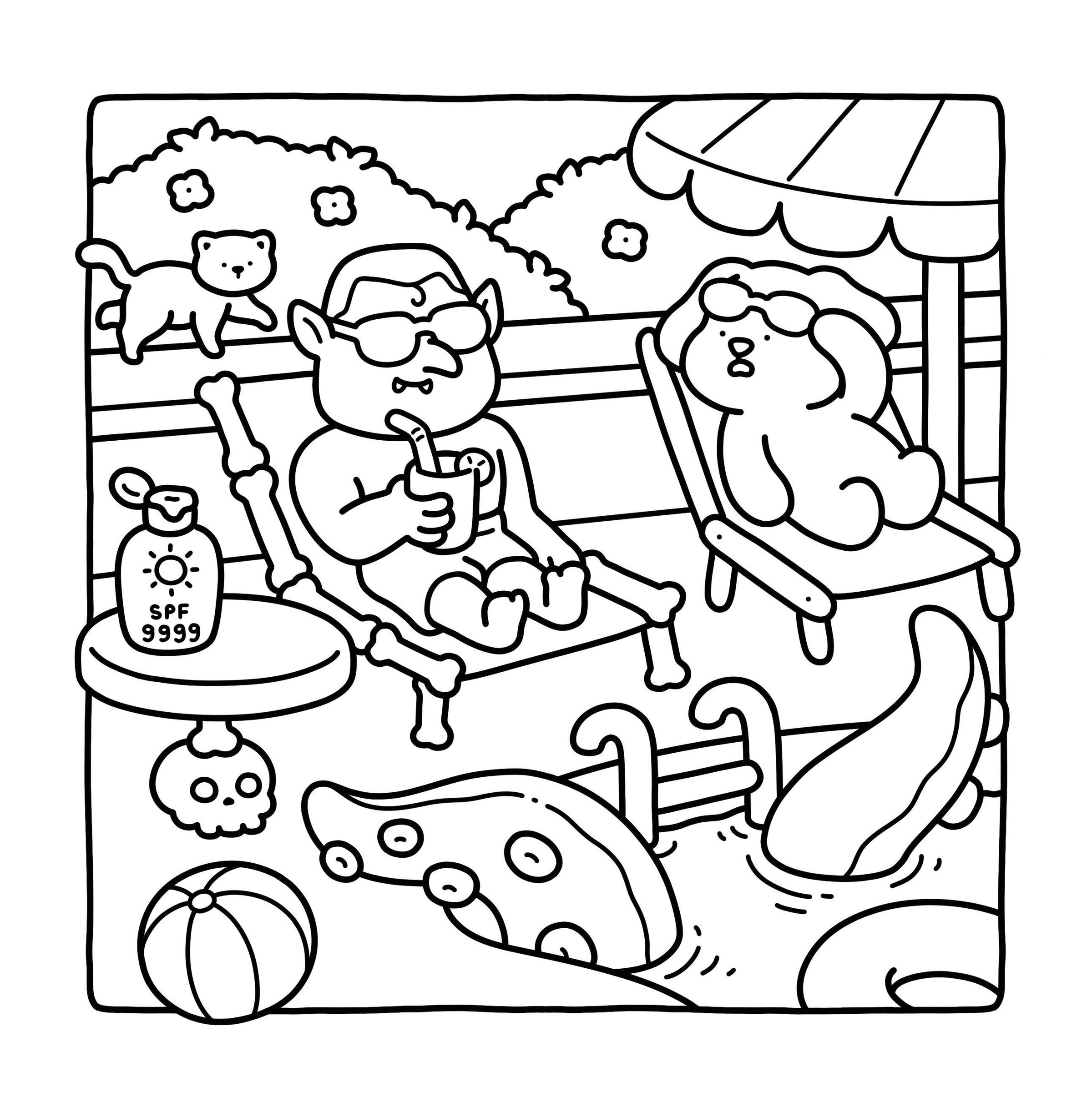"SILLY SPOOKY COZY COLORING, HIKARU KOTZ." Eine Illustration mit Kaninchen, Skelett und lila Auto auf der Straße., Buch