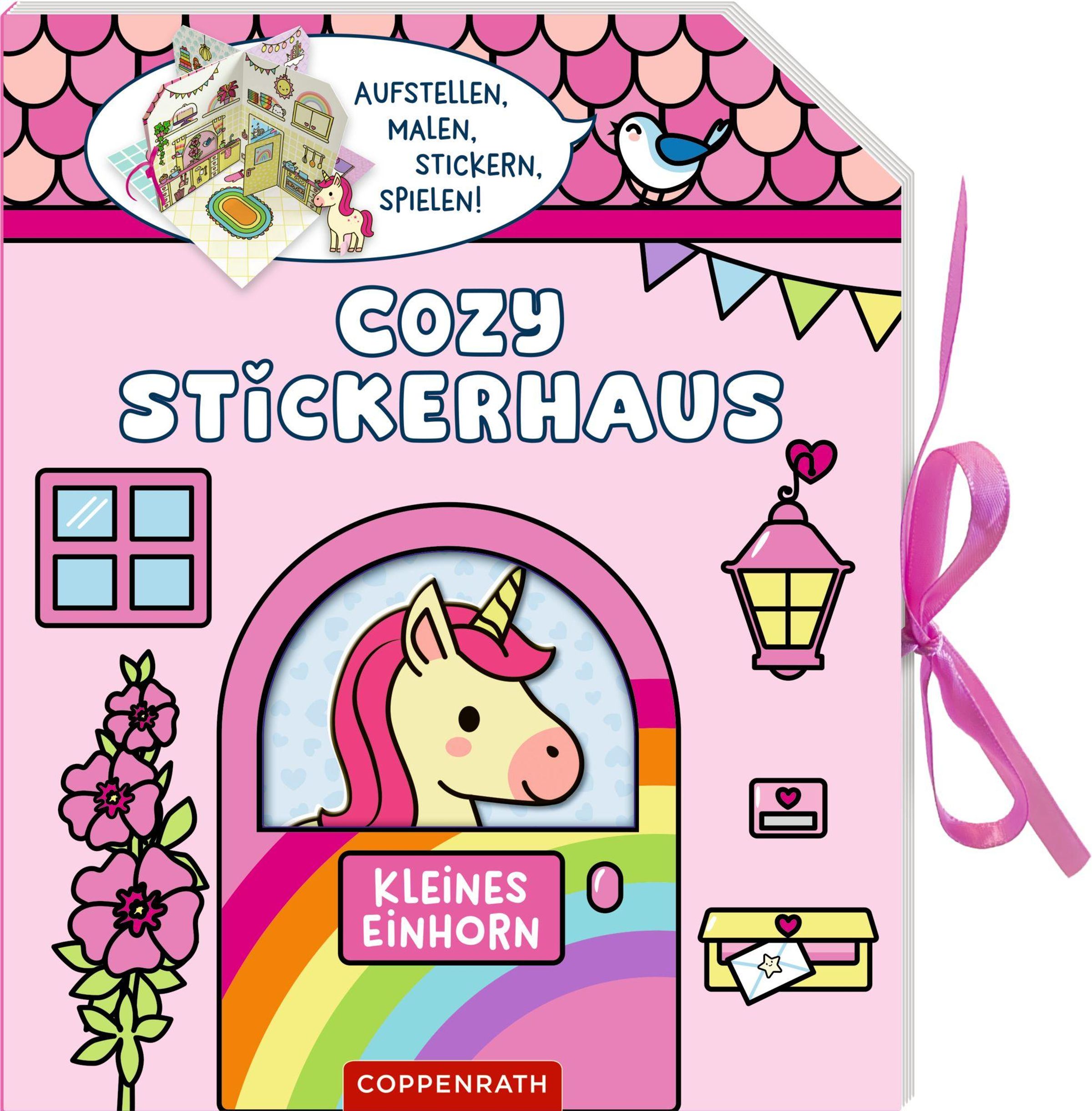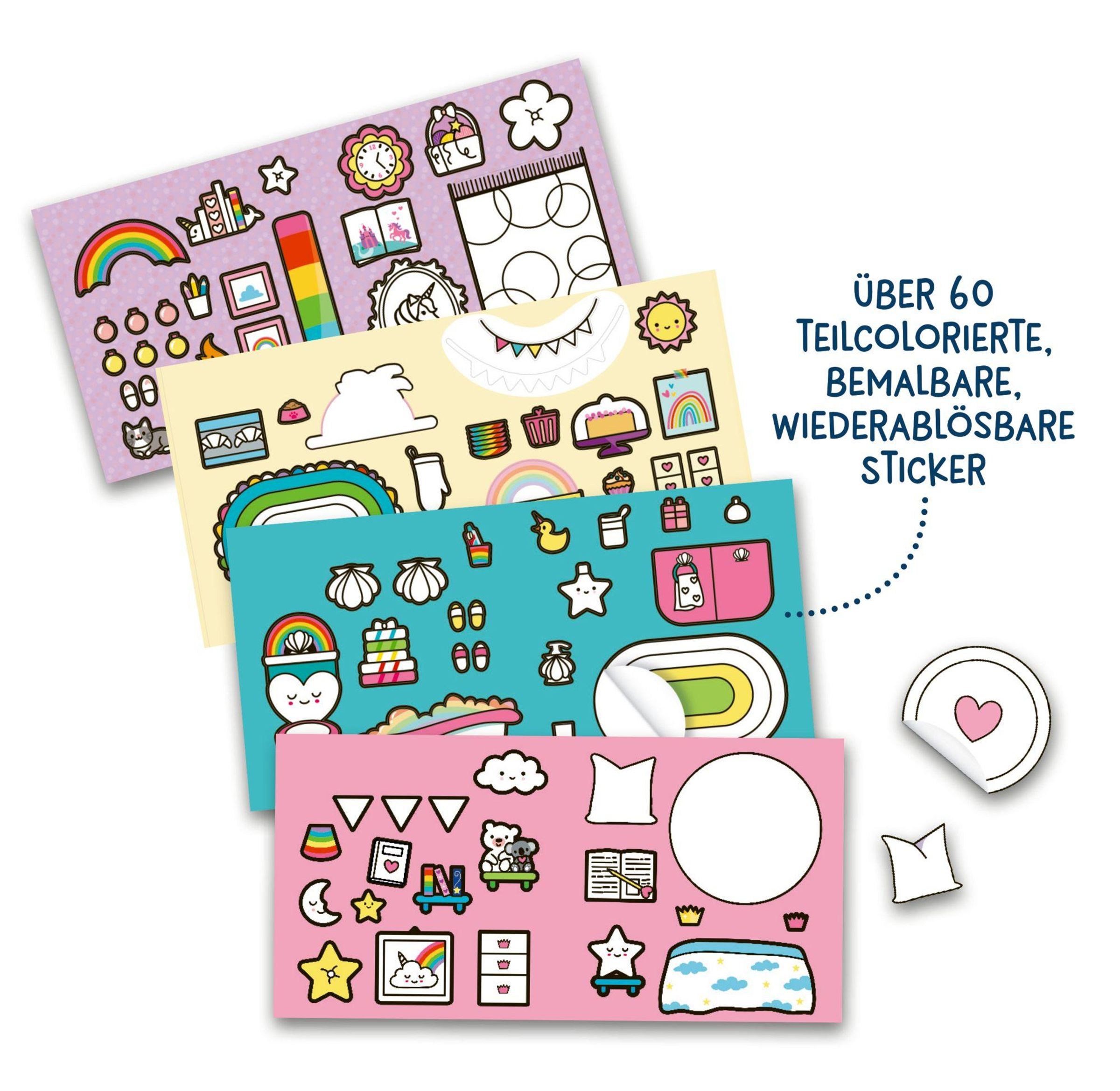 Ein kreatives Stickerhaus zum Gestalten und Spielen · Ausklappbares Haus mit 4 Zimmern und liebevollen Details · Über 60 bemalbare, wiederablösbare Sticker · Mit Einhorn-Spielfigur, 2 Türen und 1 Fenster · Kreatives Spiel- und Bastelset für Kinder ab 4 Jahren Dieses Cozy Stickerhaus verbindet Ausmalen, Stickern und fantasievolles Spielen. Mit 60 bemalbaren Stickern, einer Einhorn-Figur, zwei Türen und einem Fenster können Kinder Küche, Bad, Wohn- und Schlafzimmer nach eigenen Ideen gestalten oder sich an den Beispielbildern orientieren. Kurze Vorlesetexte entführen in die gemütliche, regenbogenbunte Welt des kleinen Einhorns. Ein wundervolles Geschenk zum Basteln, Lesen und Spielen für Kinder ab 4 Jahren.